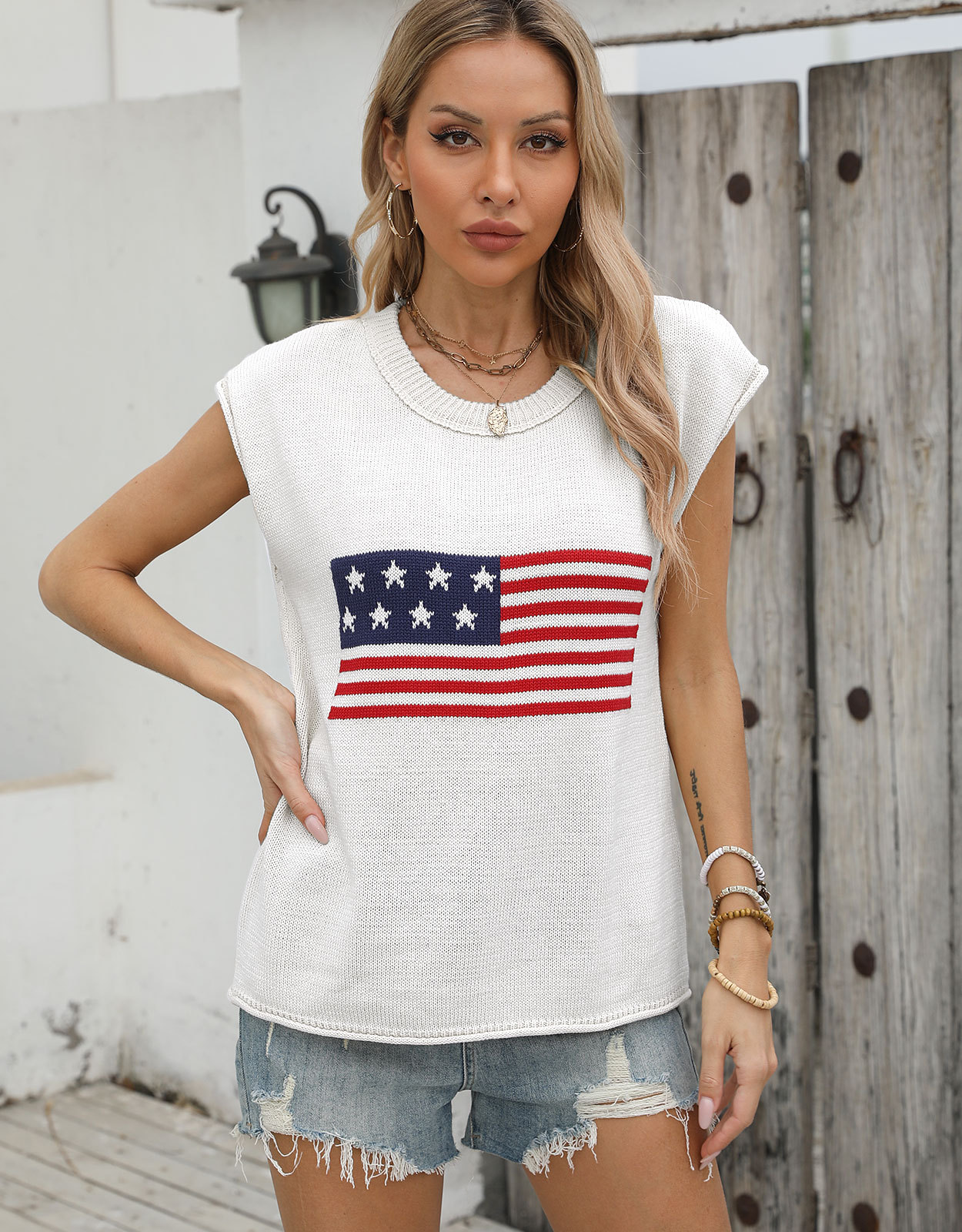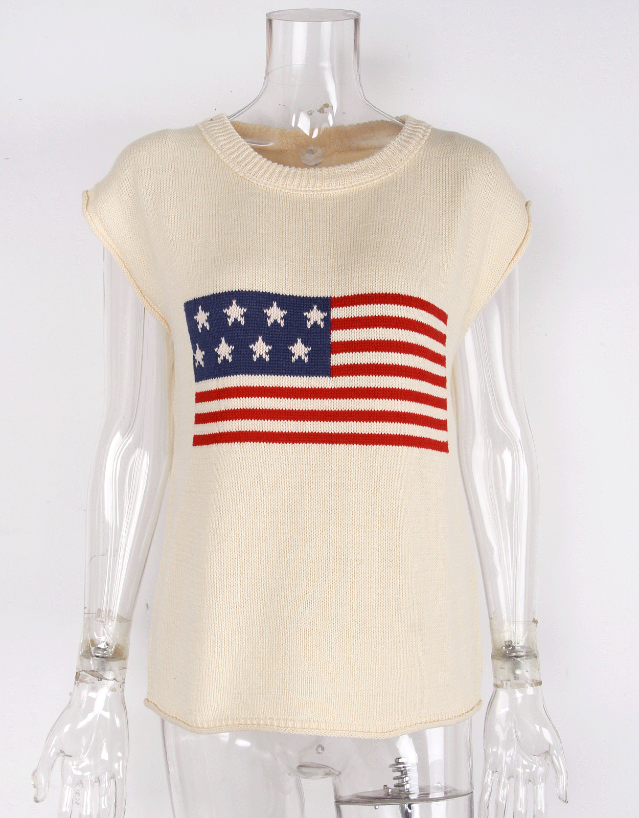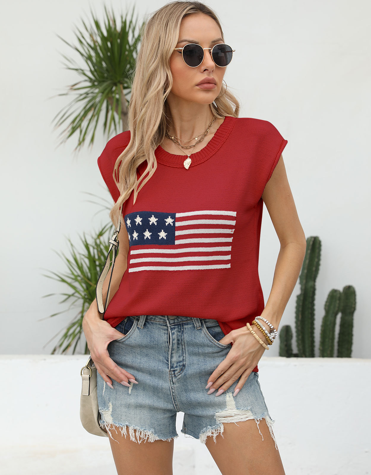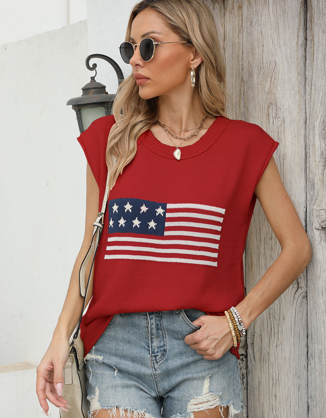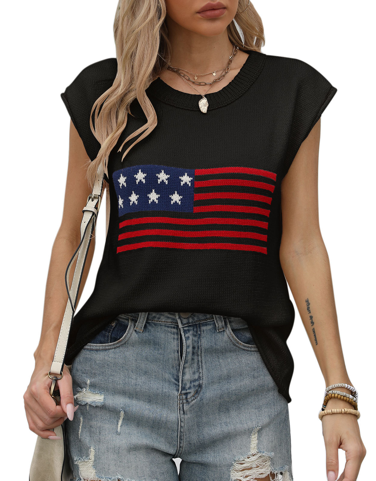 가을 새로운 아마존 뜨거운 독립 기념일 크루 넥 국기 유럽과 미국의 단색 스웨터 패션 여성용 짧은 소매 스웨터