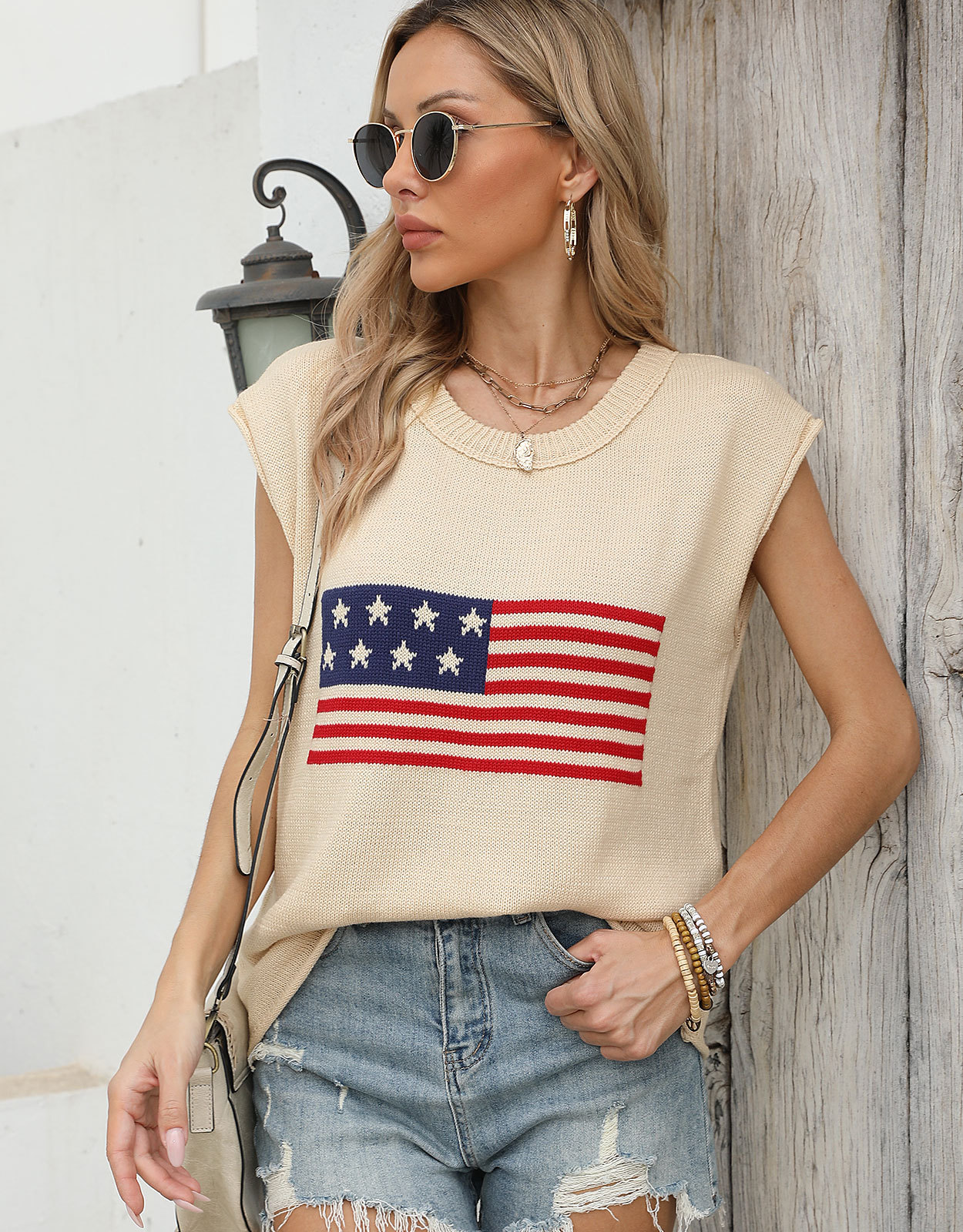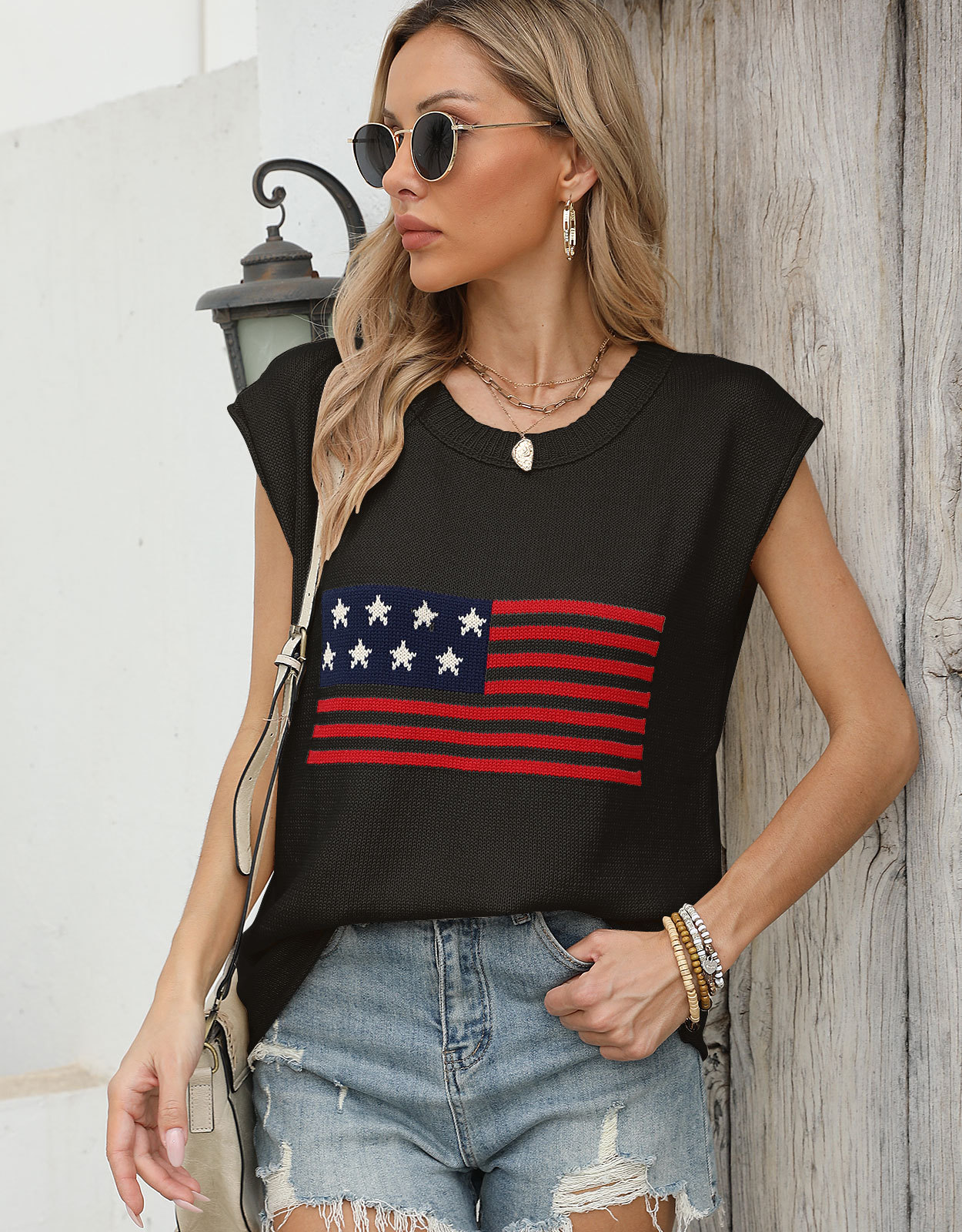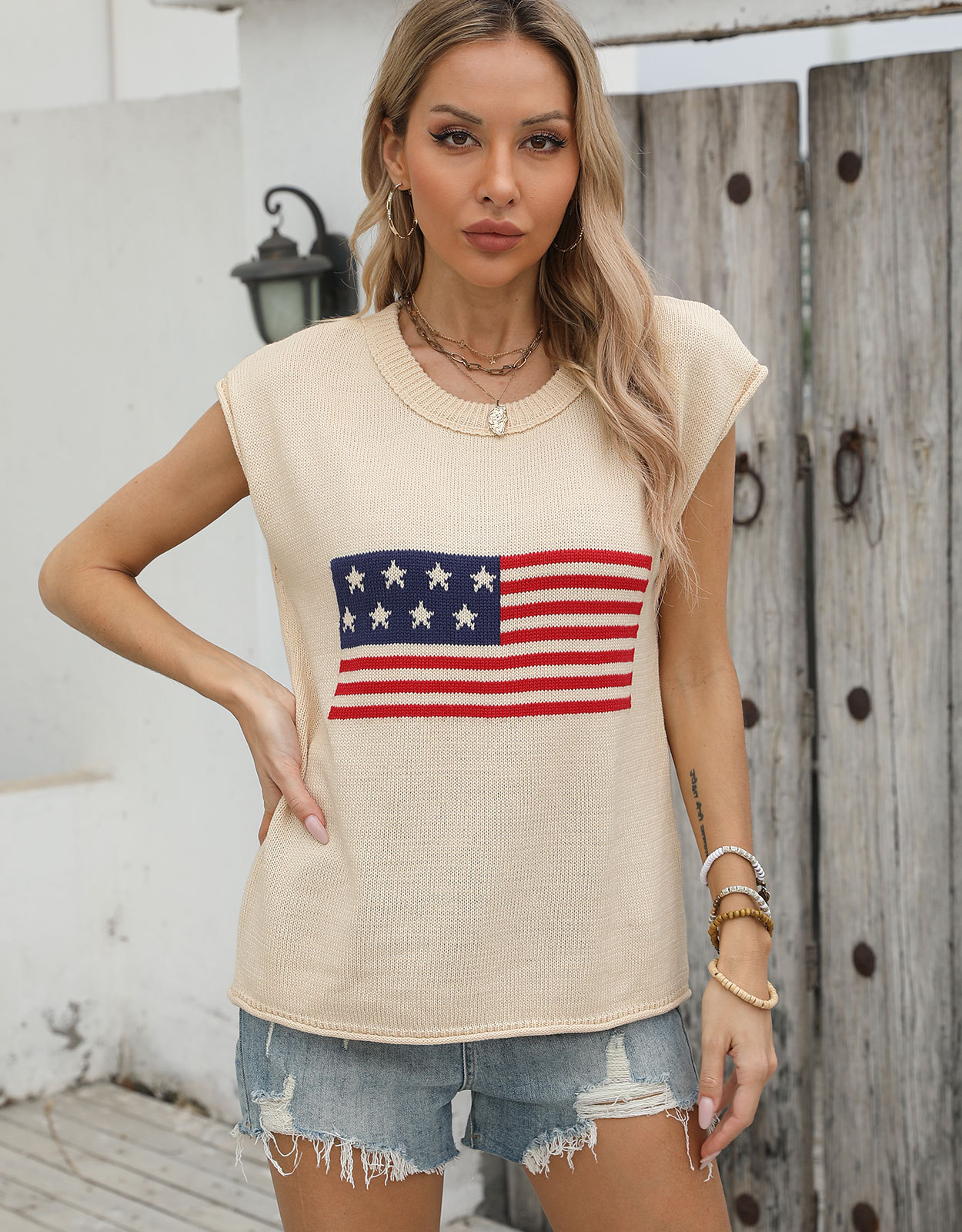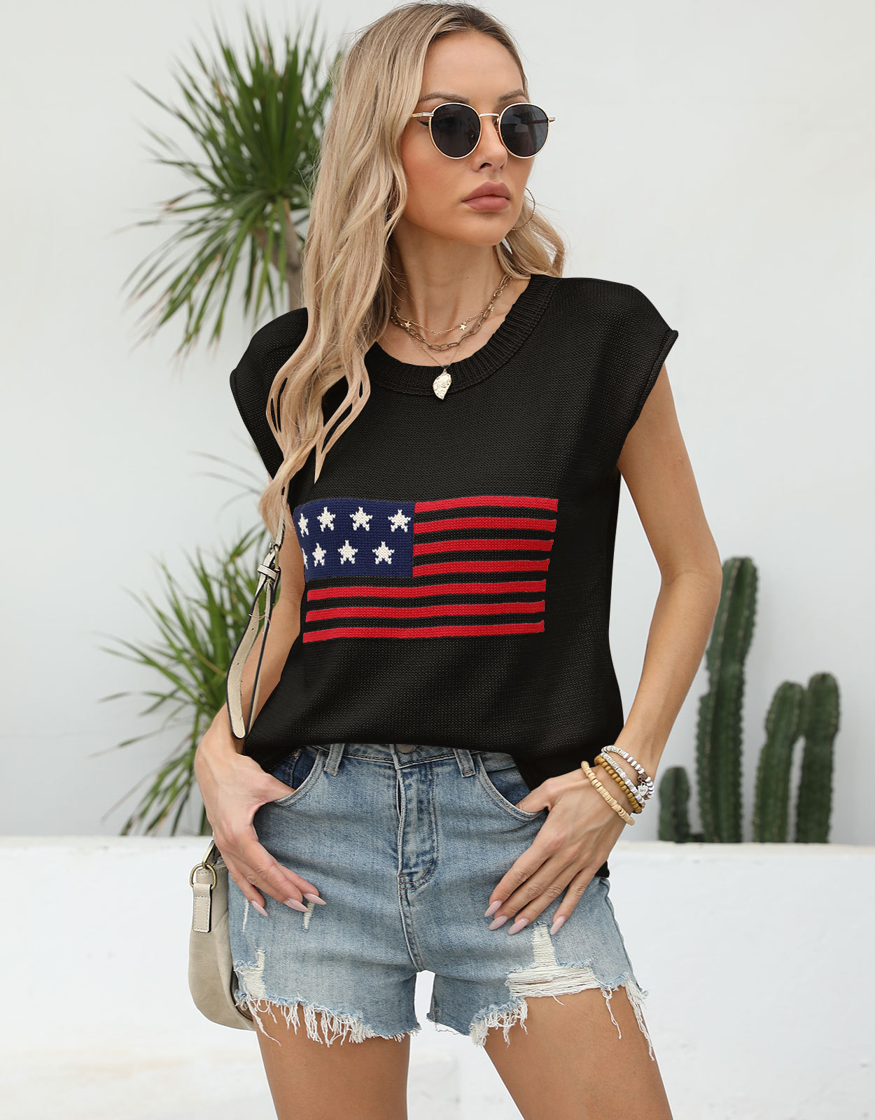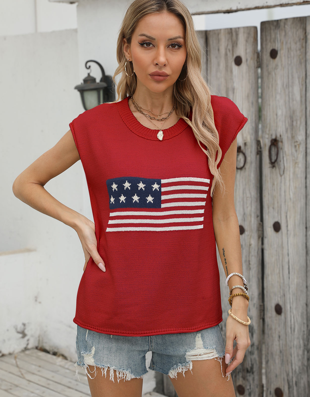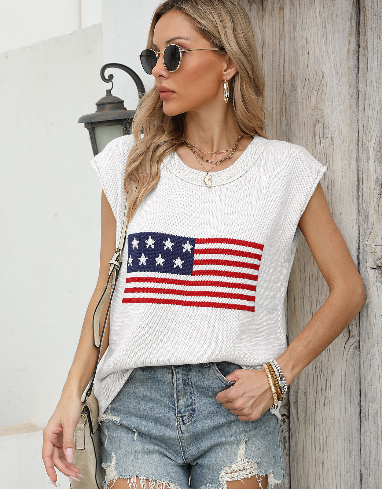 가을 새로운 아마존 뜨거운 독립 기념일 크루 넥 국기 유럽과 미국의 단색 스웨터 패션 여성용 짧은 소매 스웨터
