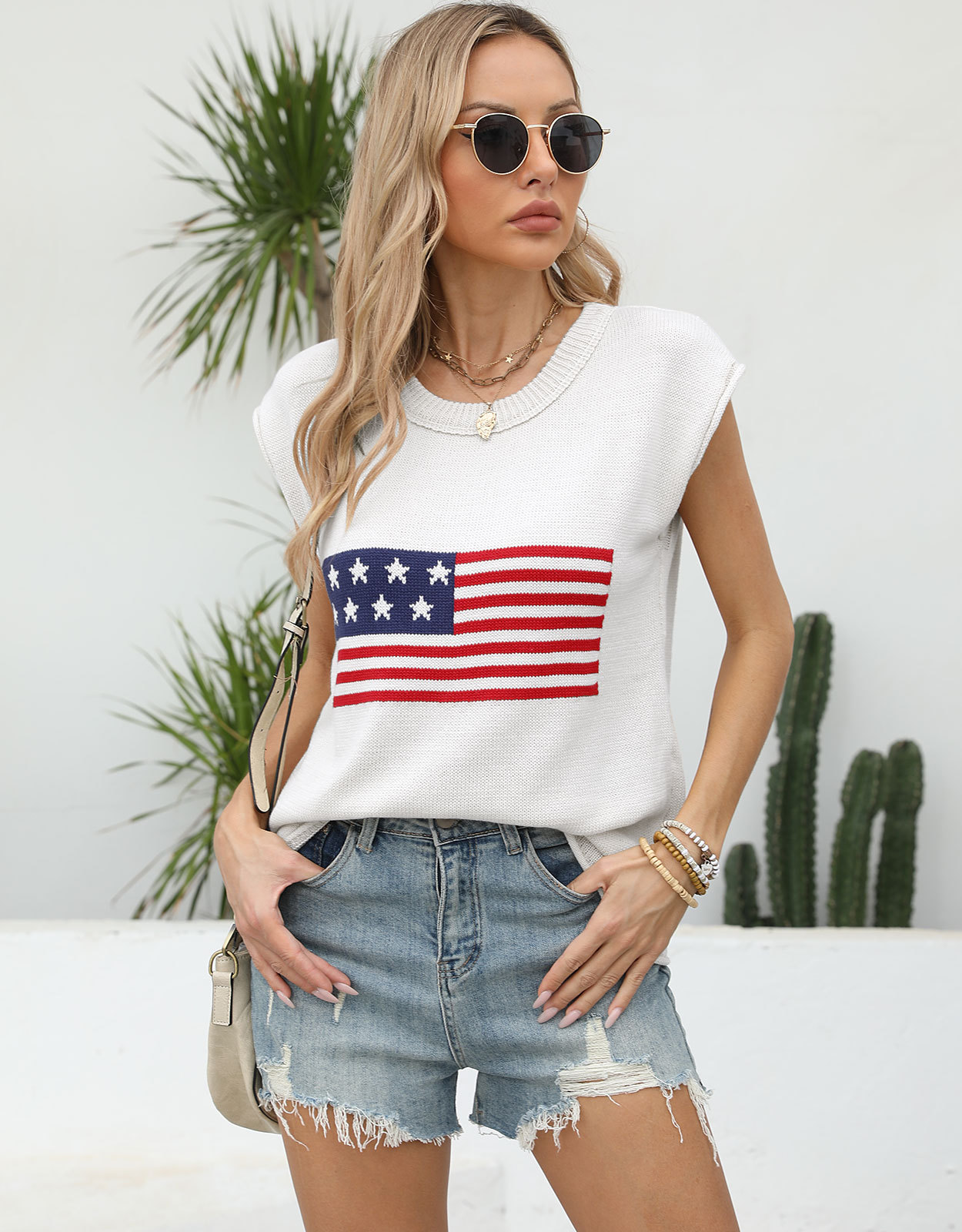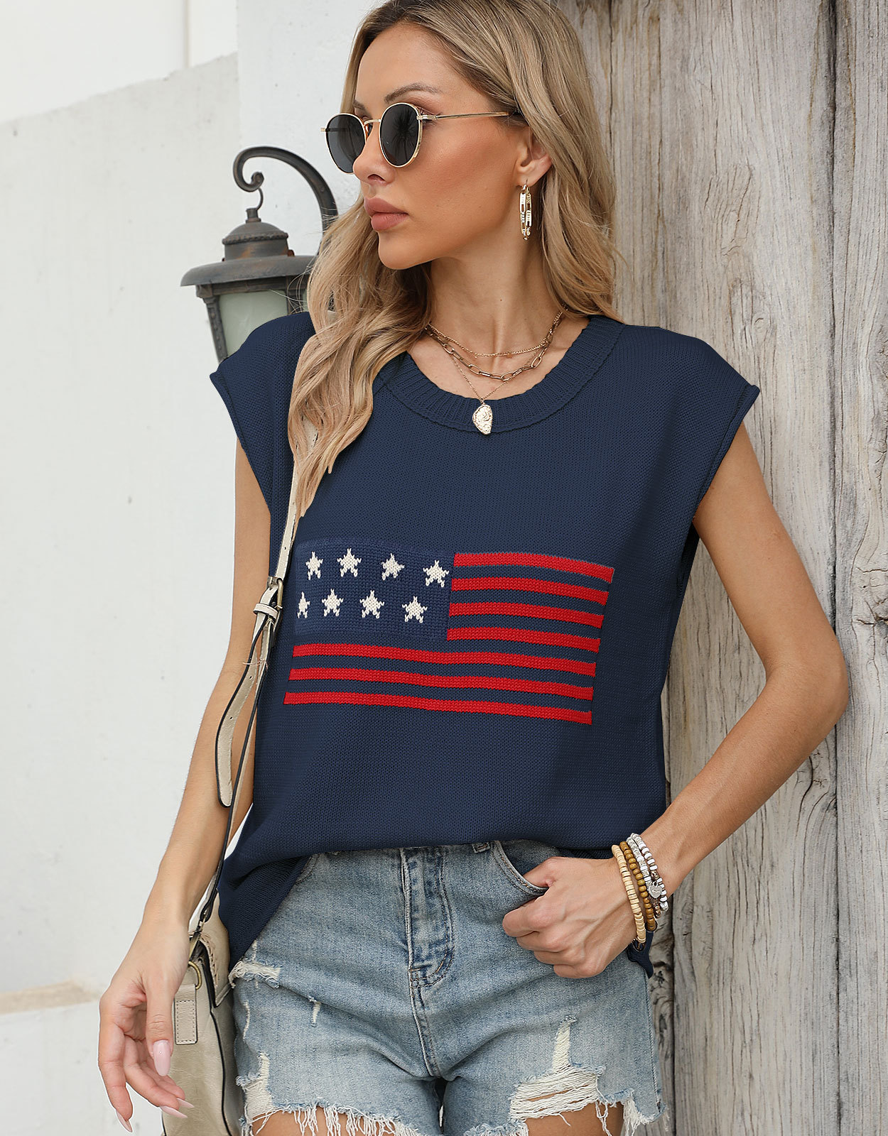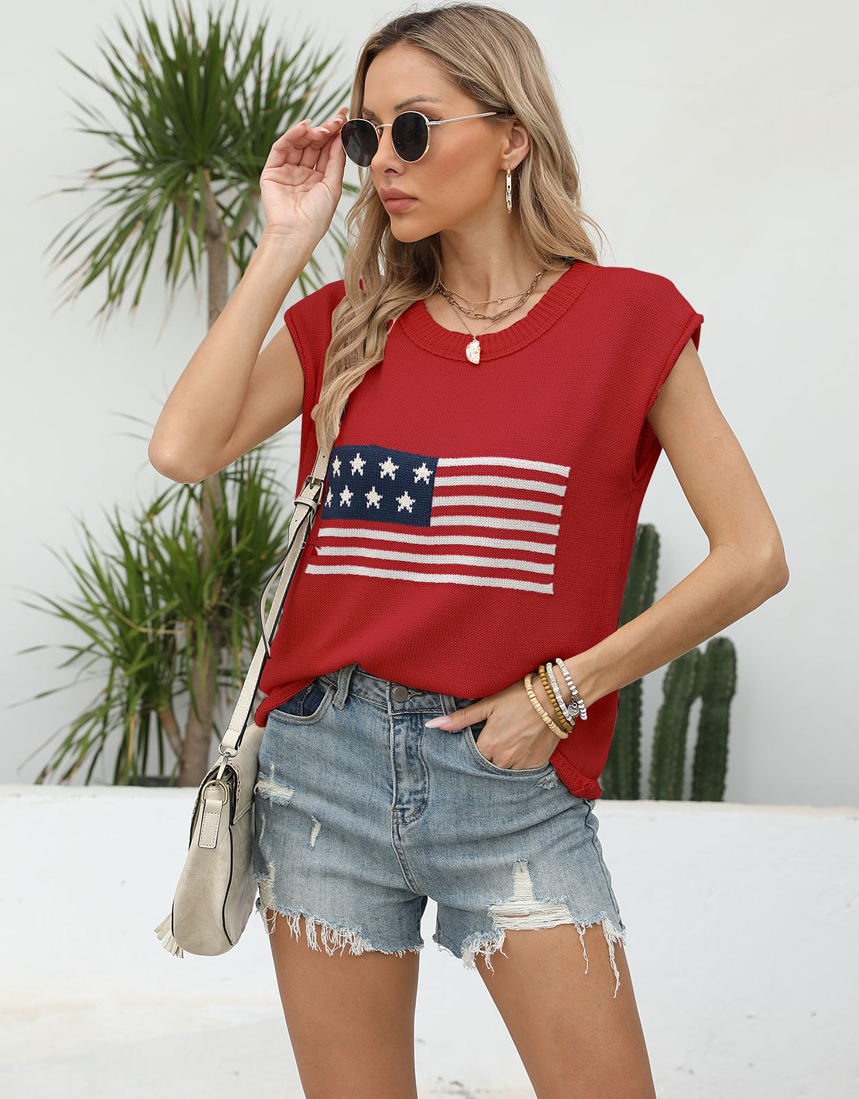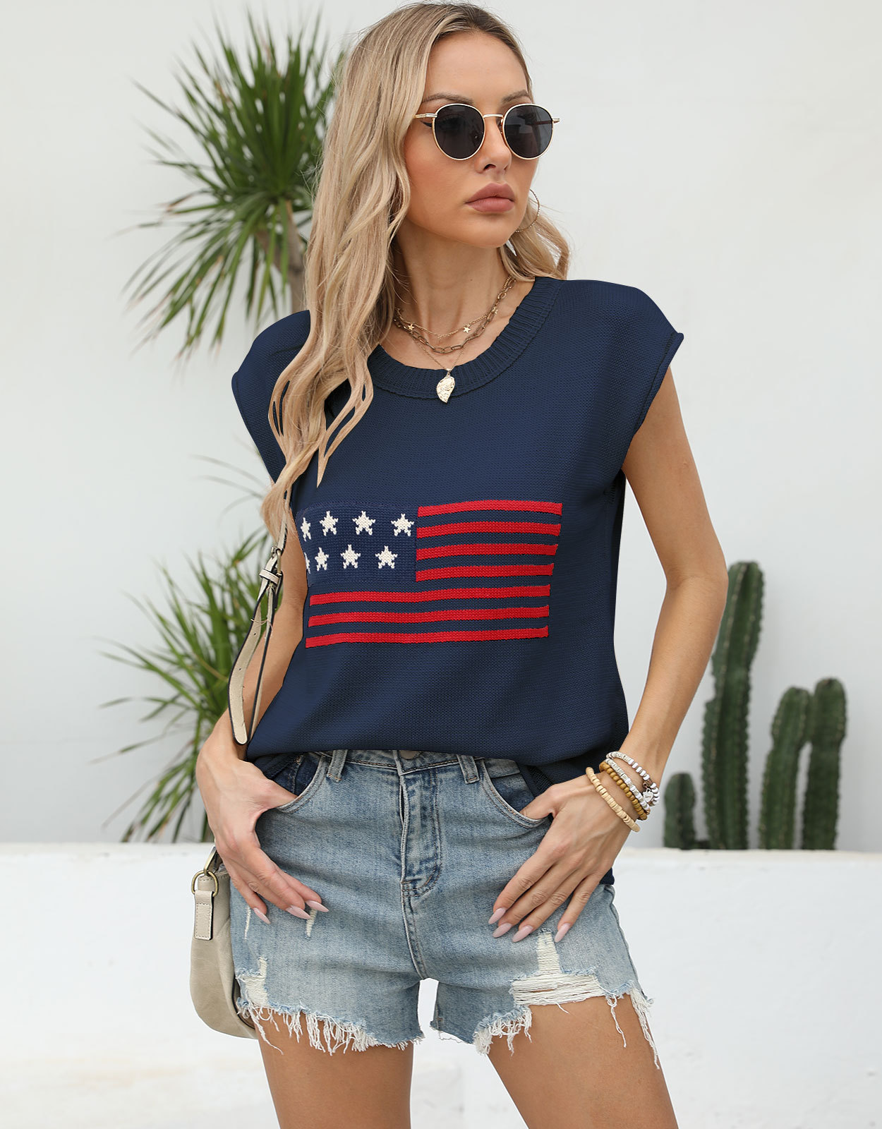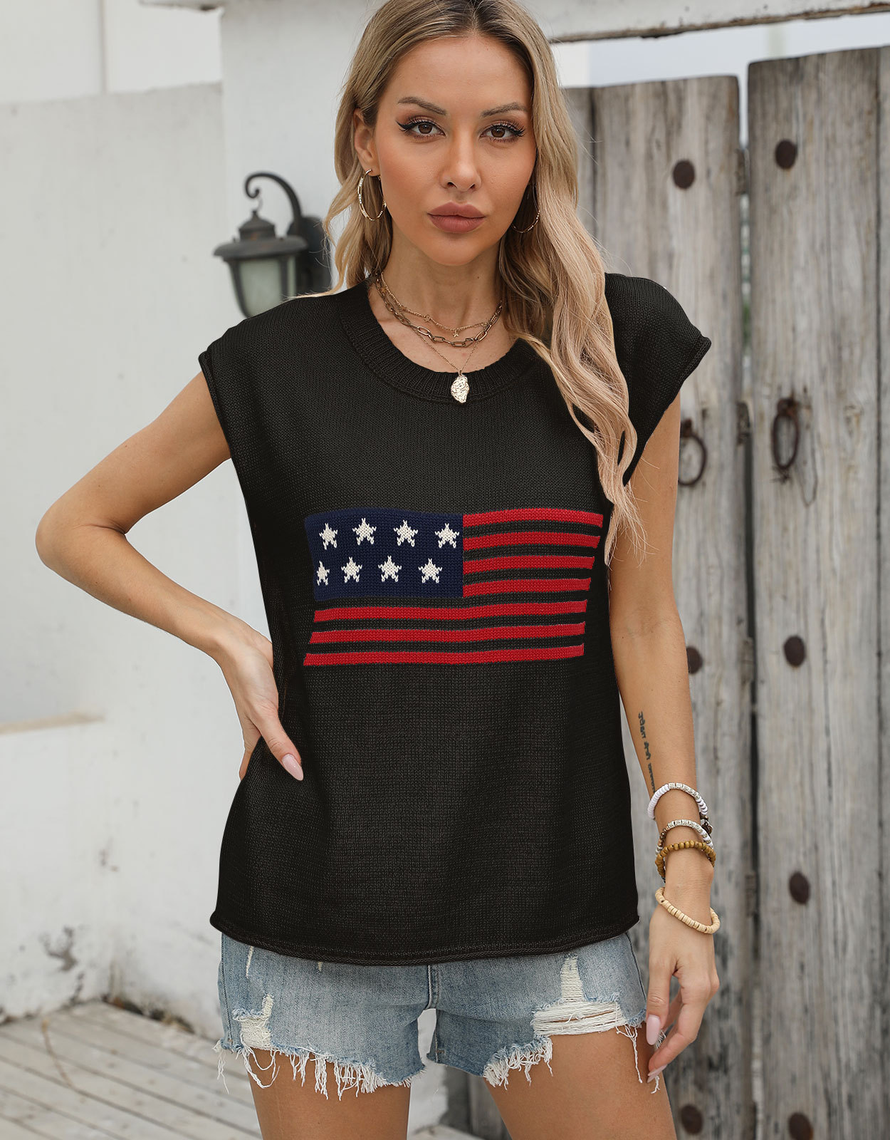 가을 새로운 아마존 뜨거운 독립 기념일 크루 넥 국기 유럽과 미국의 단색 스웨터 패션 여성용 짧은 소매 스웨터