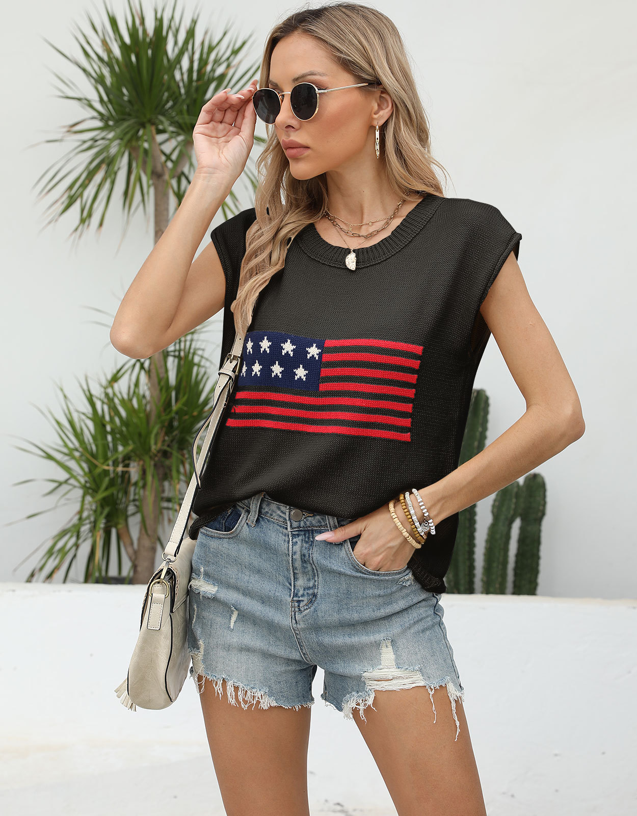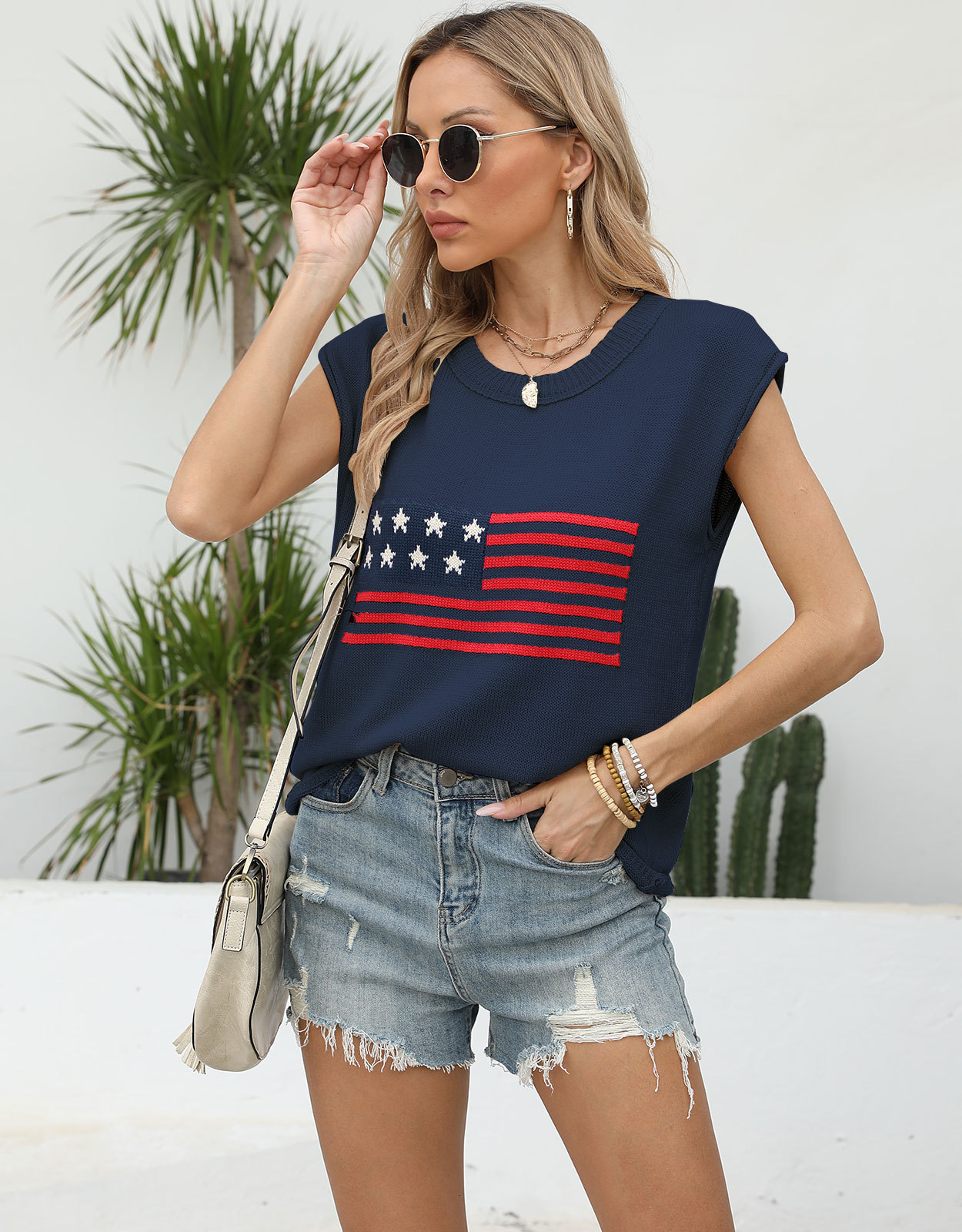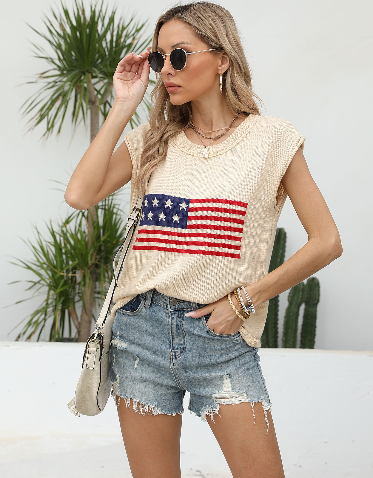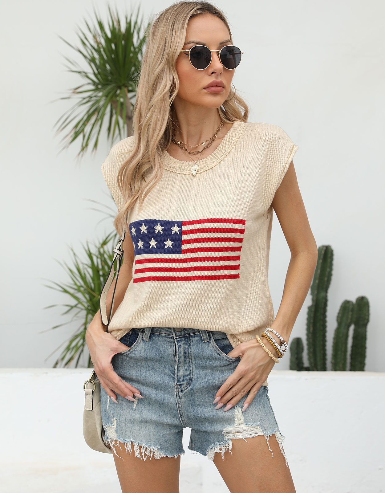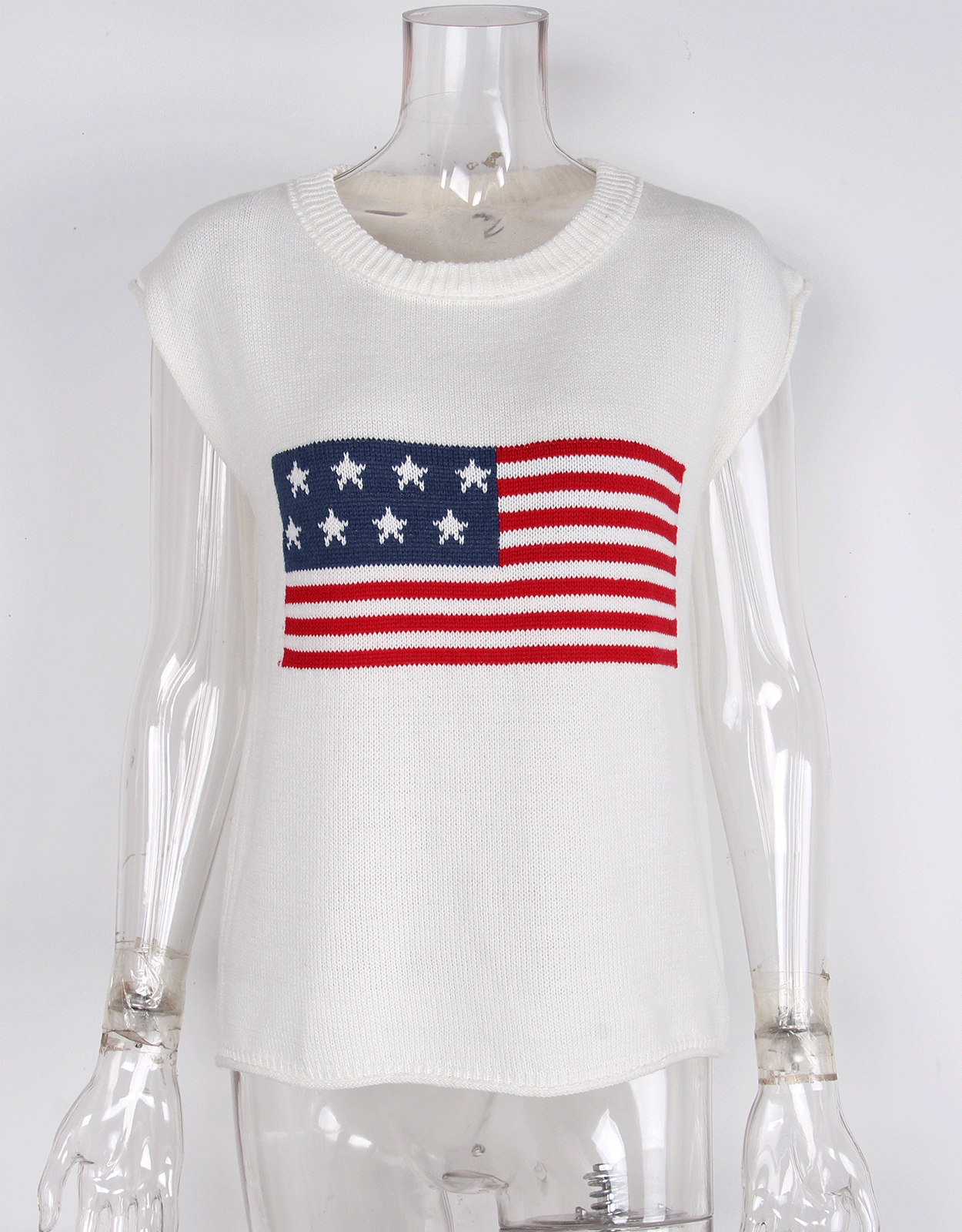 가을 새로운 아마존 뜨거운 독립 기념일 크루 넥 국기 유럽과 미국의 단색 스웨터 패션 여성용 짧은 소매 스웨터