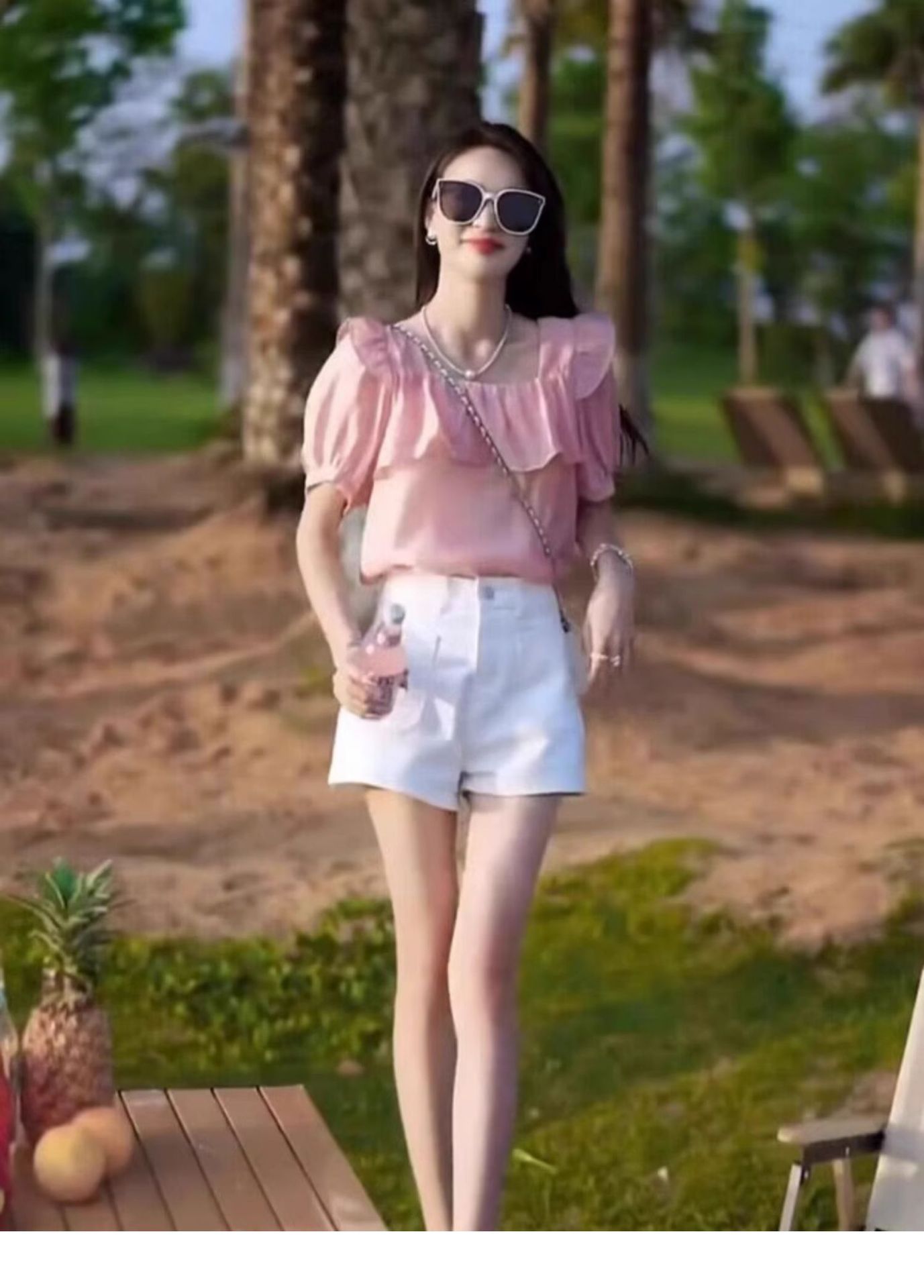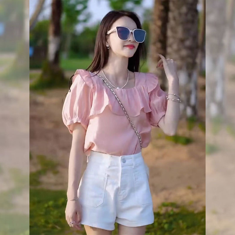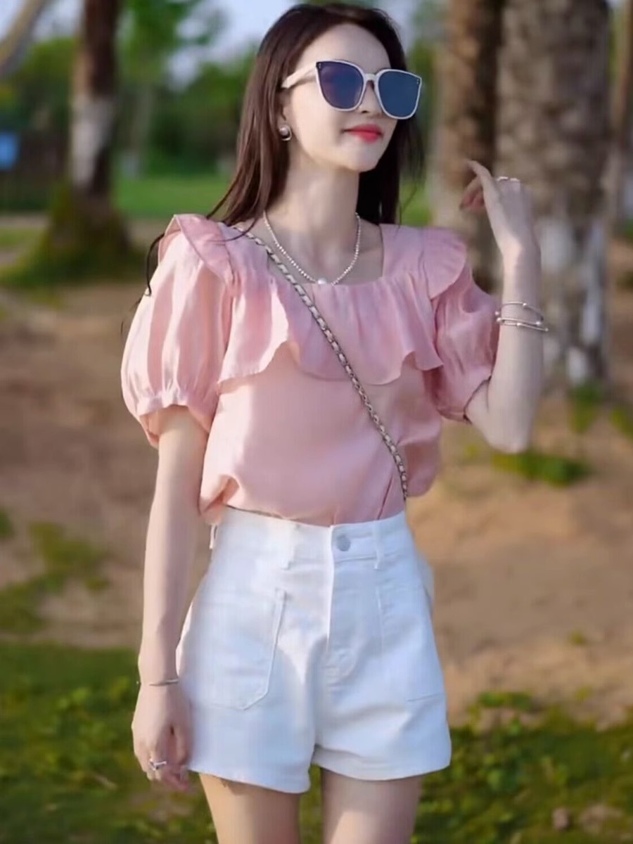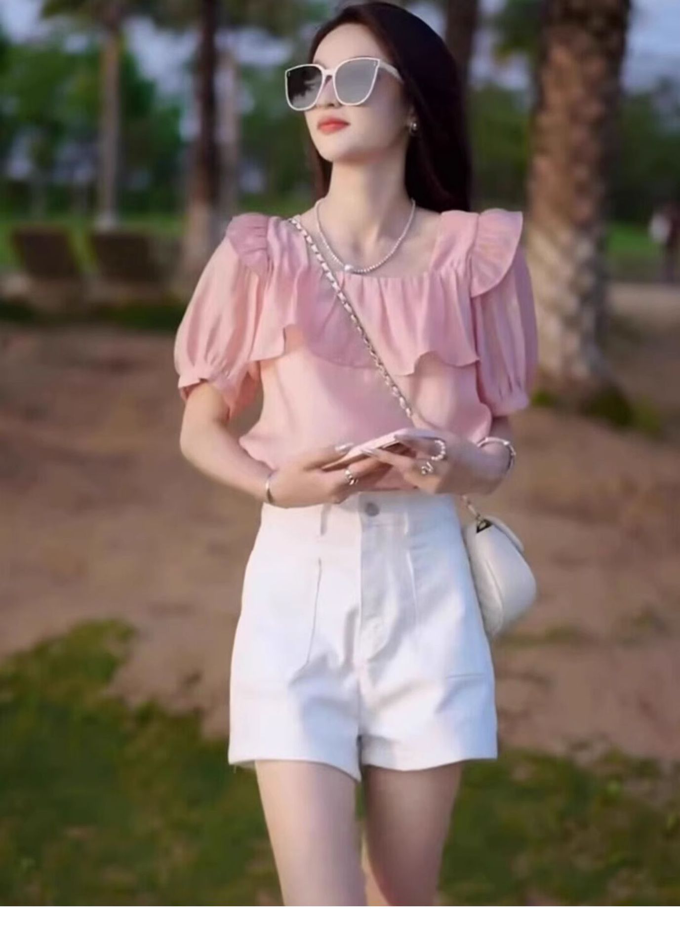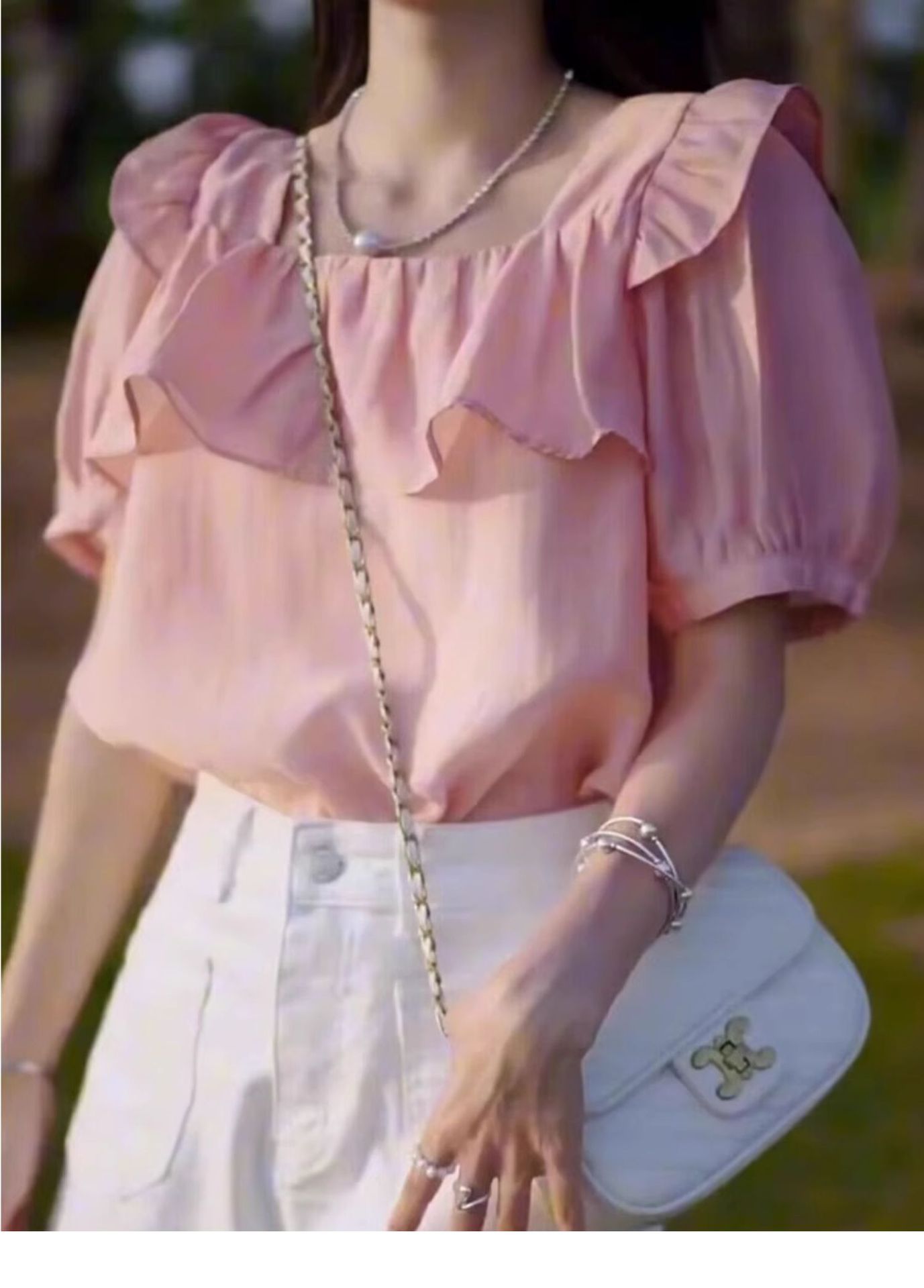 2024 인기있는 예쁜 셔츠 핑크 버블 반팔 쉬폰 셔츠 여성 여름 착용 신선하고 달콤한 스퀘어 넥 탑스토어 가기