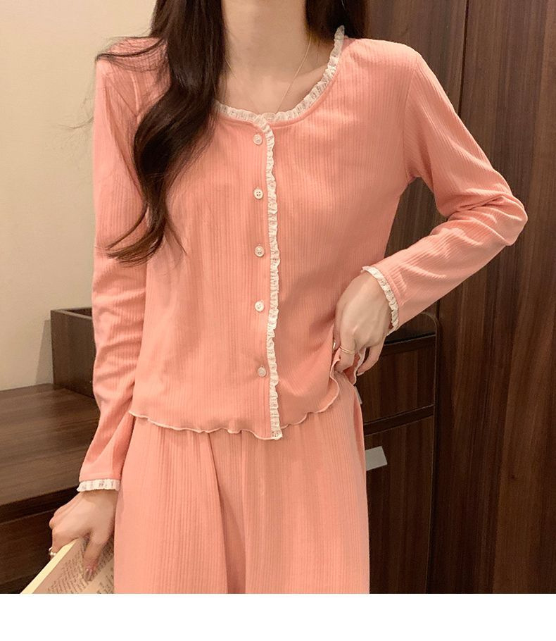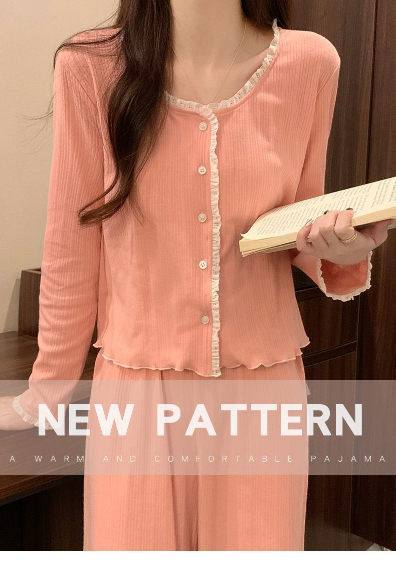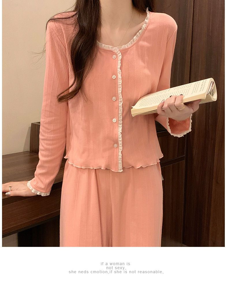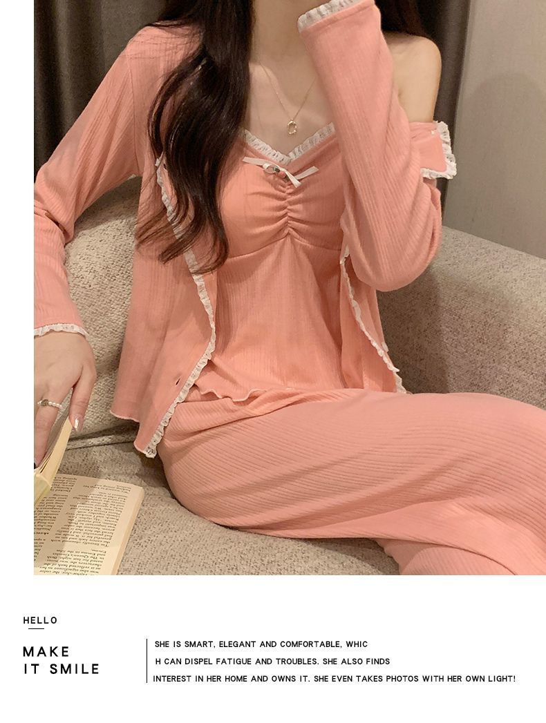 2024 새로운 긴팔 잠옷 여성의 봄과 가을 시즌 모방 면 순수한 욕망 섹시한 꽃 3 피스 세트 가슴 패드