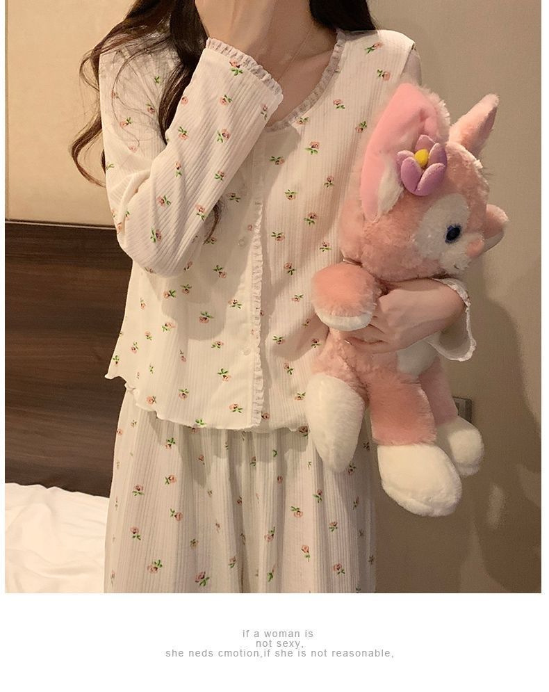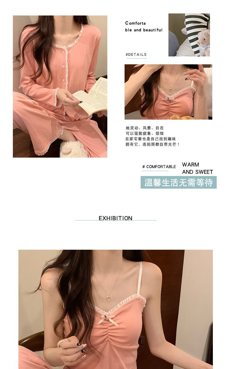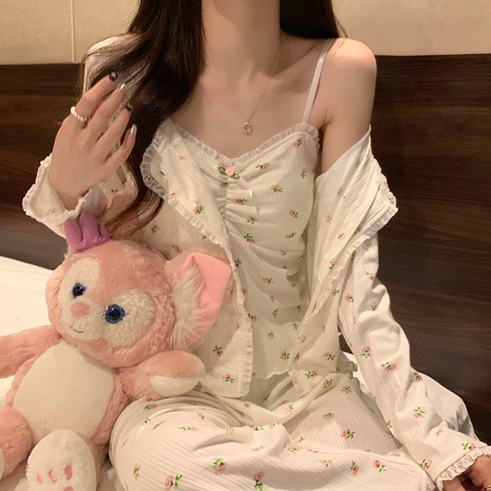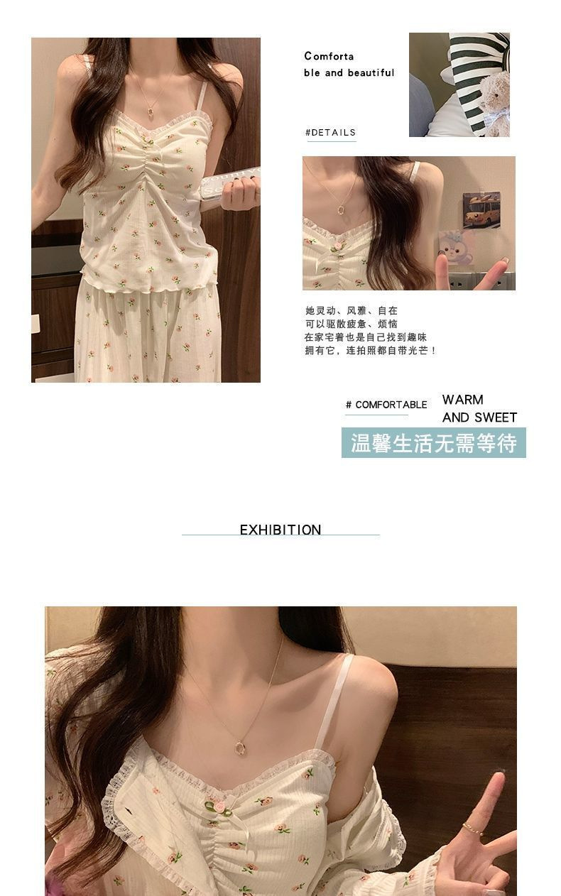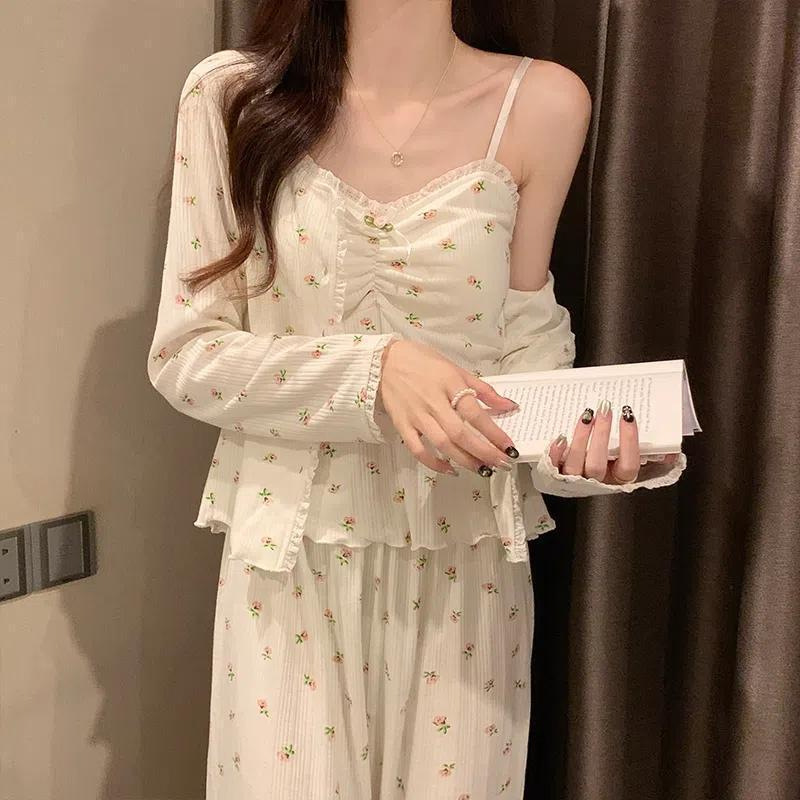 2024 새로운 긴팔 잠옷 여성의 봄과 가을 시즌 모방 면 순수한 욕망 섹시한 꽃 3 피스 세트 가슴 패드스토어 가기