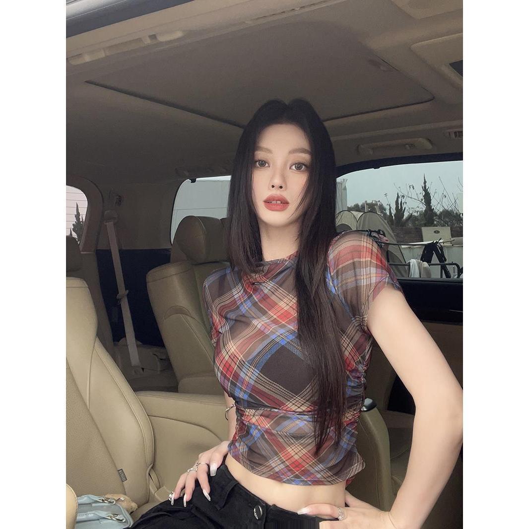 빈티지 격자 무늬 크루 넥 반팔 어깨 티셔츠 여성 여름 2024 새로운 달콤한 스파이스 소녀 꽉 슬림 탑스토어 가기