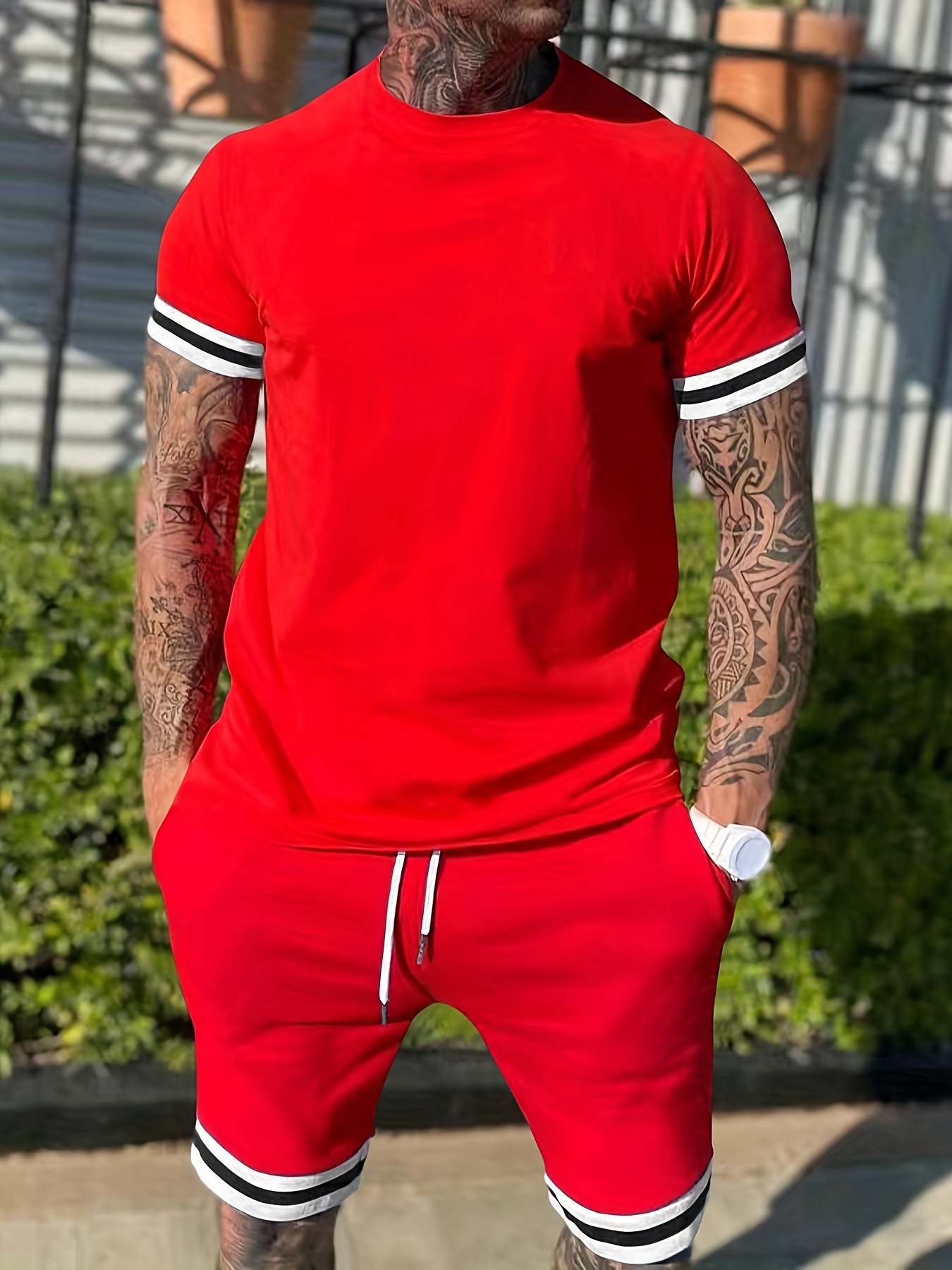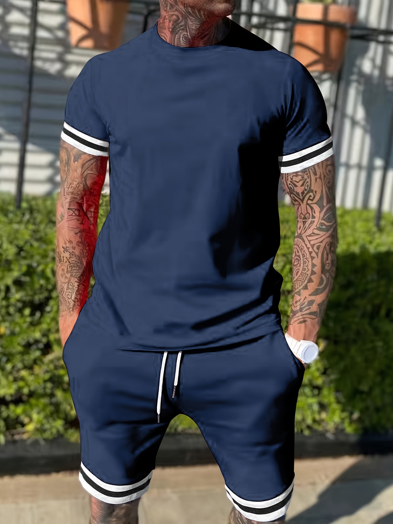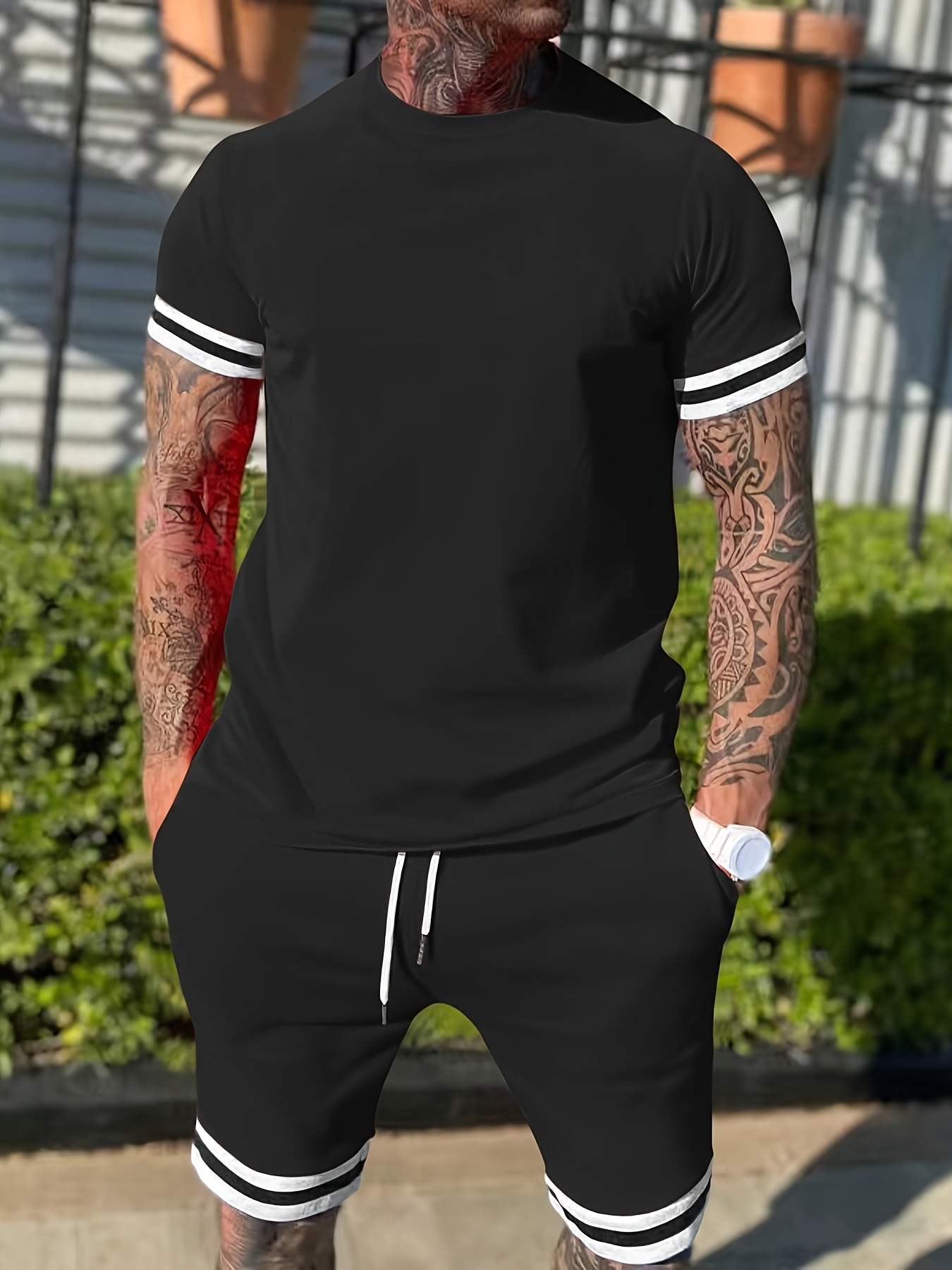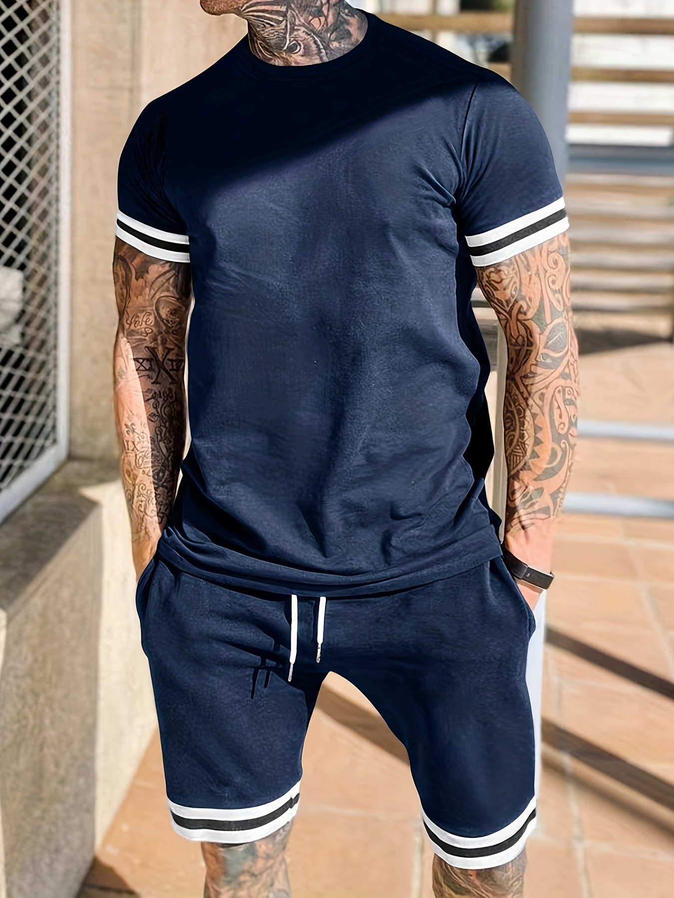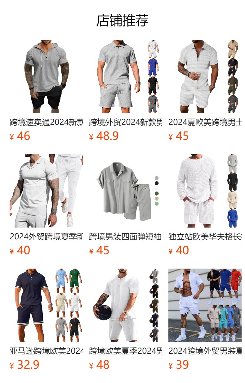 크로스보더 남성복 유럽 및 미국 여름 남성 반팔 티셔츠 라운드넥 세트 스포츠 남성 캐주얼 반바지 투피스 세트스토어 가기