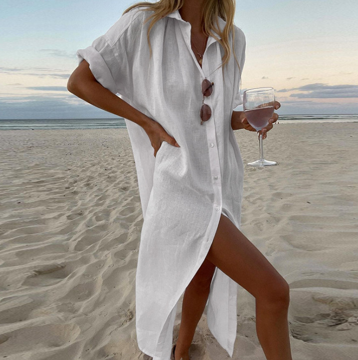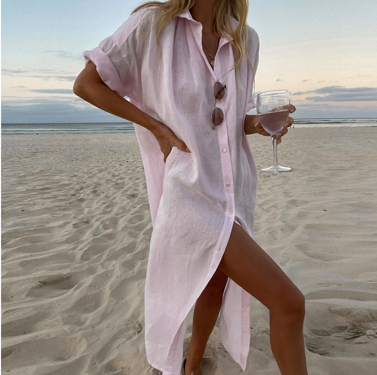 국경 간 유럽과 미국 여성 의류 스타일 올 매치 솔리드 컬러 캐주얼 긴 소매 중간 길이의 코튼 리넨 셔츠 원피스스토어 가기