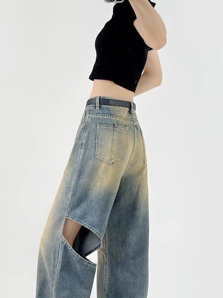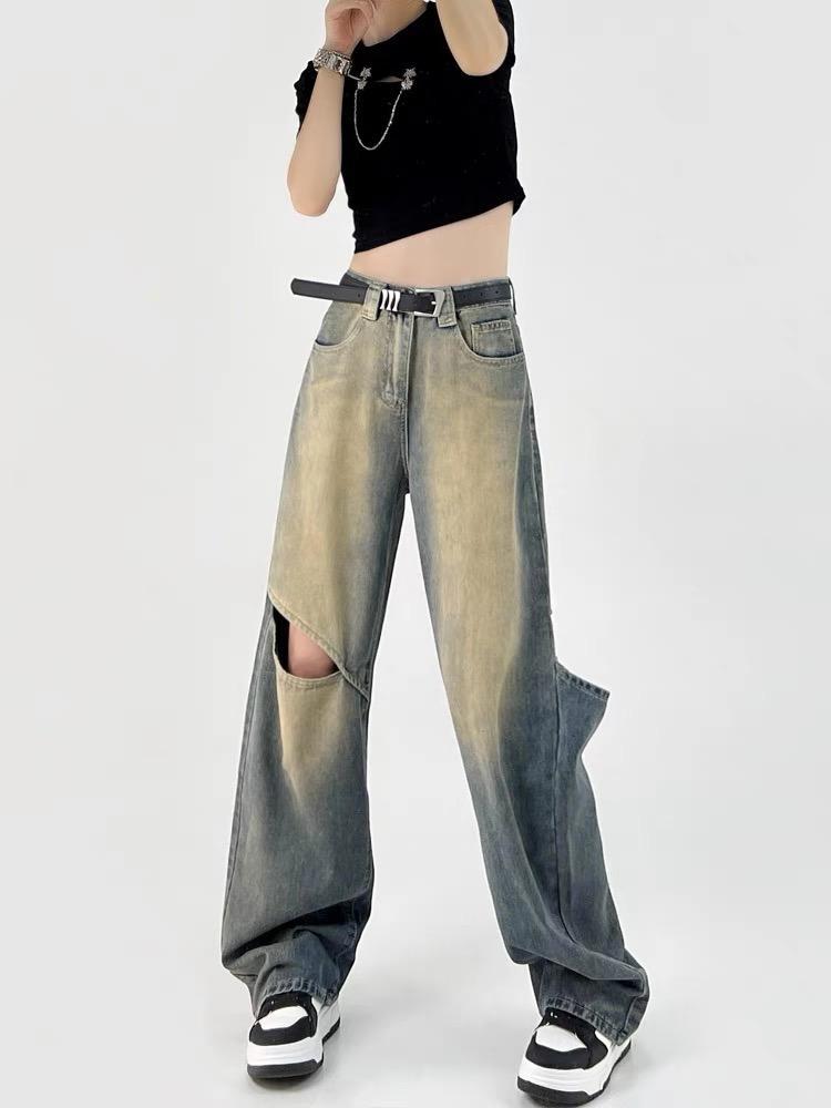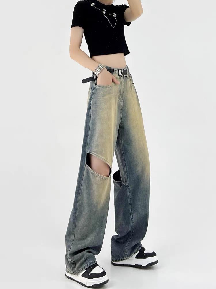 찢어진 향수 컬러 청바지 여성의 2024 년 여름 새로운 높은 허리 느슨한 슬리밍 스트레이트 올 매치 와이드 레그 바지