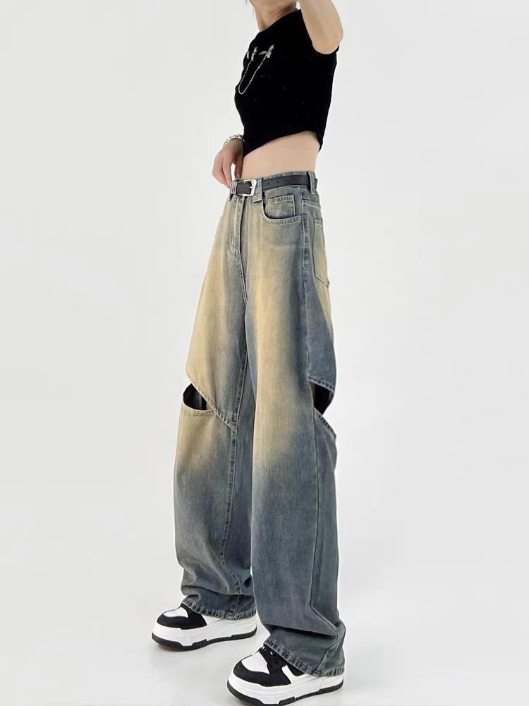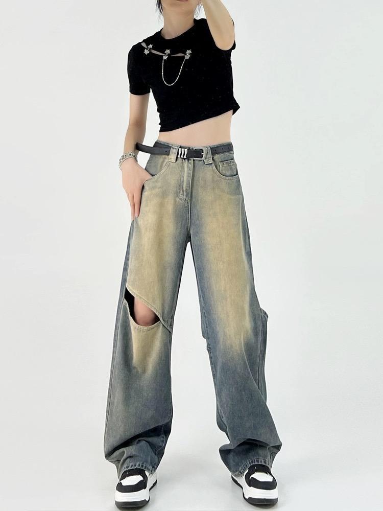 찢어진 향수 컬러 청바지 여성의 2024 년 여름 새로운 높은 허리 느슨한 슬리밍 스트레이트 올 매치 와이드 레그 바지스토어 가기