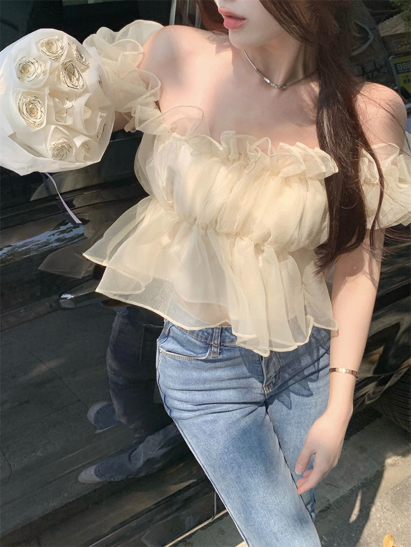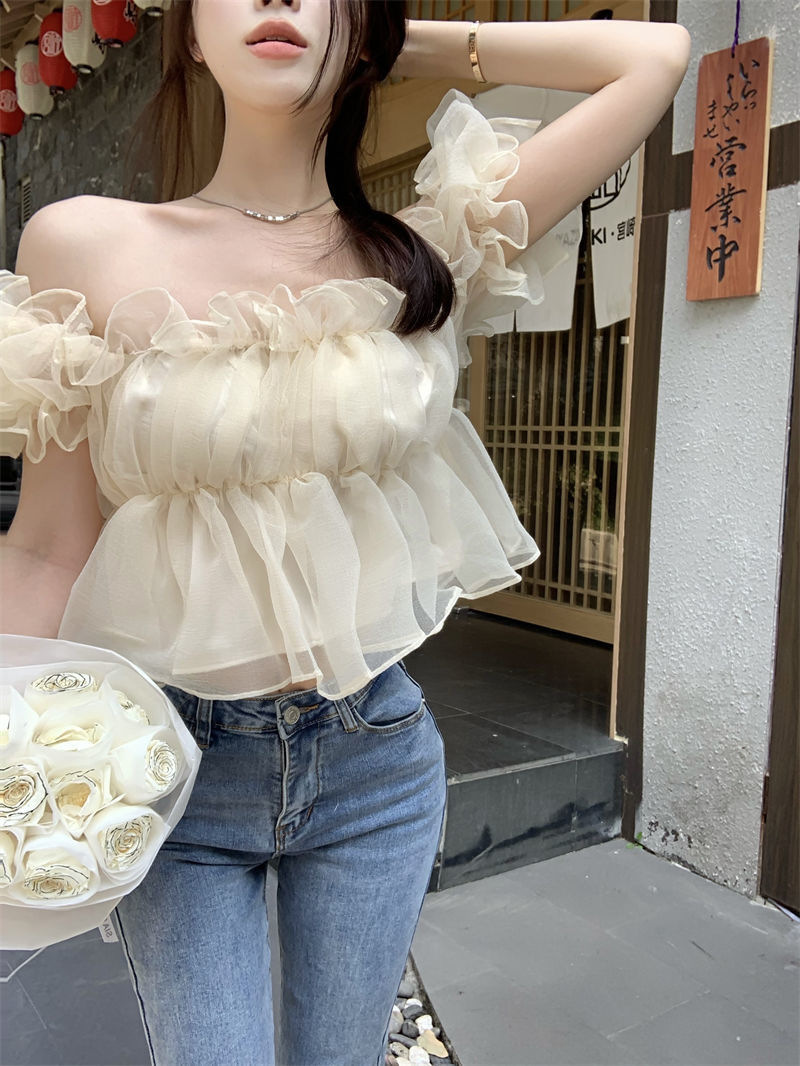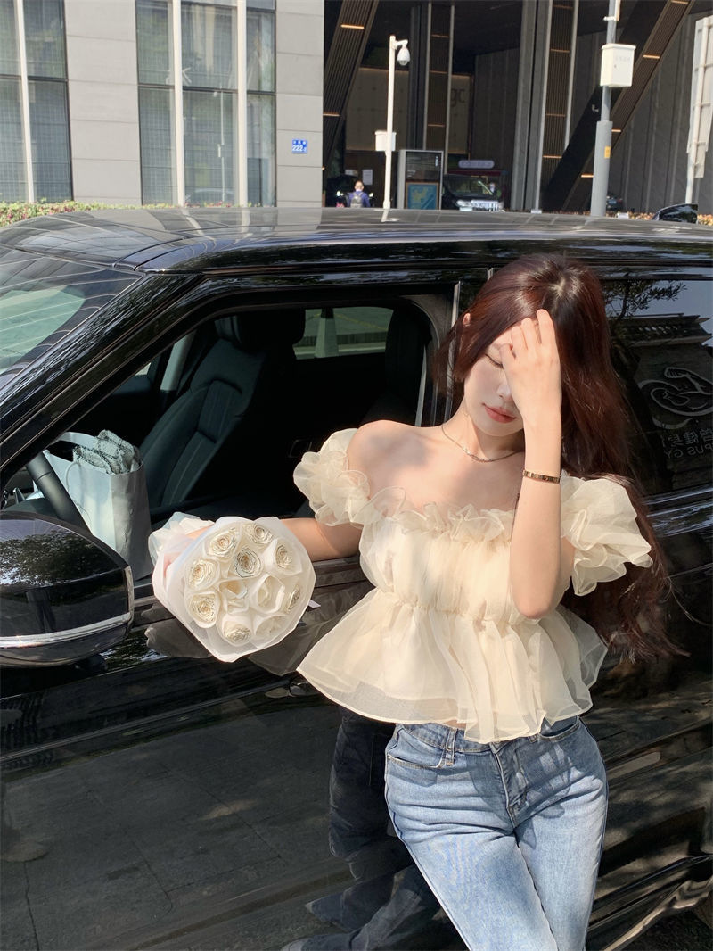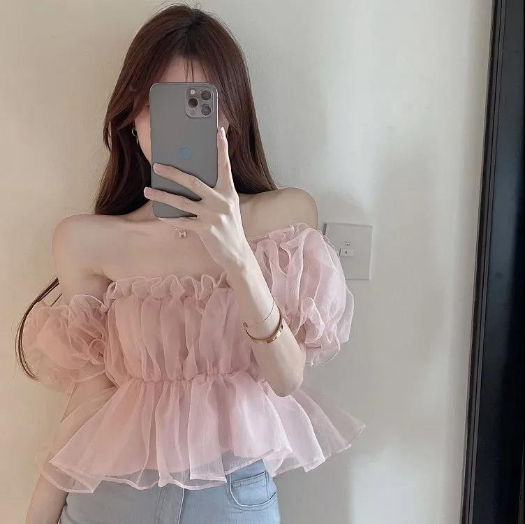 프렌치 퍼프 슬리브 달콤한 오프 숄더 쉬폰 셔츠 여성의 여름 핫 걸 디자인 틈새 세련된 쇼트 탑