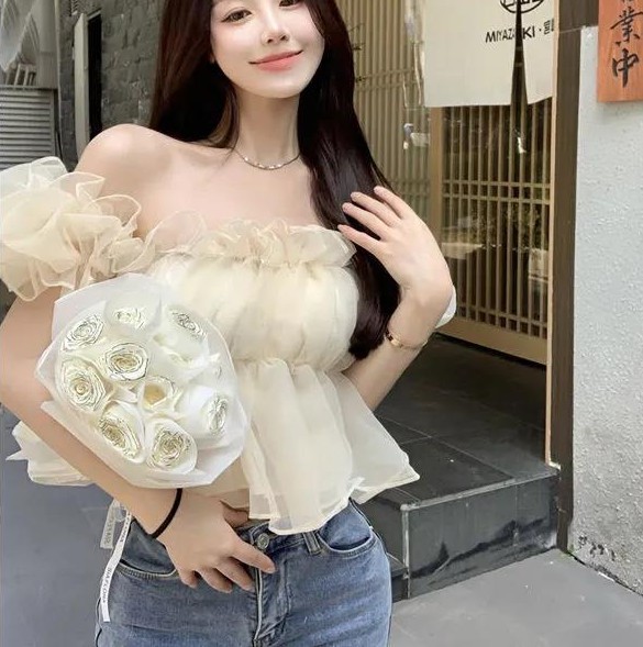프렌치 퍼프 슬리브 달콤한 오프 숄더 쉬폰 셔츠 여성의 여름 핫 걸 디자인 틈새 세련된 쇼트 탑스토어 가기