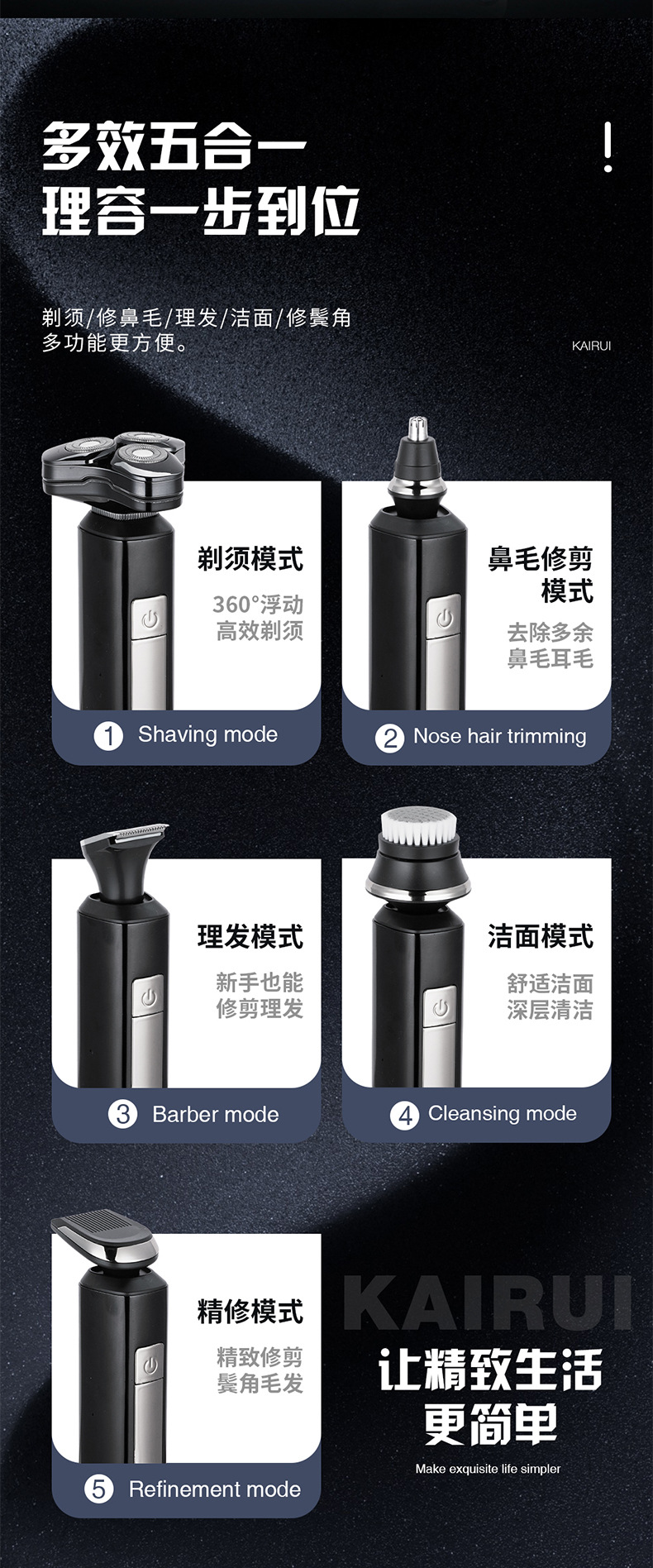 • 단일 기계 + 코털 트리머 + 구레나룻 트리머 + 헤어 클리퍼 헤드 + 예비 커터 헤드
