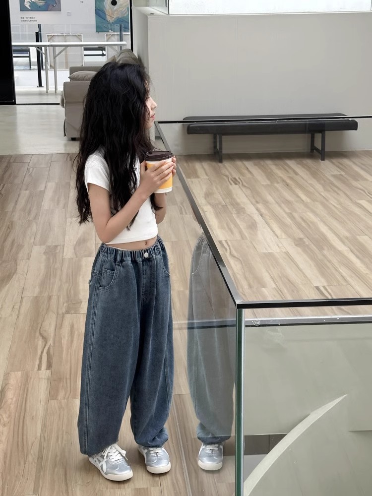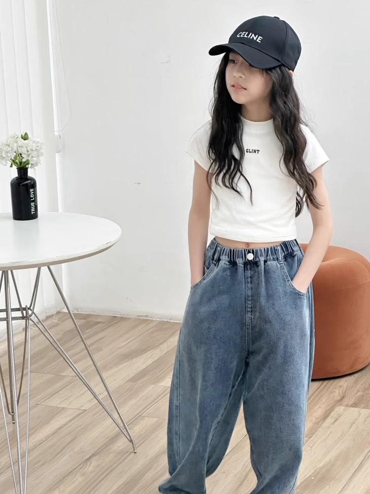 여자 반팔 티셔츠 2024 여름 새 어린이 크루 넥 탑 유행 짧은 티셔츠 스트리트 댄스 팀 원피스 반소매 트렌디