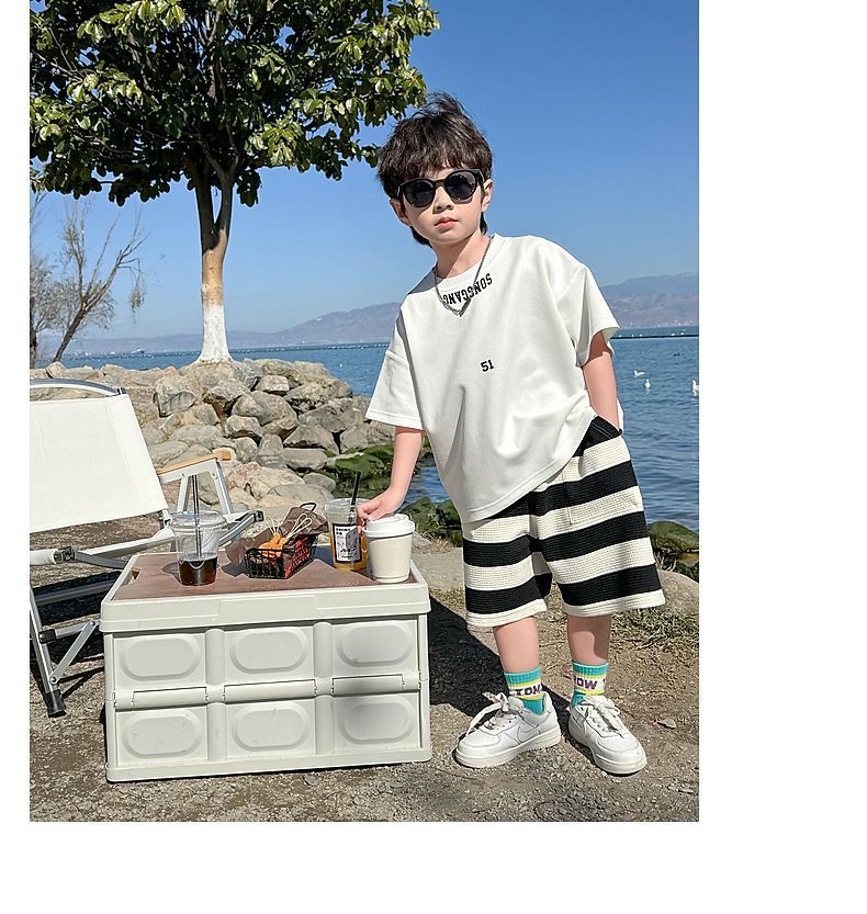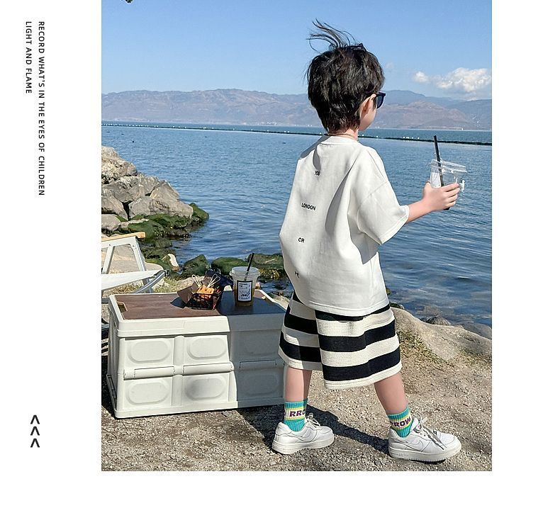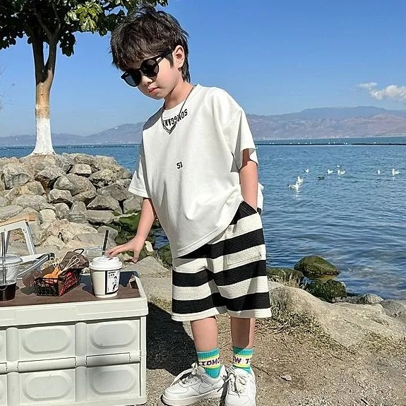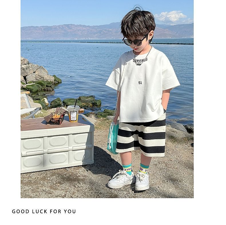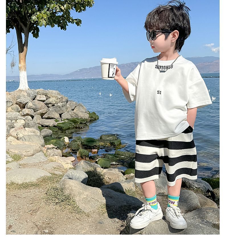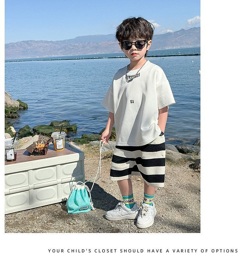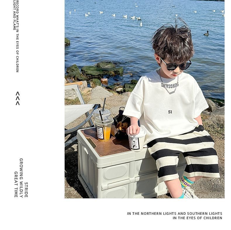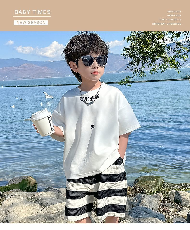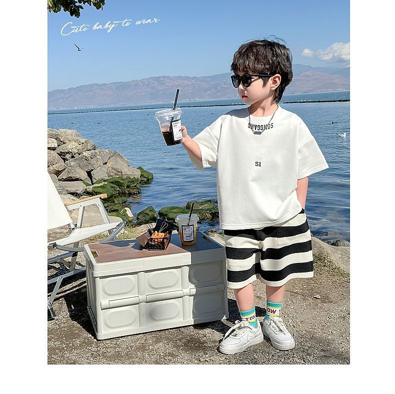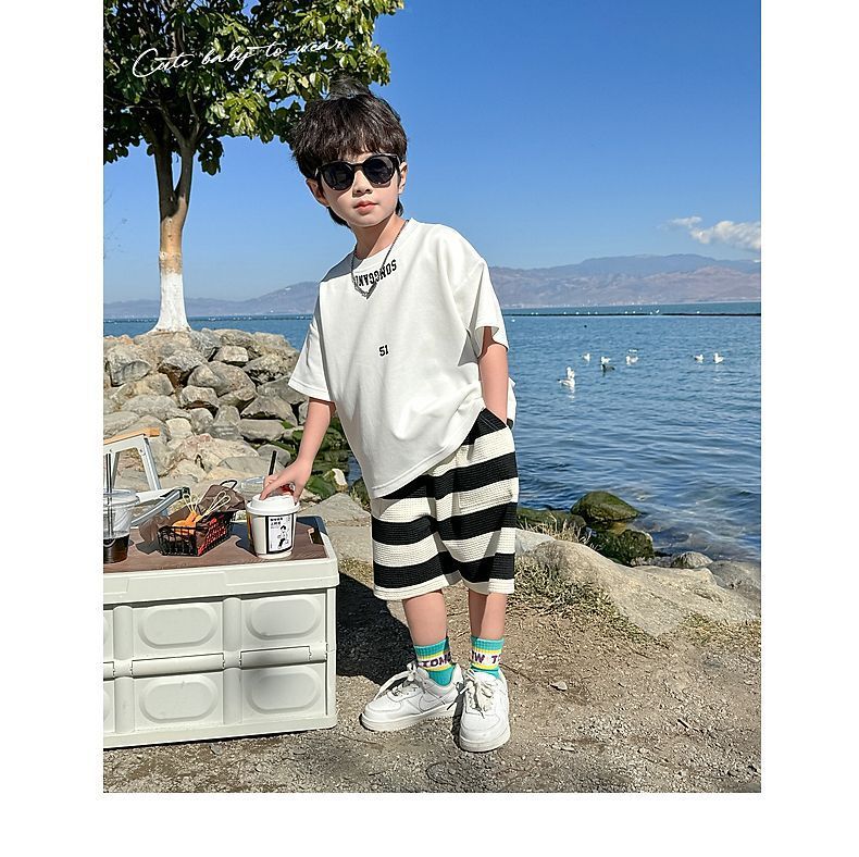 소년 여름 정장 2025 새로운 어린이 한국 스타일 여름 반팔 소년 잘 생긴 5 점 바지 캐주얼 투피스 세트스토어 가기