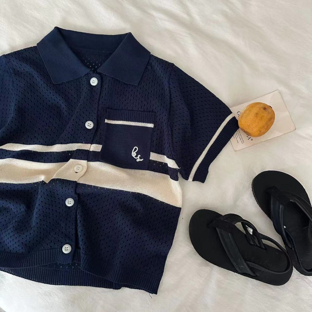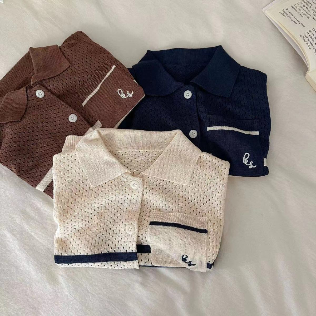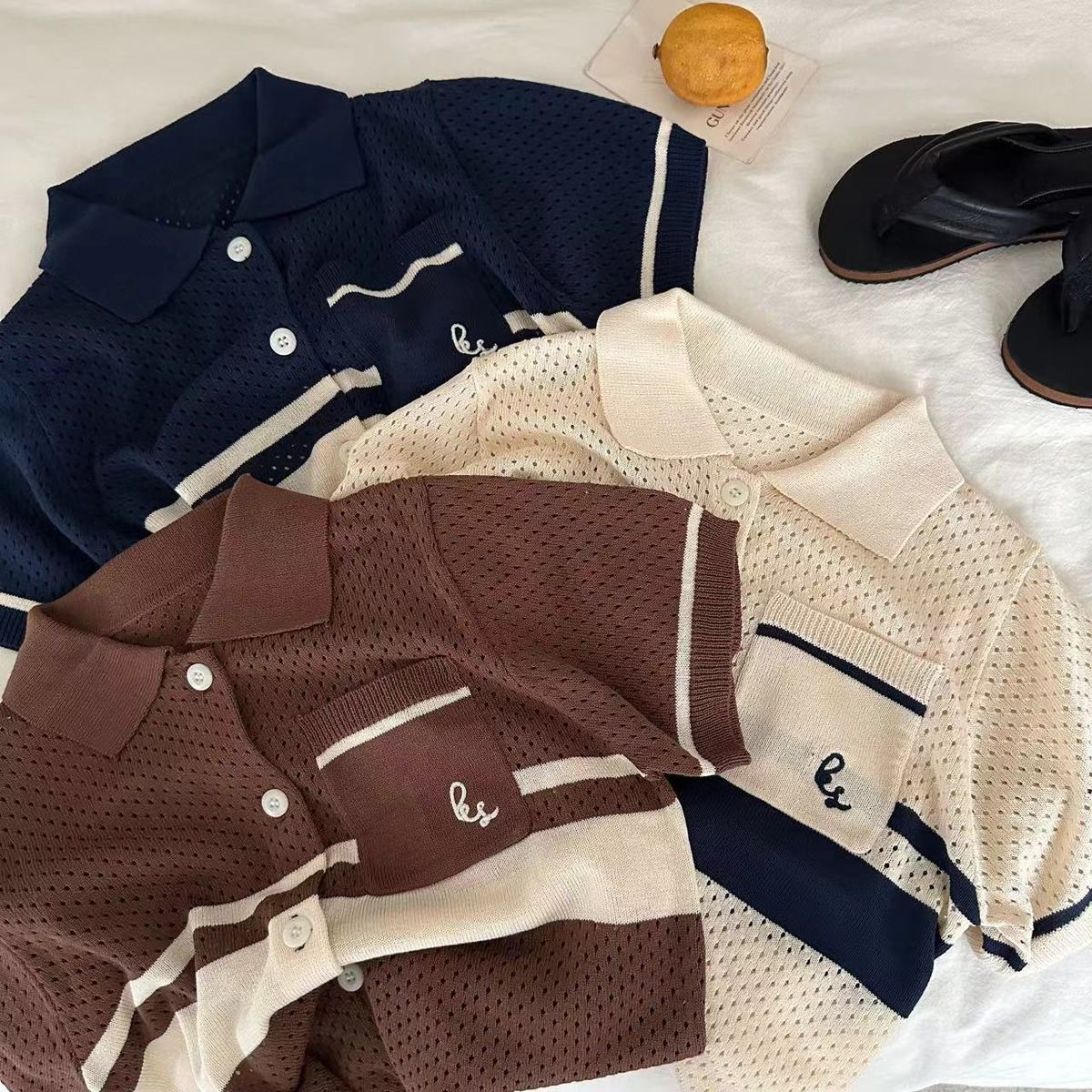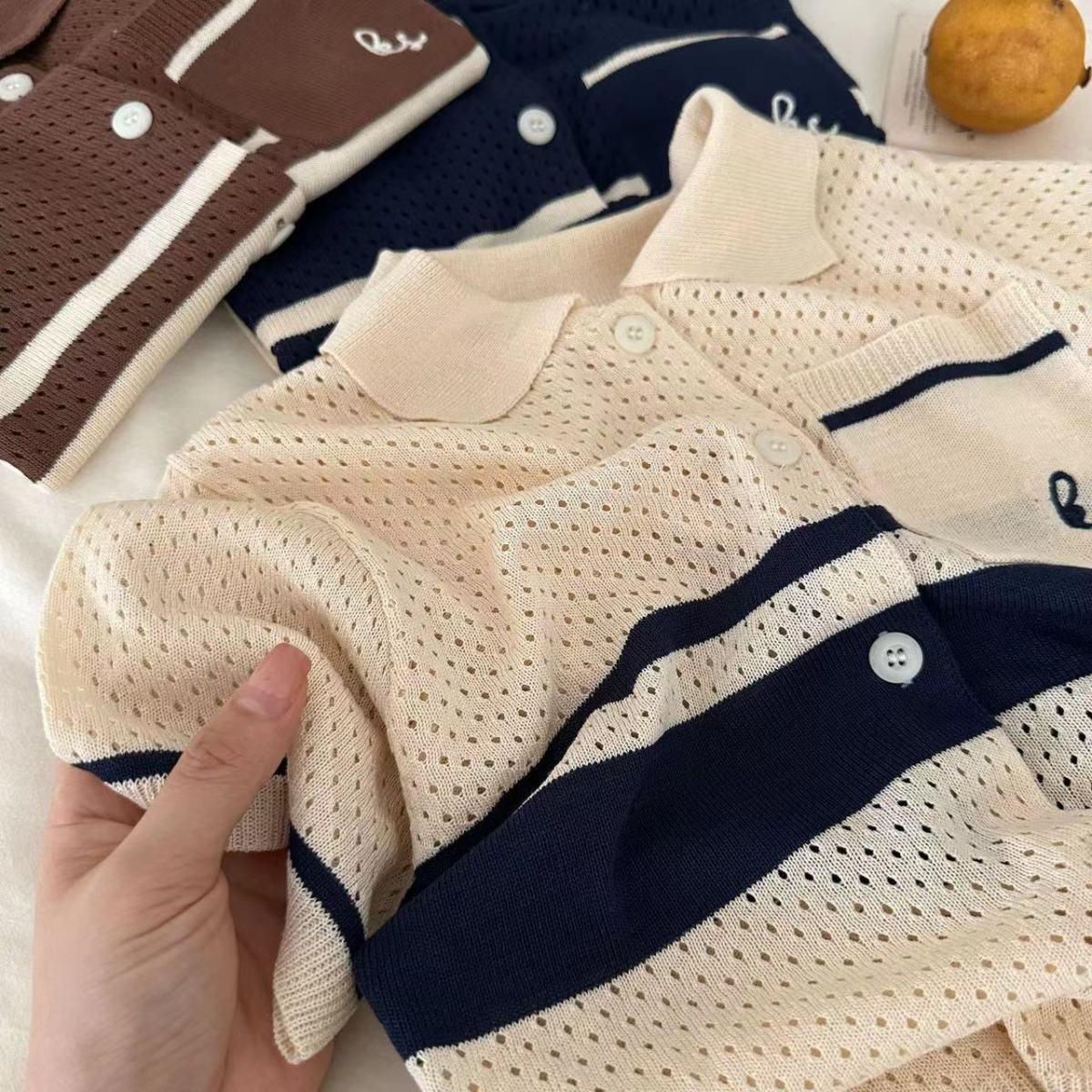 2026년 여름 남아 여아 니트 펀칭 배색 아이스 실크 스웨터, 스타일리시하고 활용도 높은 메쉬 반팔 폴로 칼라 탑스토어 가기