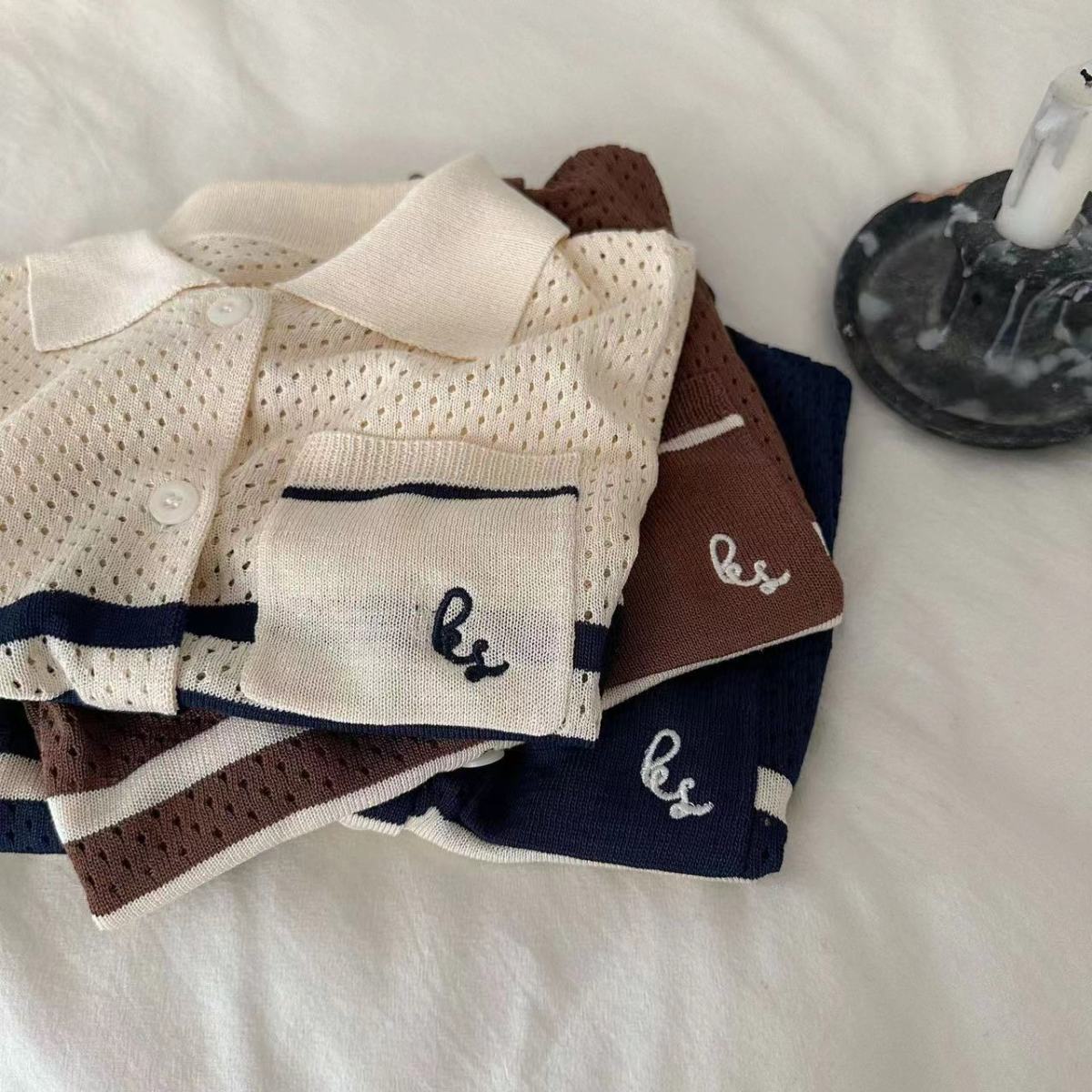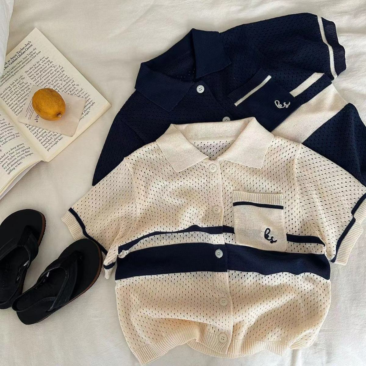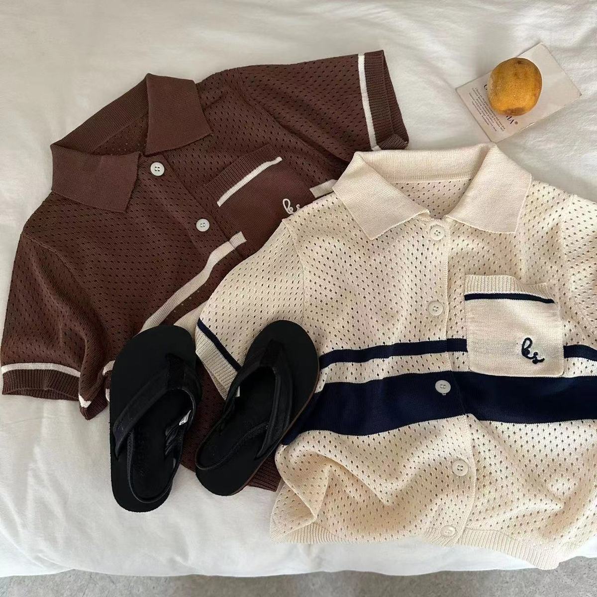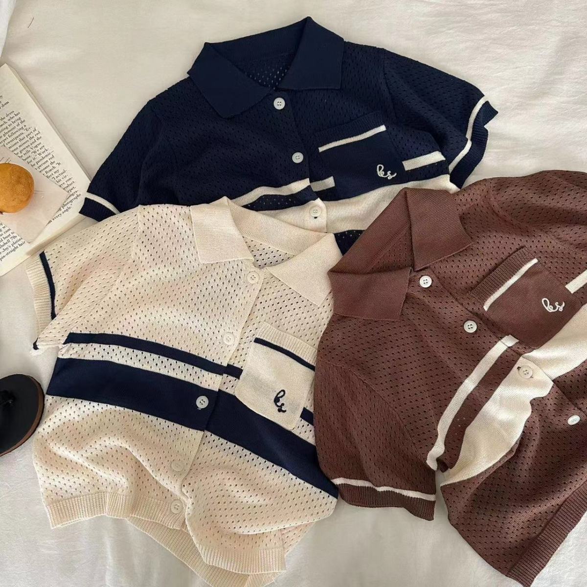 2026년 여름 남아 여아 니트 펀칭 배색 아이스 실크 스웨터, 스타일리시하고 활용도 높은 메쉬 반팔 폴로 칼라 탑스토어 가기