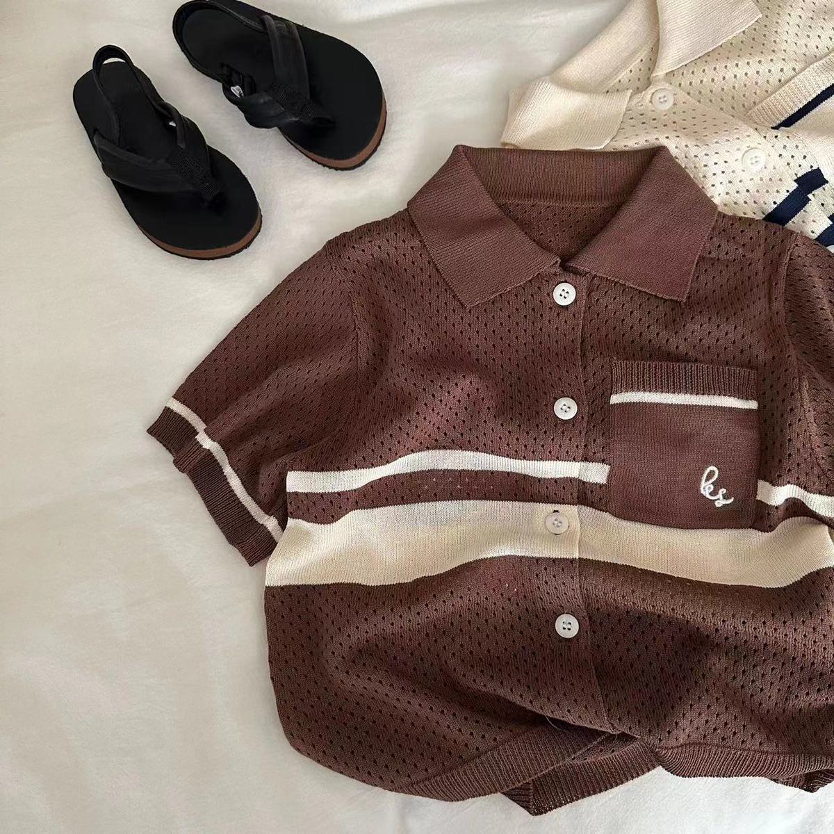 2026년 여름 남아 여아 니트 펀칭 배색 아이스 실크 스웨터, 스타일리시하고 활용도 높은 메쉬 반팔 폴로 칼라 탑