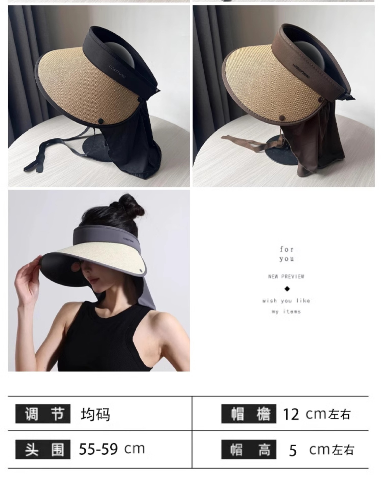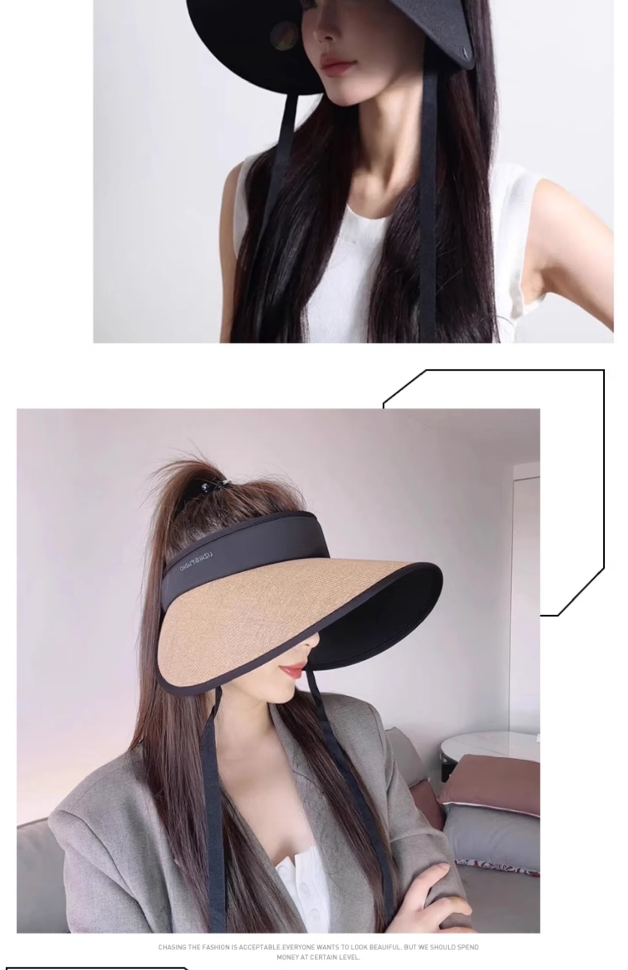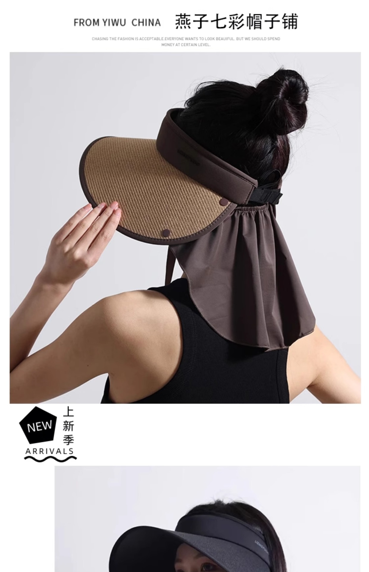 검은 고무 빈 탑 선 스크린 모자 여성의 여름 자외선 방지 사이클링 목 보호 밀짚 지팡이 모자 접이식 해변 태양 모자스토어 가기