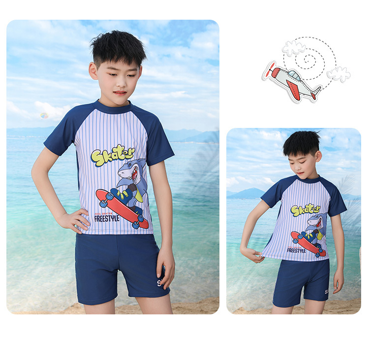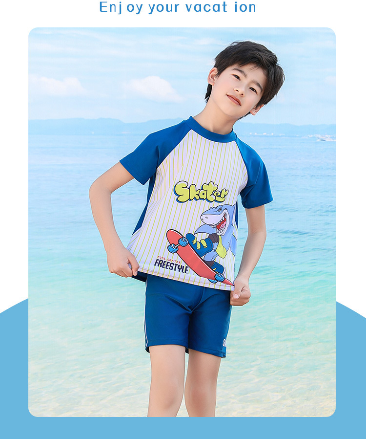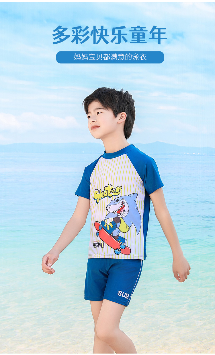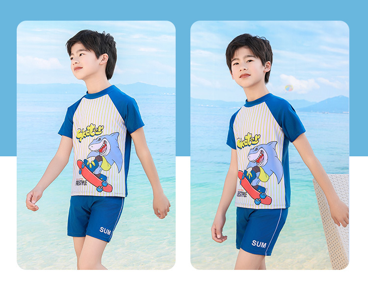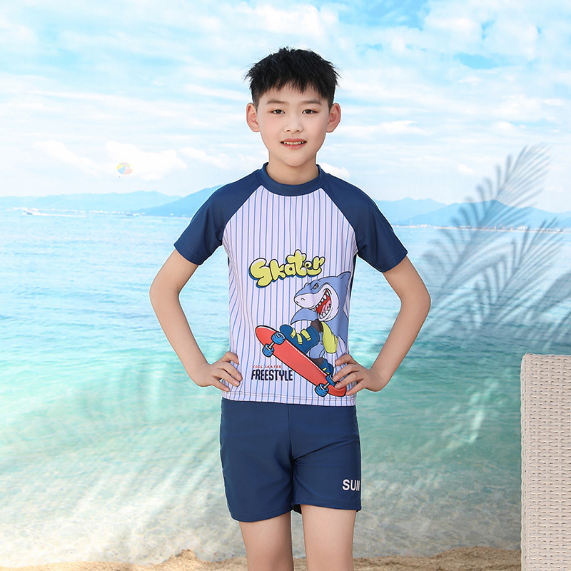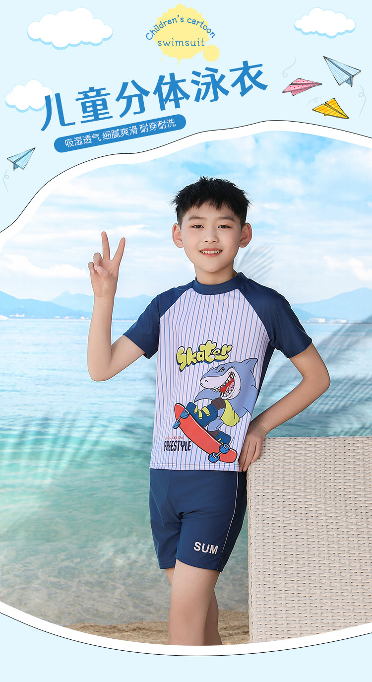 [고급 품질] 어린이 수영복, 여름용 중대형 어린이용 만화 상어 자외선 차단 속건 수영복 공장스토어 가기