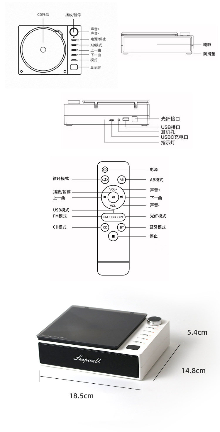 【功能】CD、蓝牙接收、蓝牙发射、USB、FM