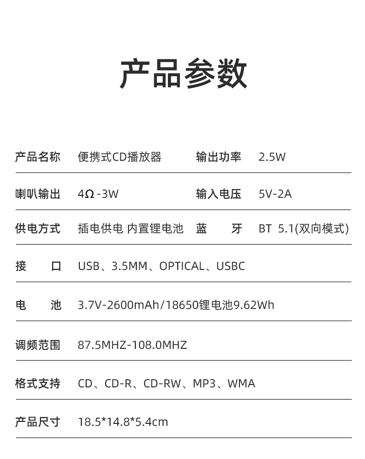 【产品清单】CD播放机*1、说明书*1、耳机线*1、