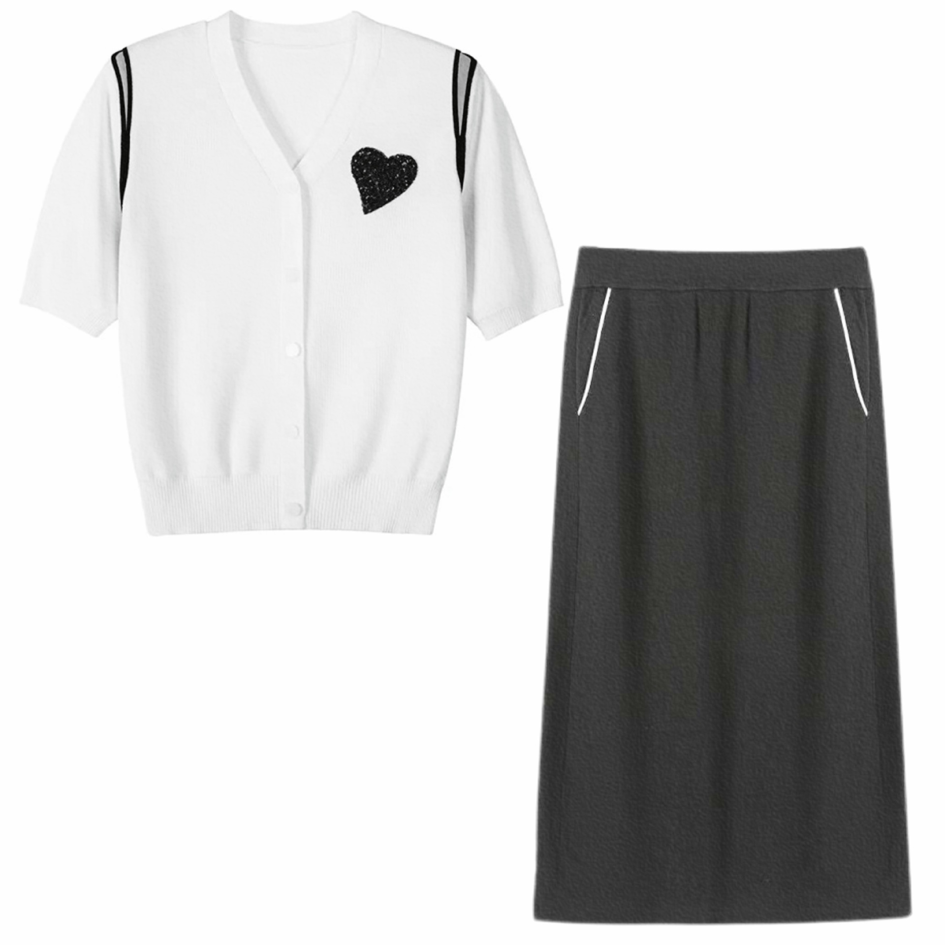 샤오샹풍 하트 브이넥 니트 여성 여름 신상 2025 하이웨이스트 슬림핏 미디 블랙 스커트 세트
