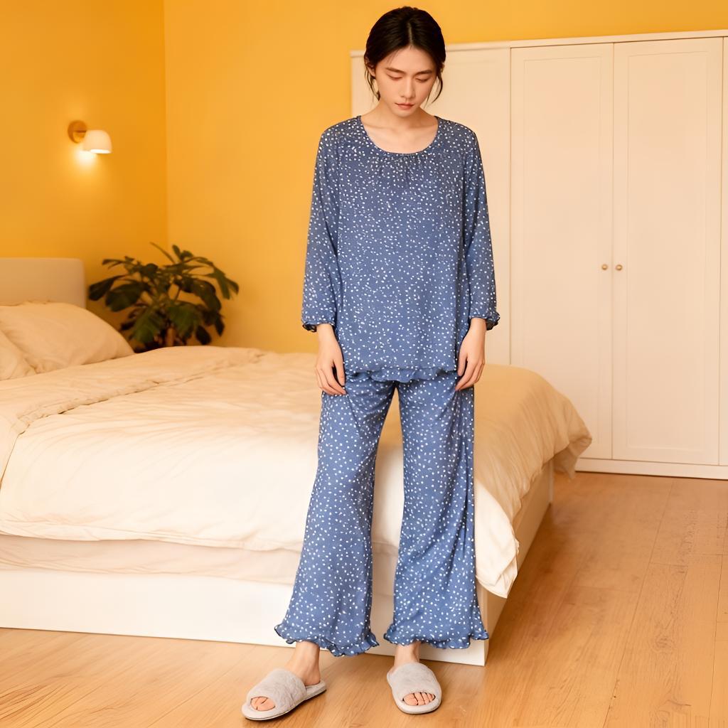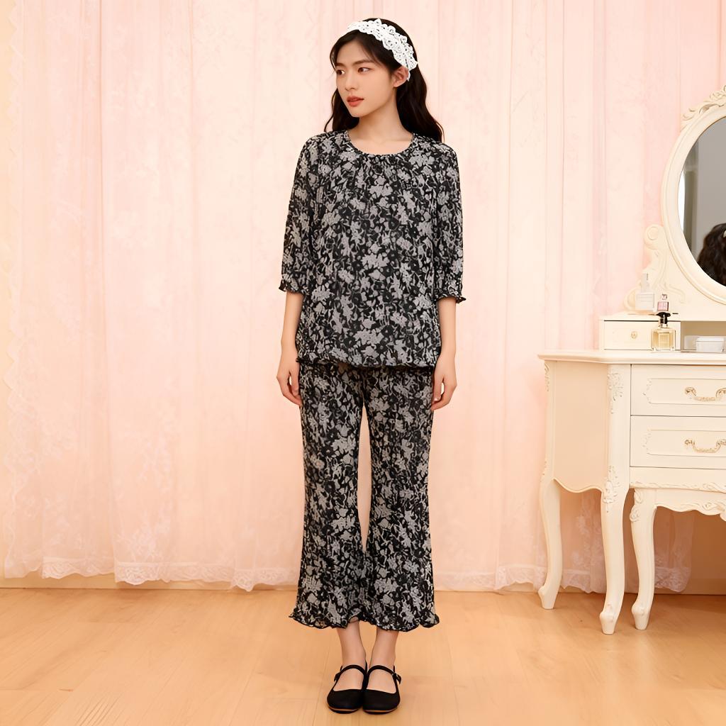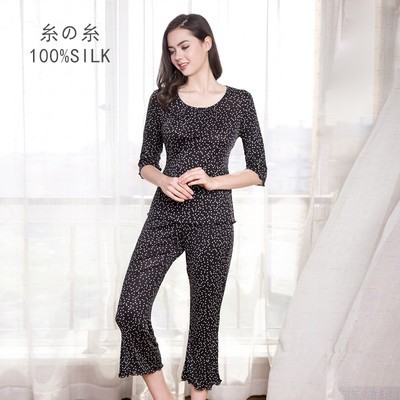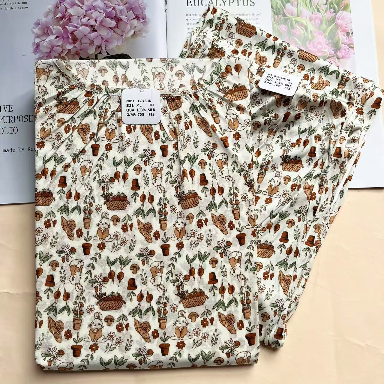 공장 직판 신상 봄가을 여성용 둥근넥 편안한 투피스 프린트 실크 홈웨어 잠옷