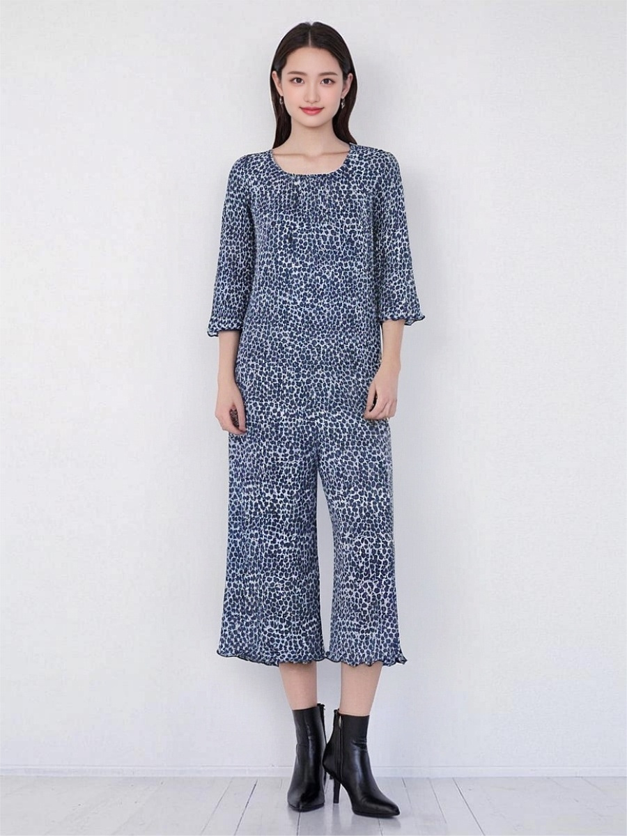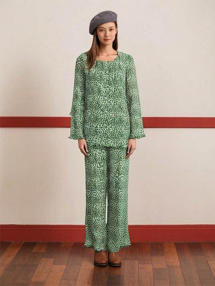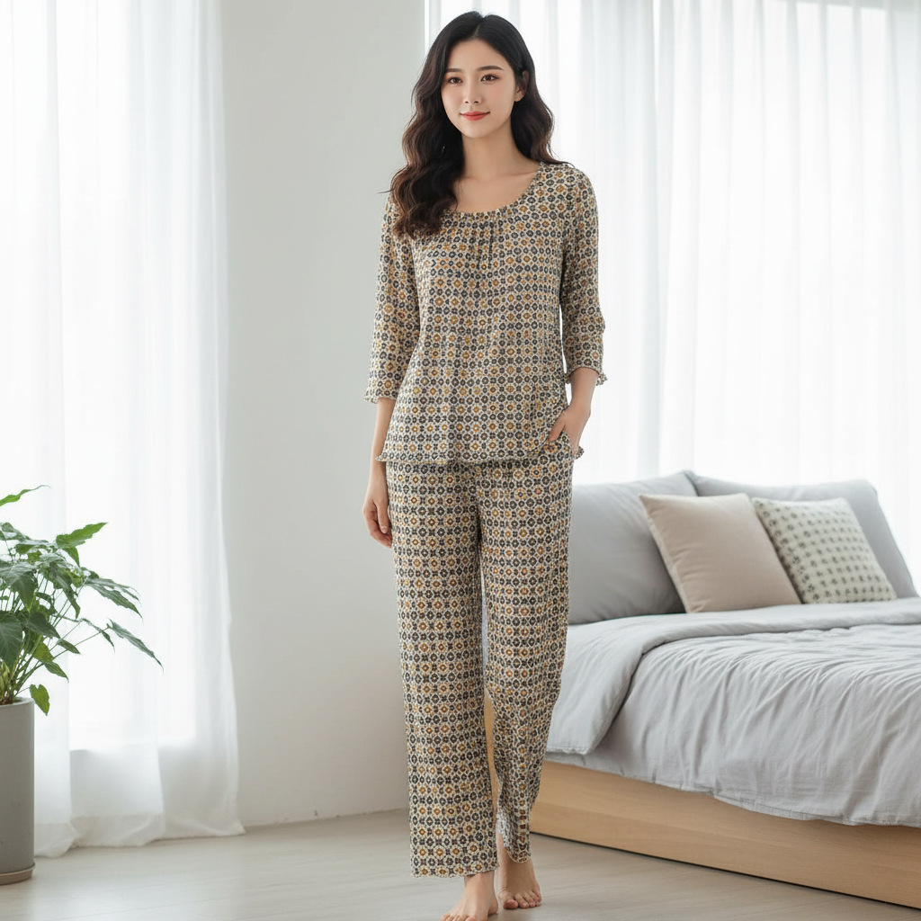 공장 직판 신상 봄가을 여성용 둥근넥 편안한 투피스 프린트 실크 홈웨어 잠옷