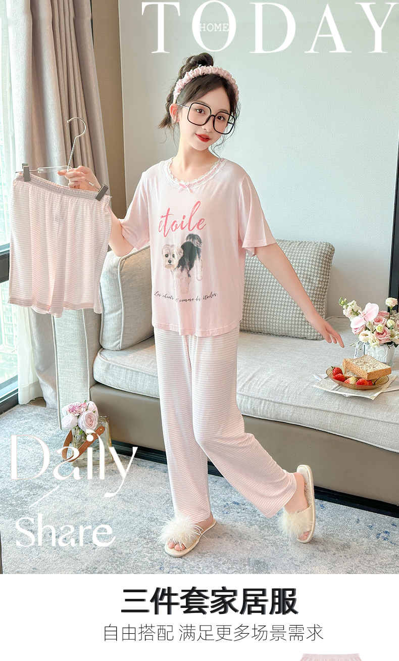 여아 여름용 얇은 잠옷, 아동용 모달 반팔 반바지, 긴바지 3종 세트, 큰 아이와 소녀들을 위한 홈웨어