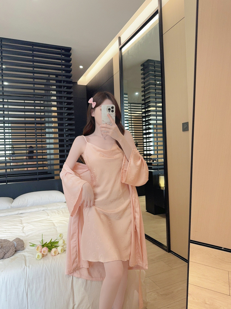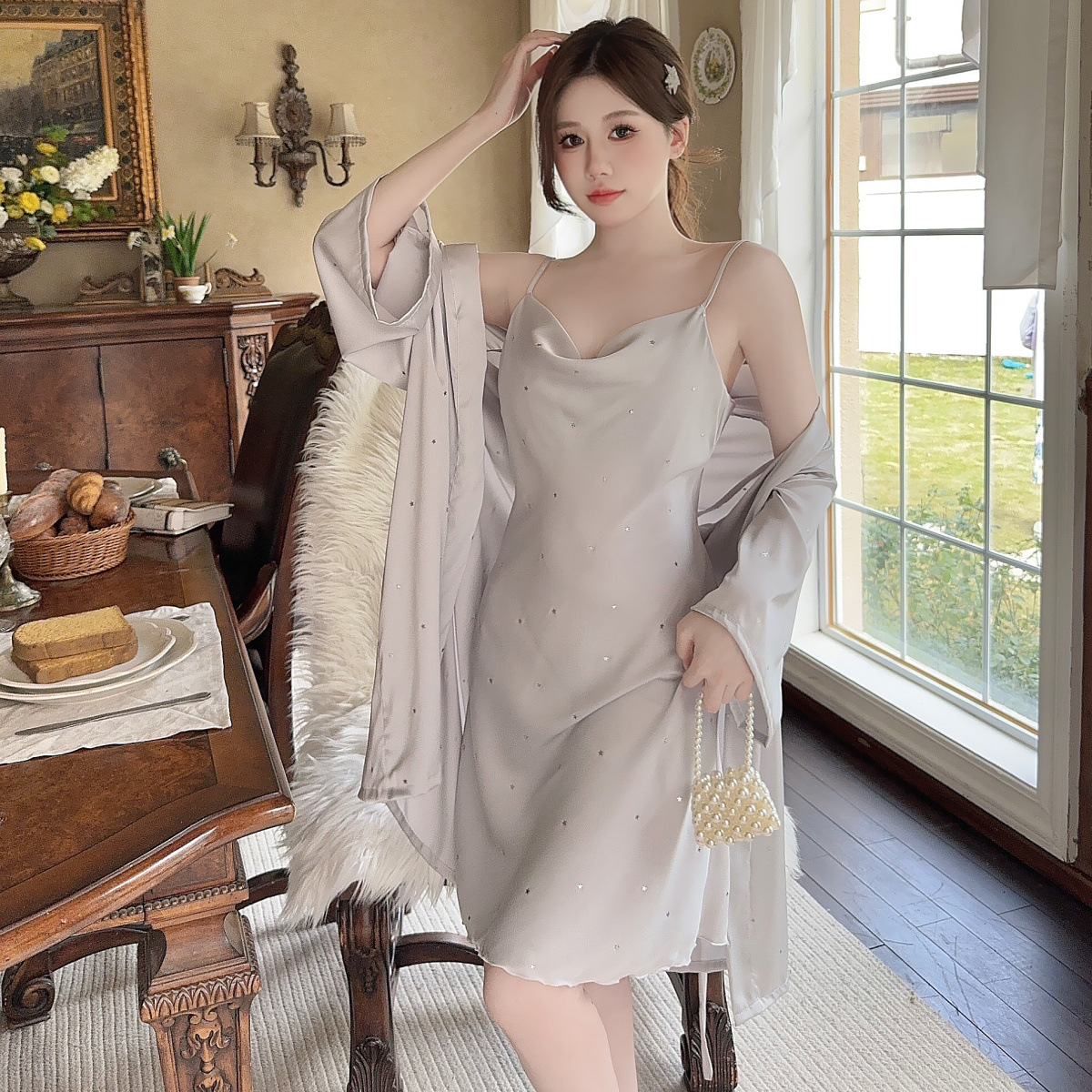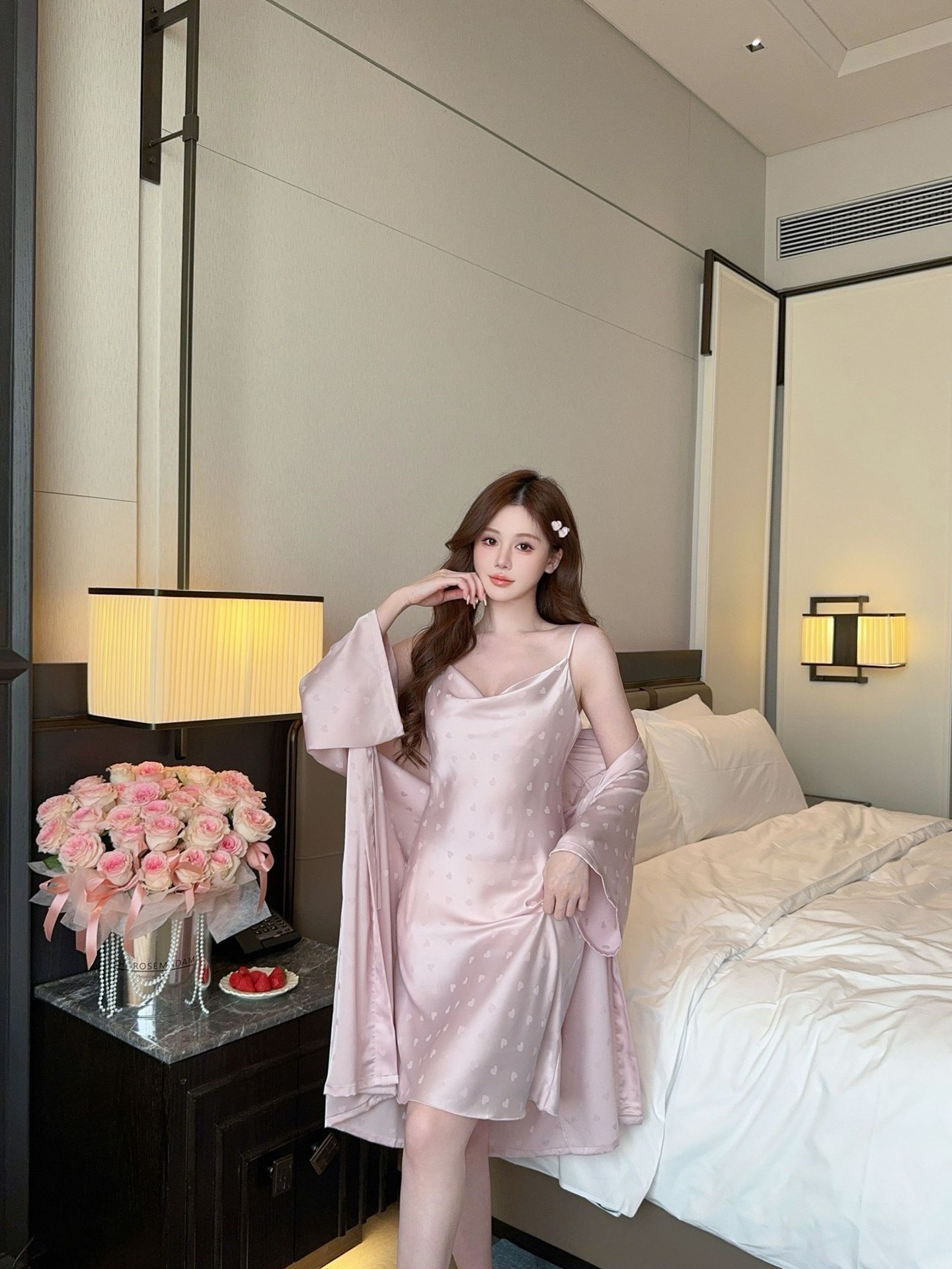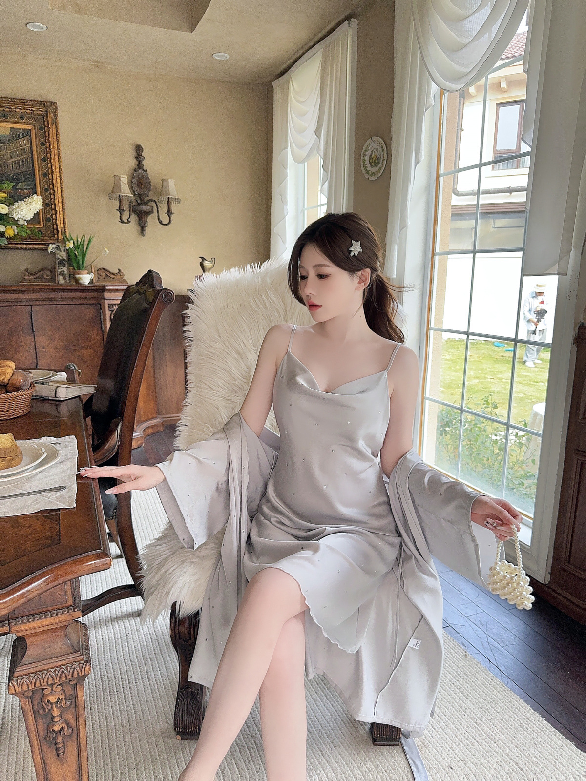 여름 하이 엔드 아이스 실크 나이트 가운 투피스 잠옷 여성용 얇은 자카드 칼라 순수한 욕망 스타일 홈 옷스토어 가기