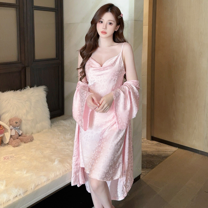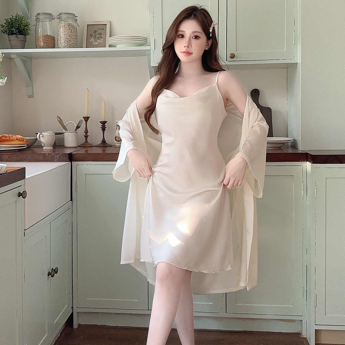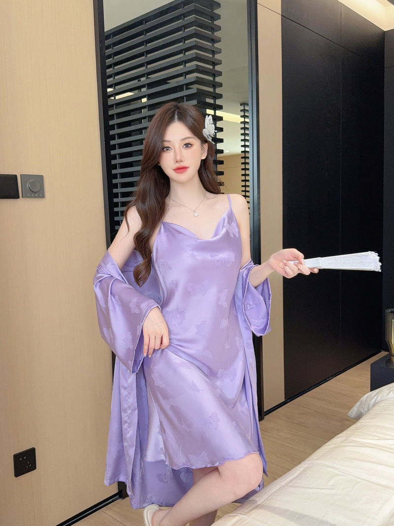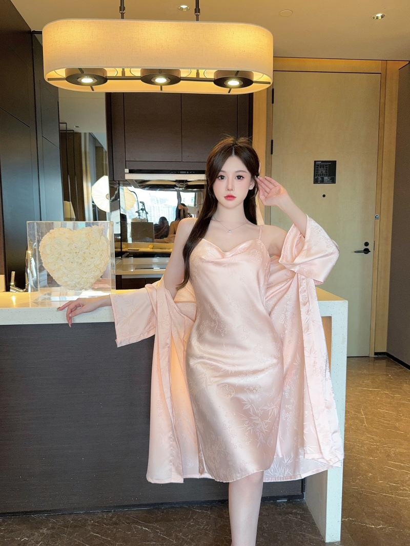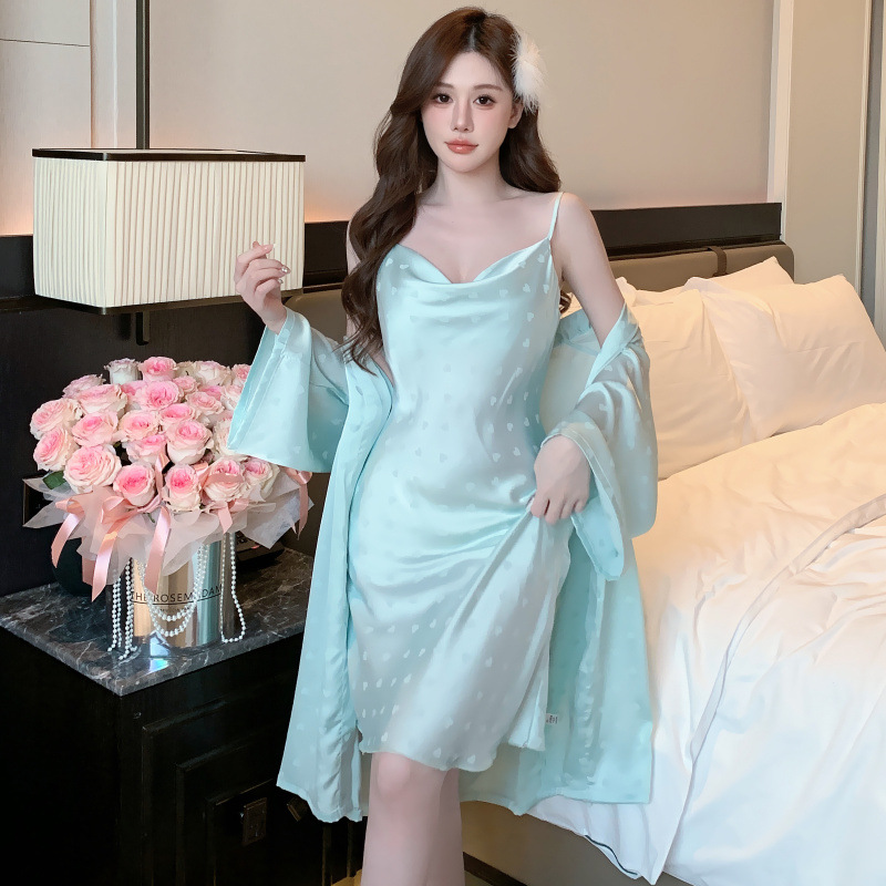 여름 하이 엔드 아이스 실크 나이트 가운 투피스 잠옷 여성용 얇은 자카드 칼라 순수한 욕망 스타일 홈 옷