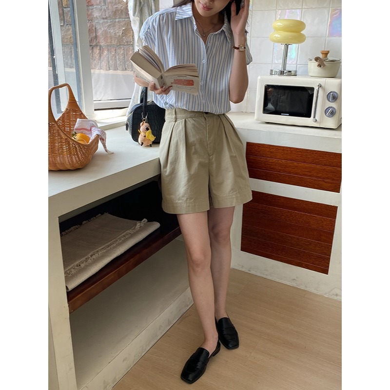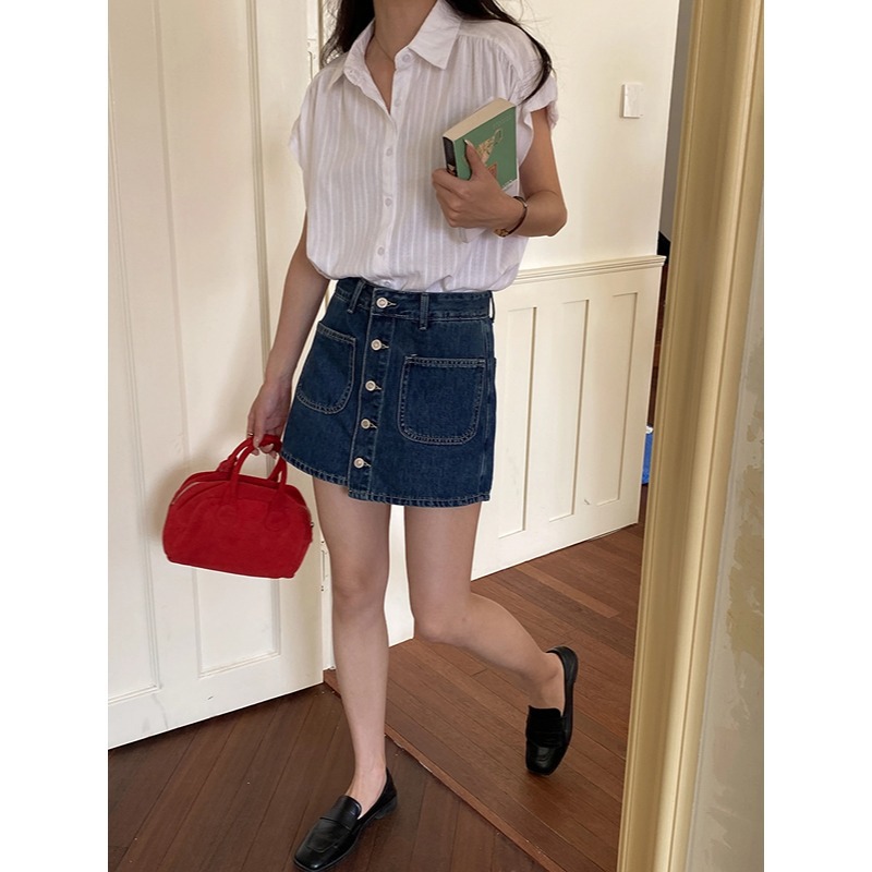 3 번째 아침 줄무늬 질감 레트로 느슨한 슬리밍 싱글 브레스트 반팔 셔츠 ZY1841