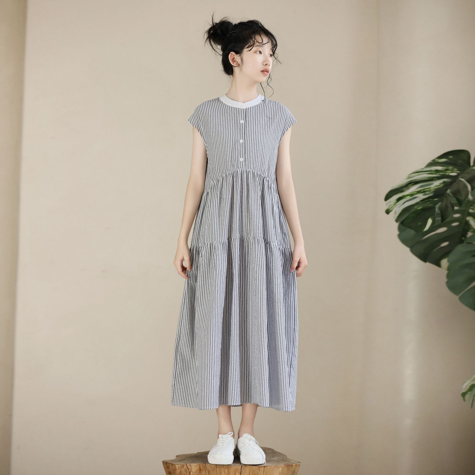 여자 드레스 새로운 여름 줄무늬 스탠드 칼라 하이 엔드 긴 민소매 느슨한 스티치 케이크 드레스 국경스토어 가기