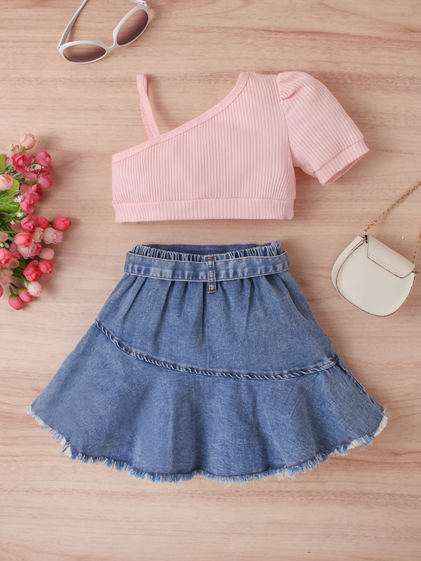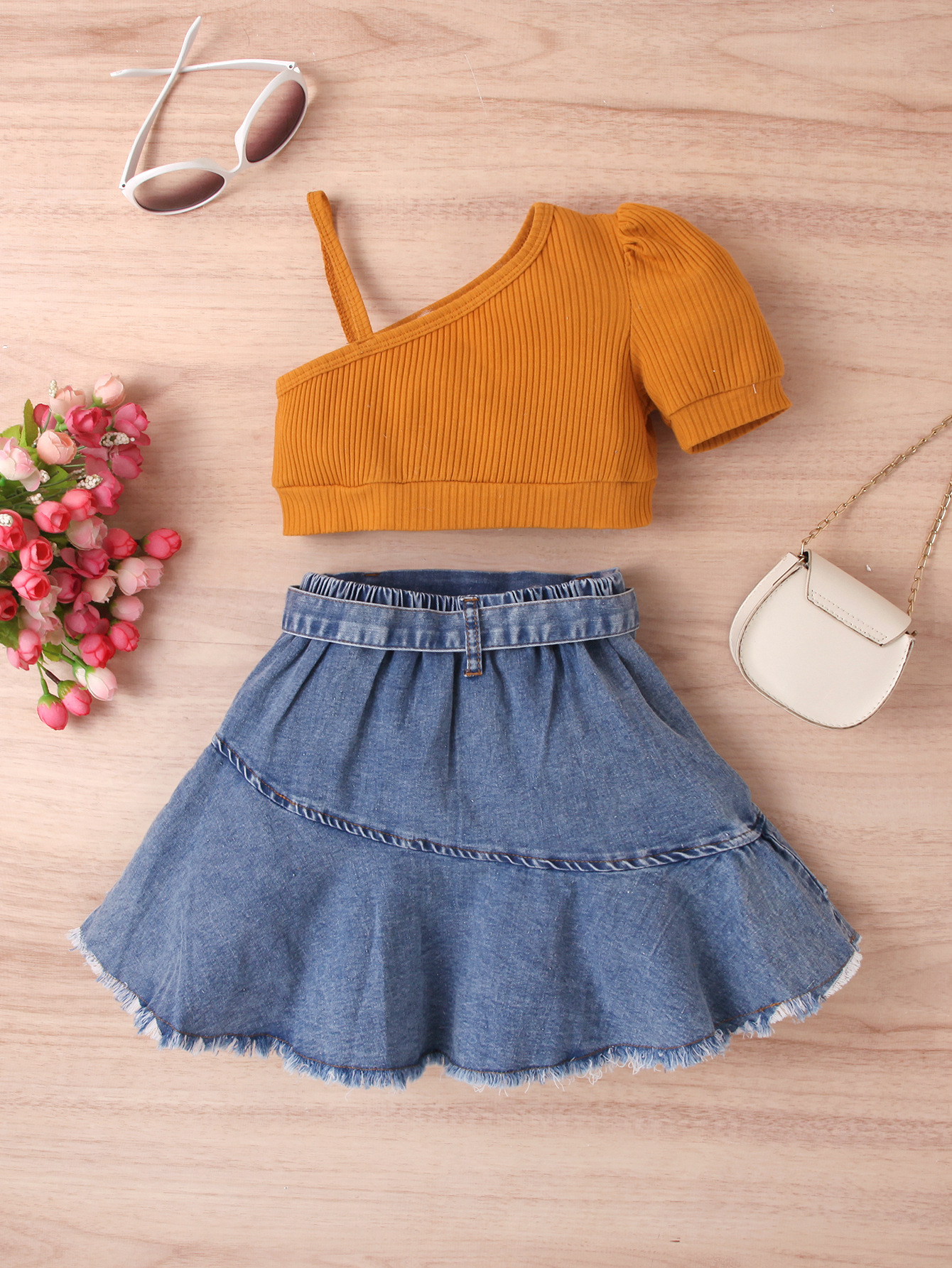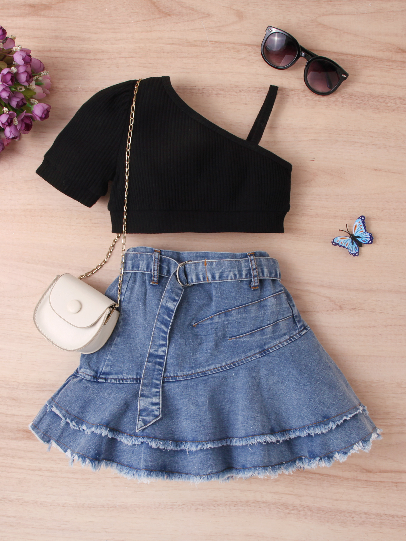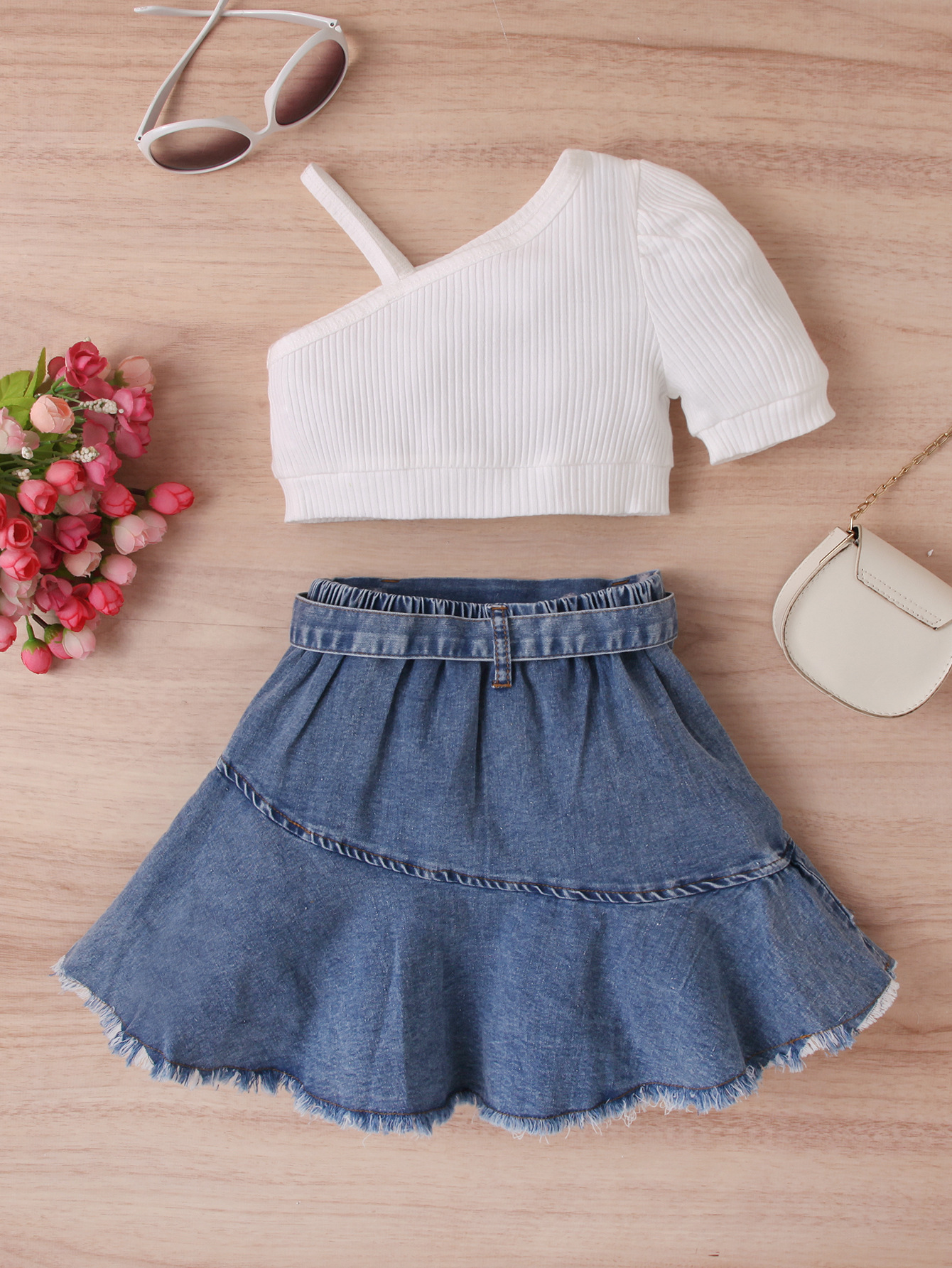 아마존 국경 아동복 소녀 솔리드 컬러 웨이스트 코트 짧은 소매 탑 데님 오픈 백 주름 치마 세트 벨트