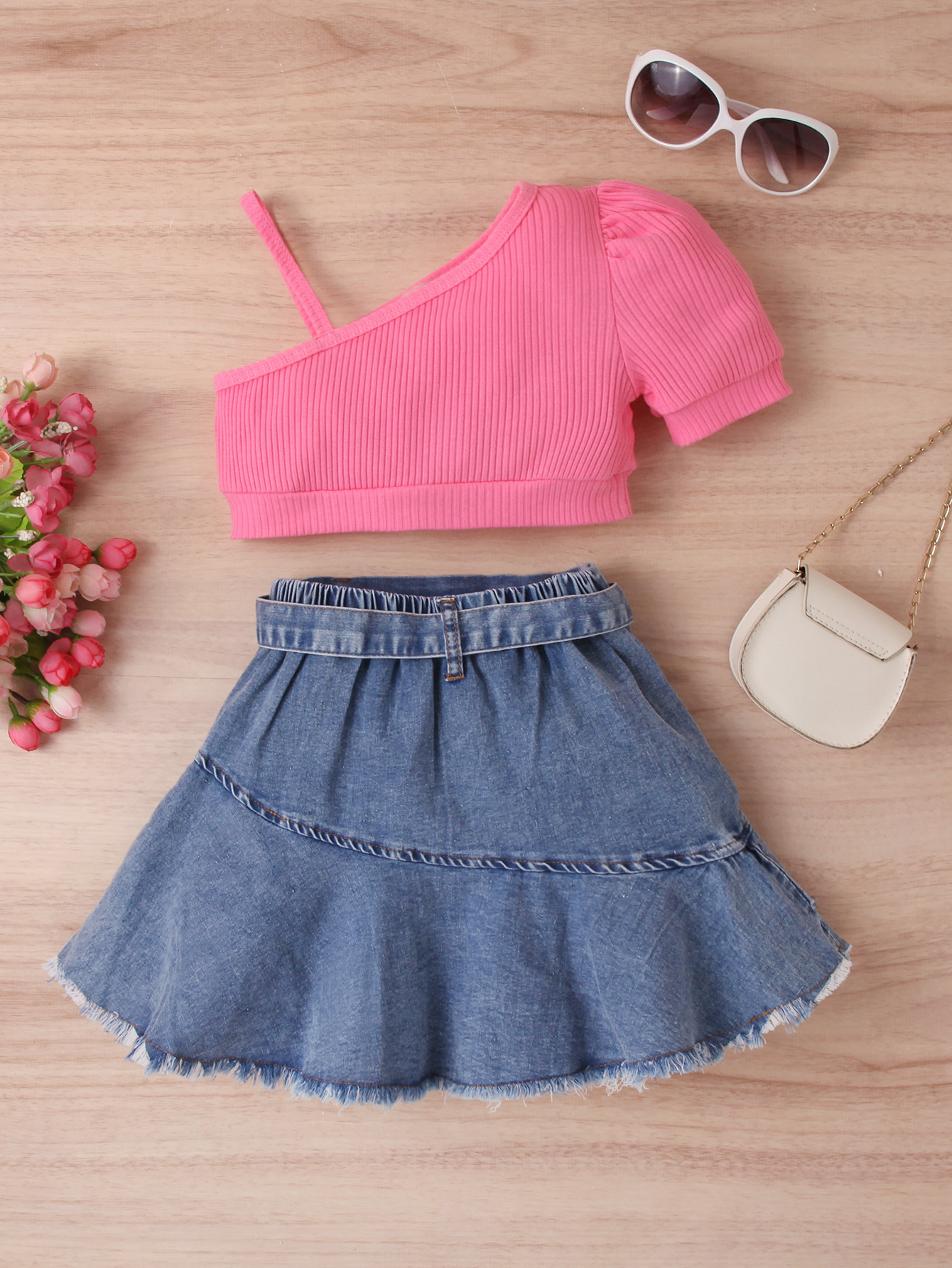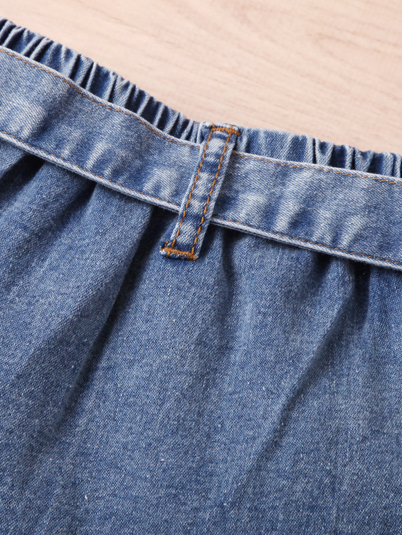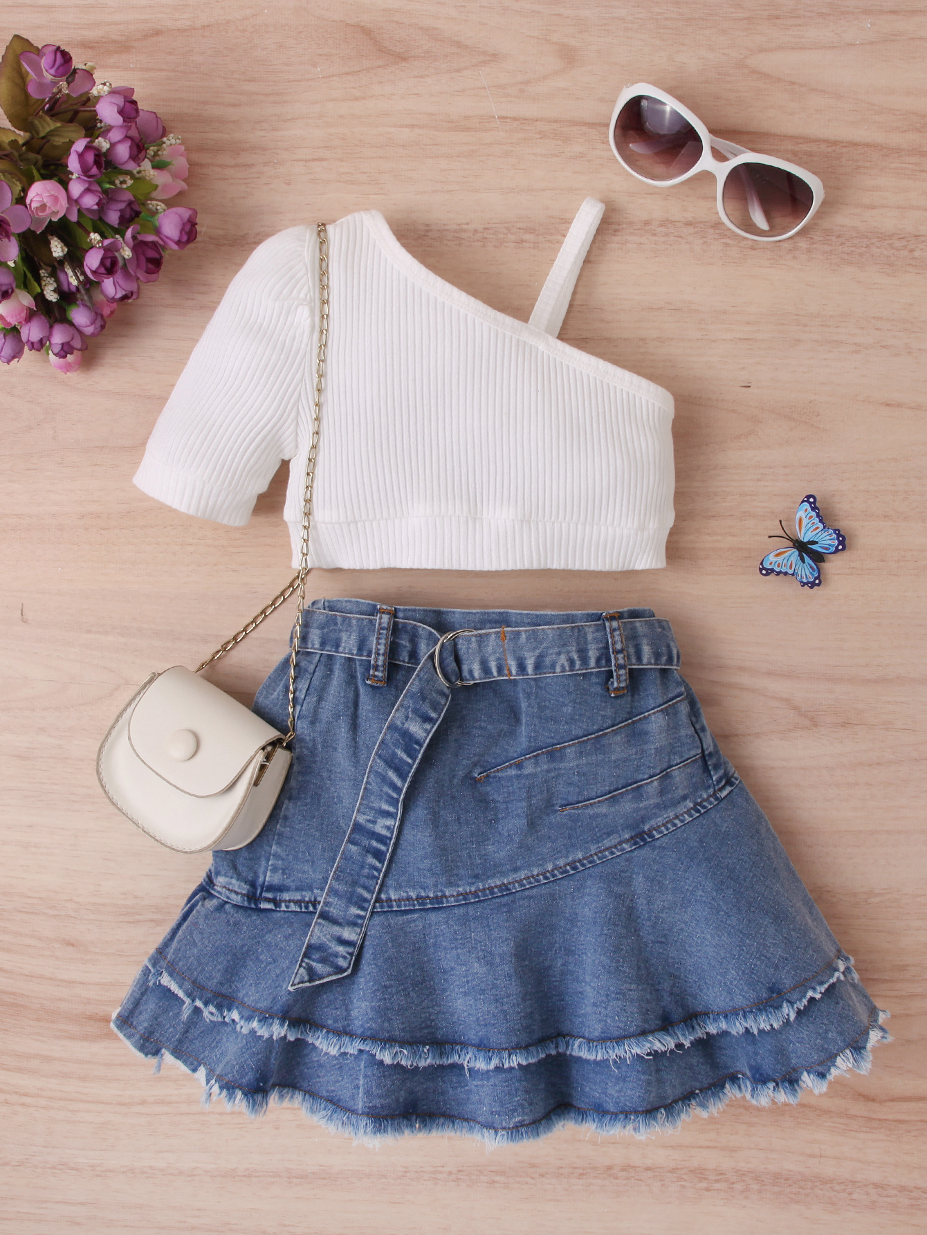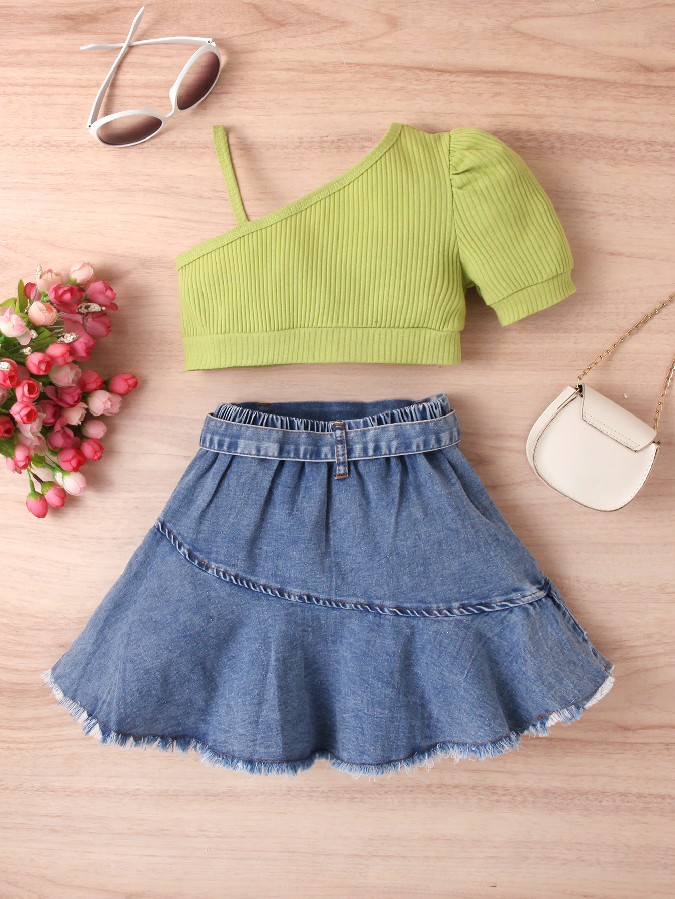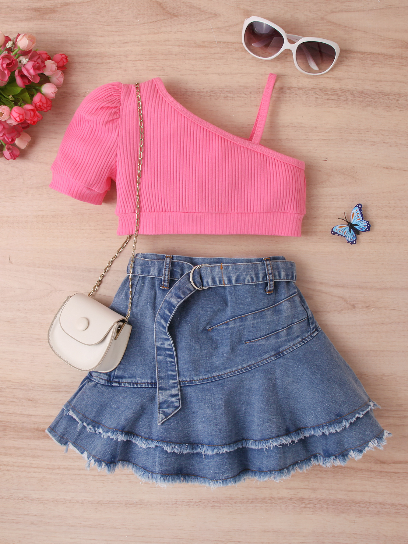 아마존 국경 아동복 소녀 솔리드 컬러 웨이스트 코트 짧은 소매 탑 데님 오픈 백 주름 치마 세트 벨트