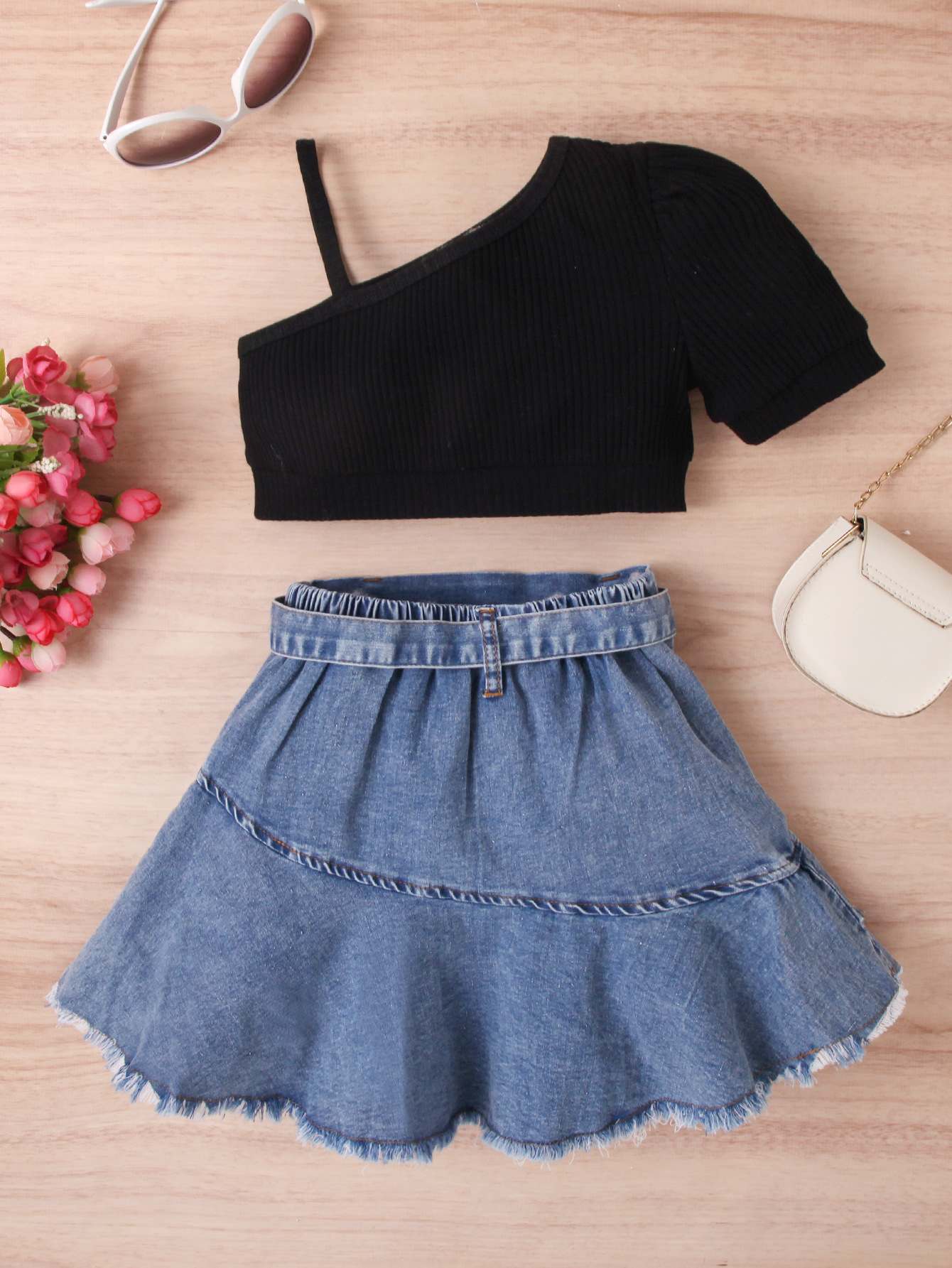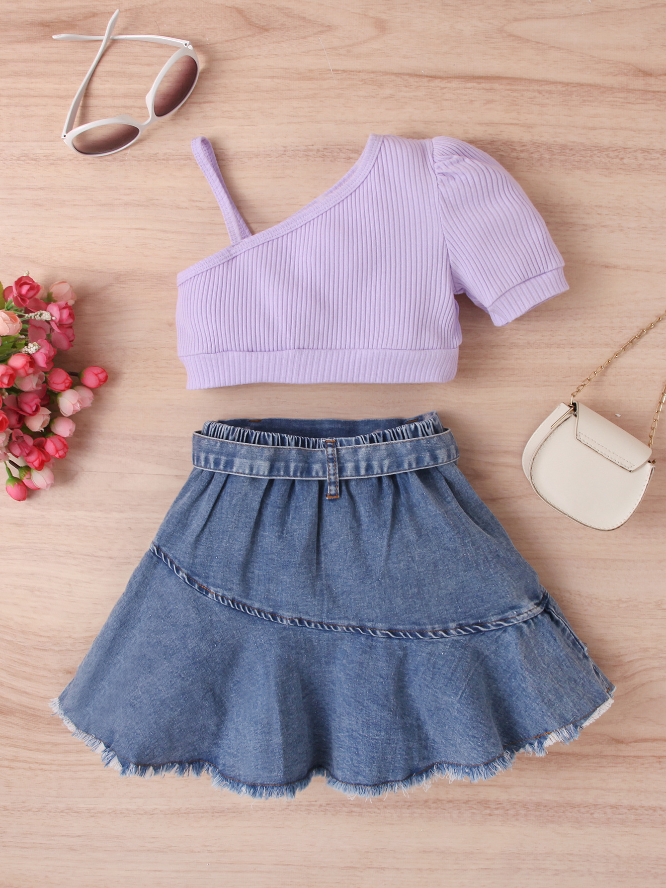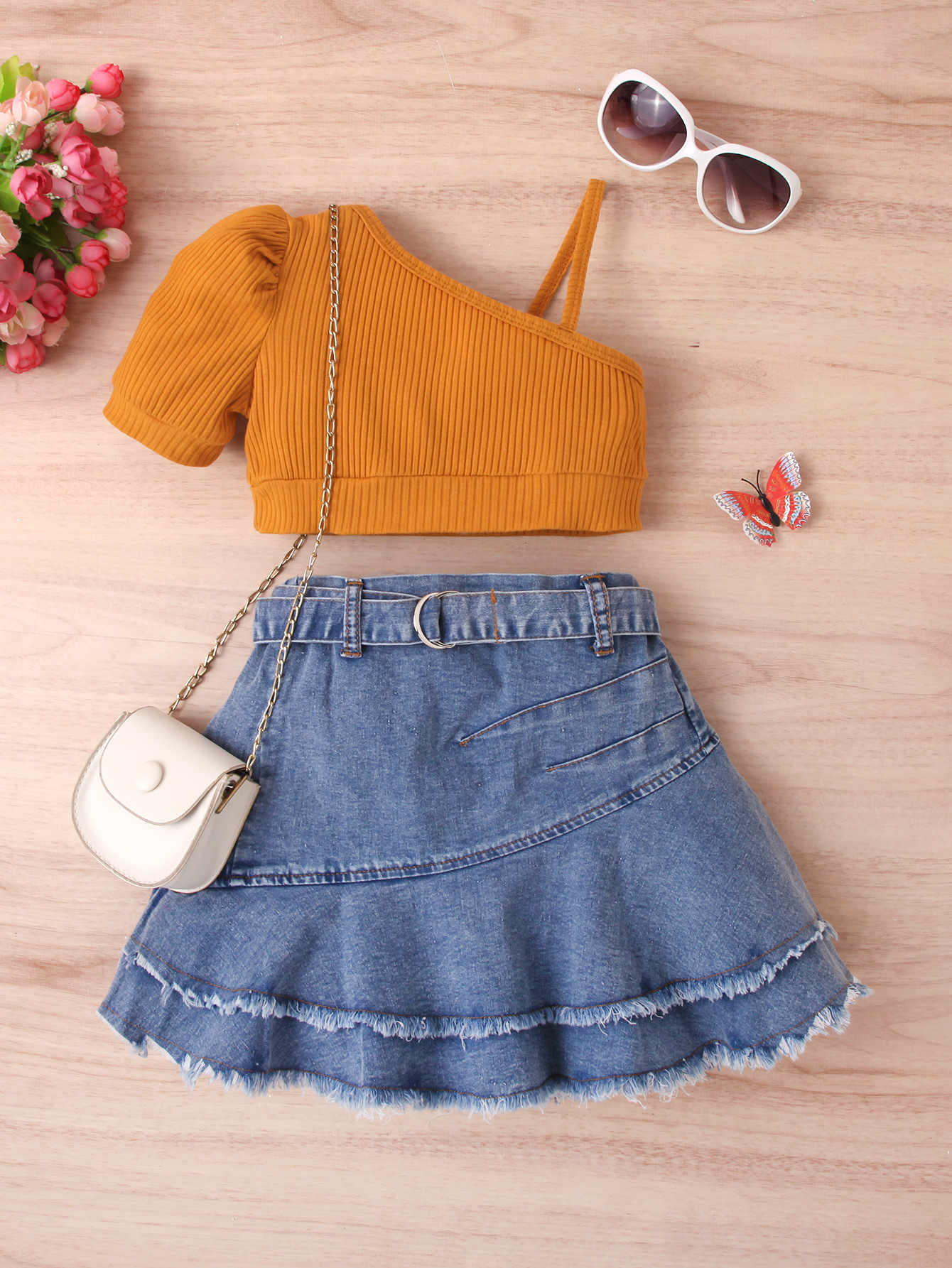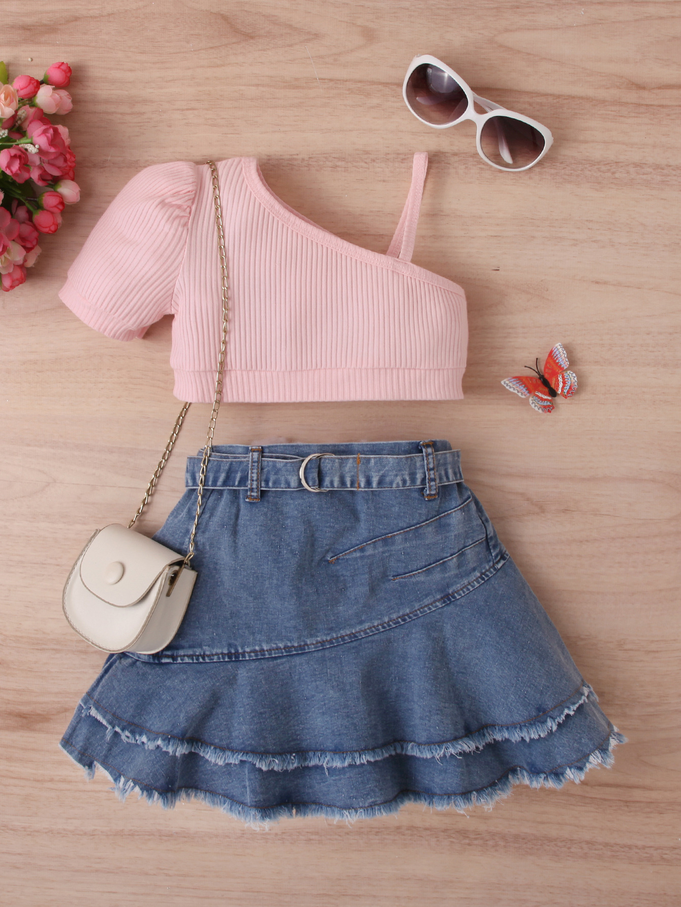아마존 국경 아동복 소녀 솔리드 컬러 웨이스트 코트 짧은 소매 탑 데님 오픈 백 주름 치마 세트 벨트