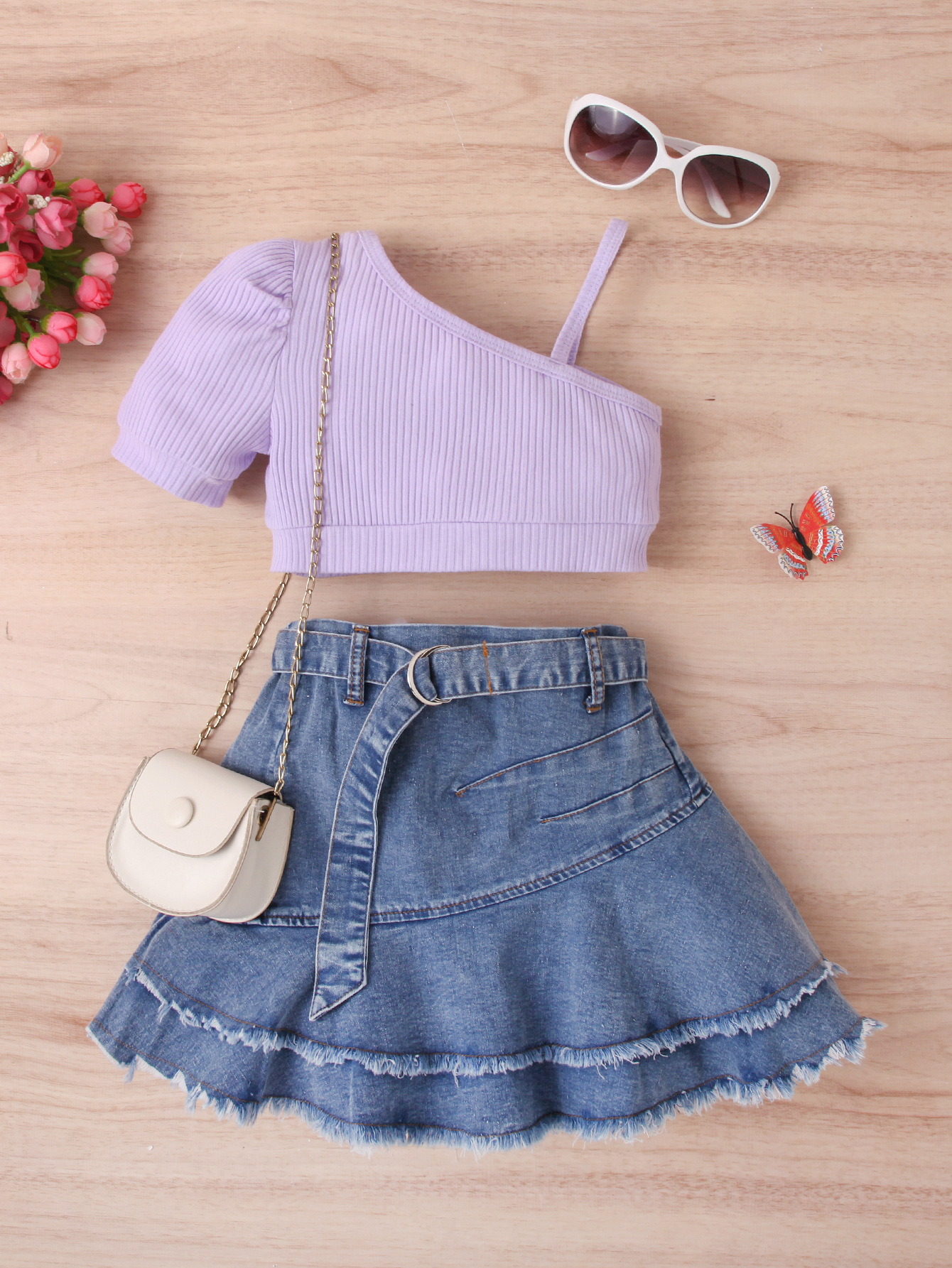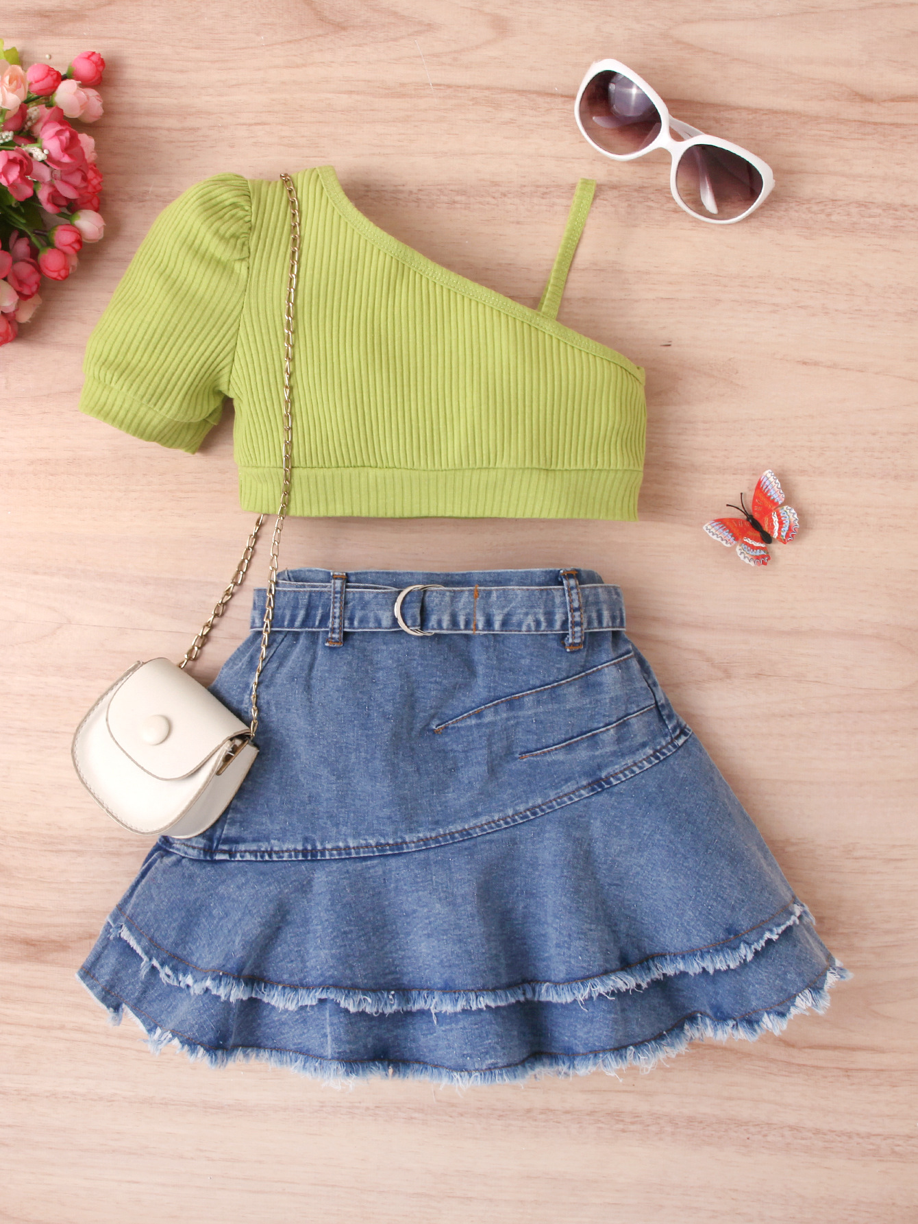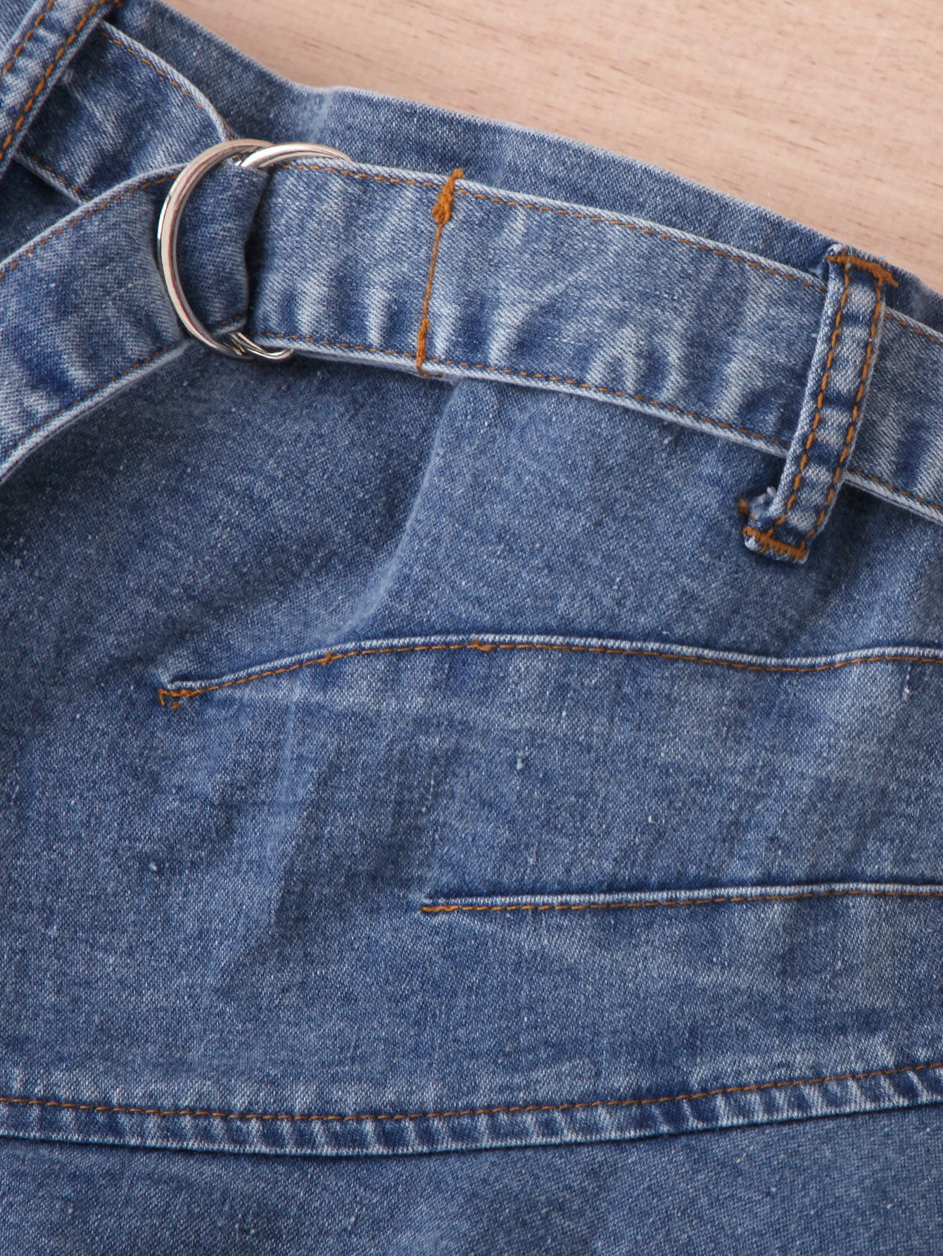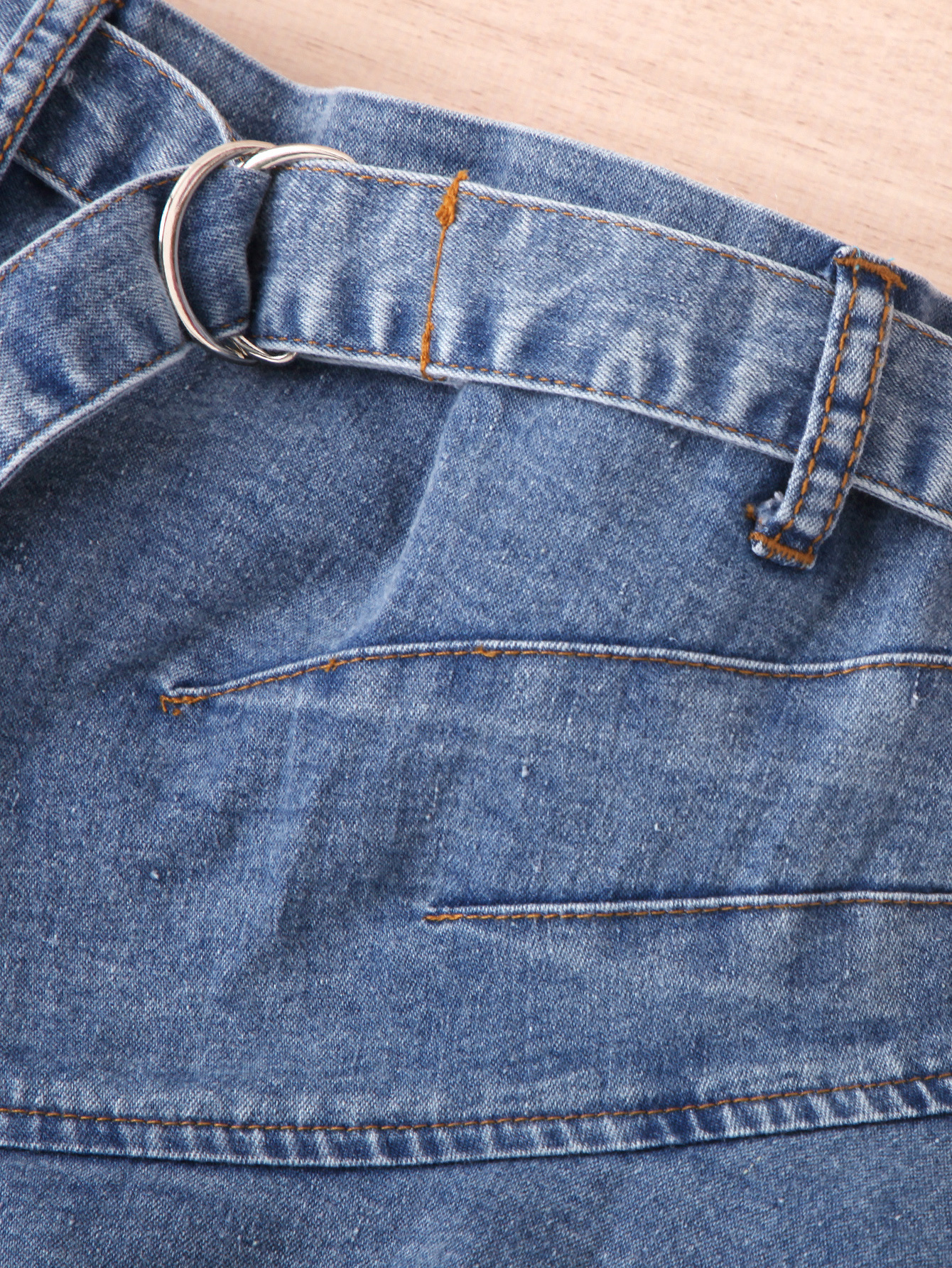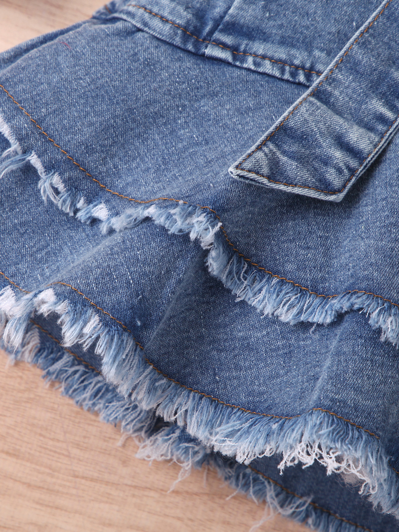 아마존 국경 아동복 소녀 솔리드 컬러 웨이스트 코트 짧은 소매 탑 데님 오픈 백 주름 치마 세트 벨트