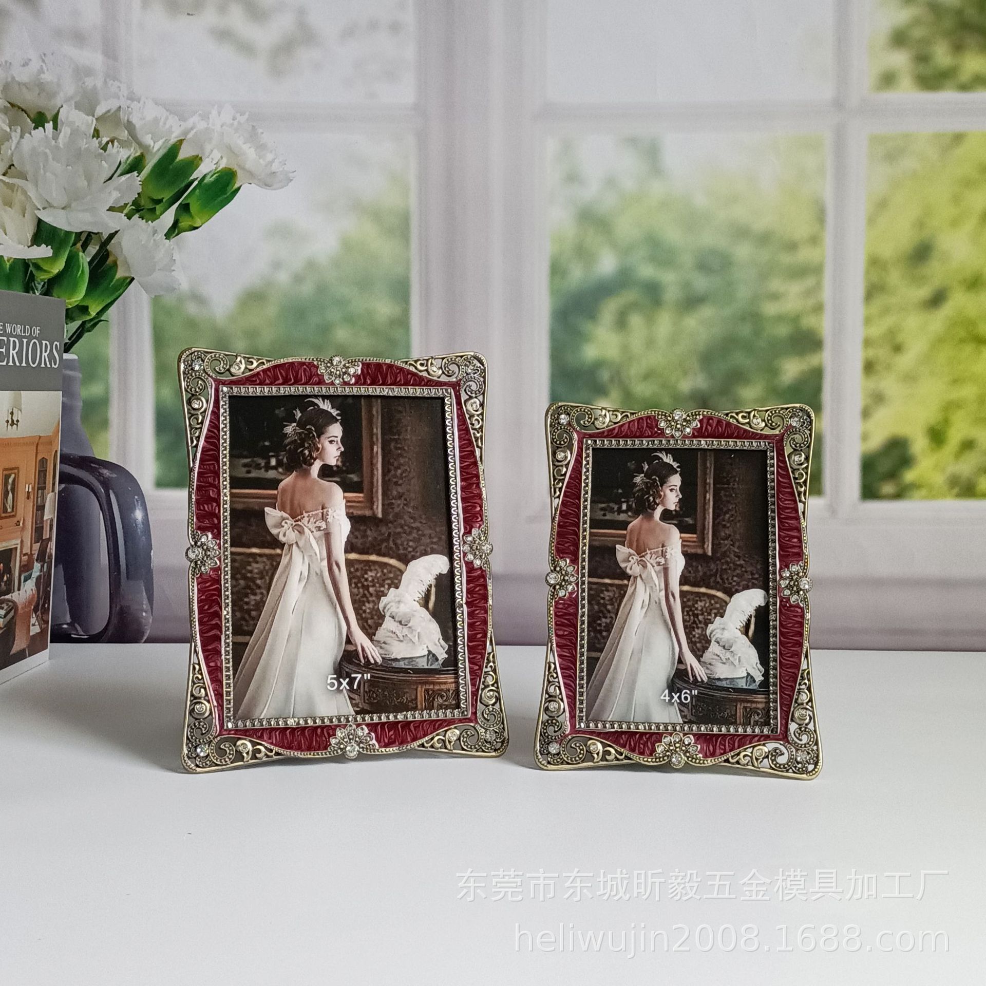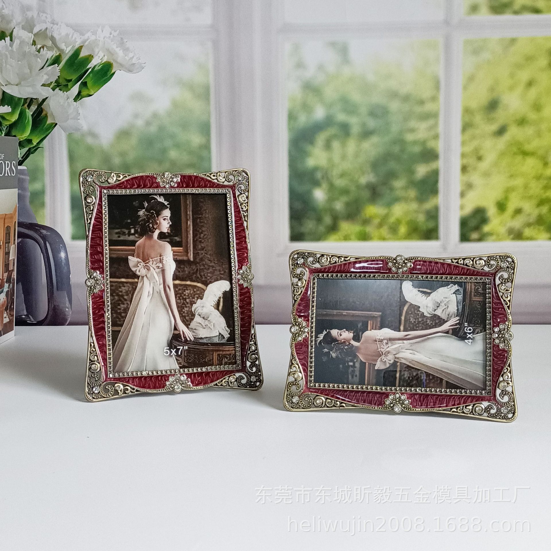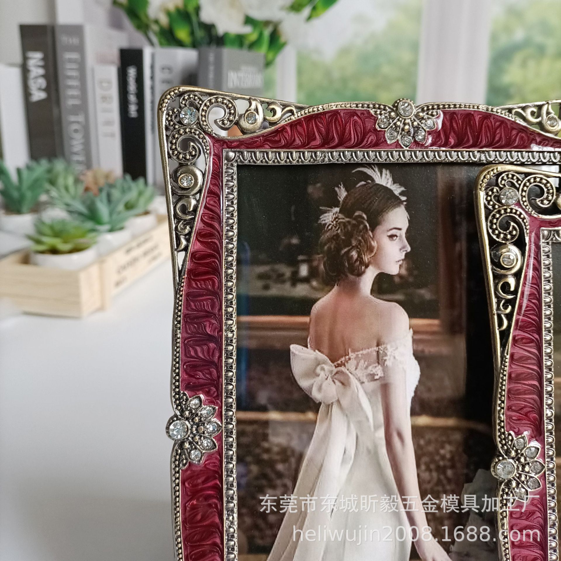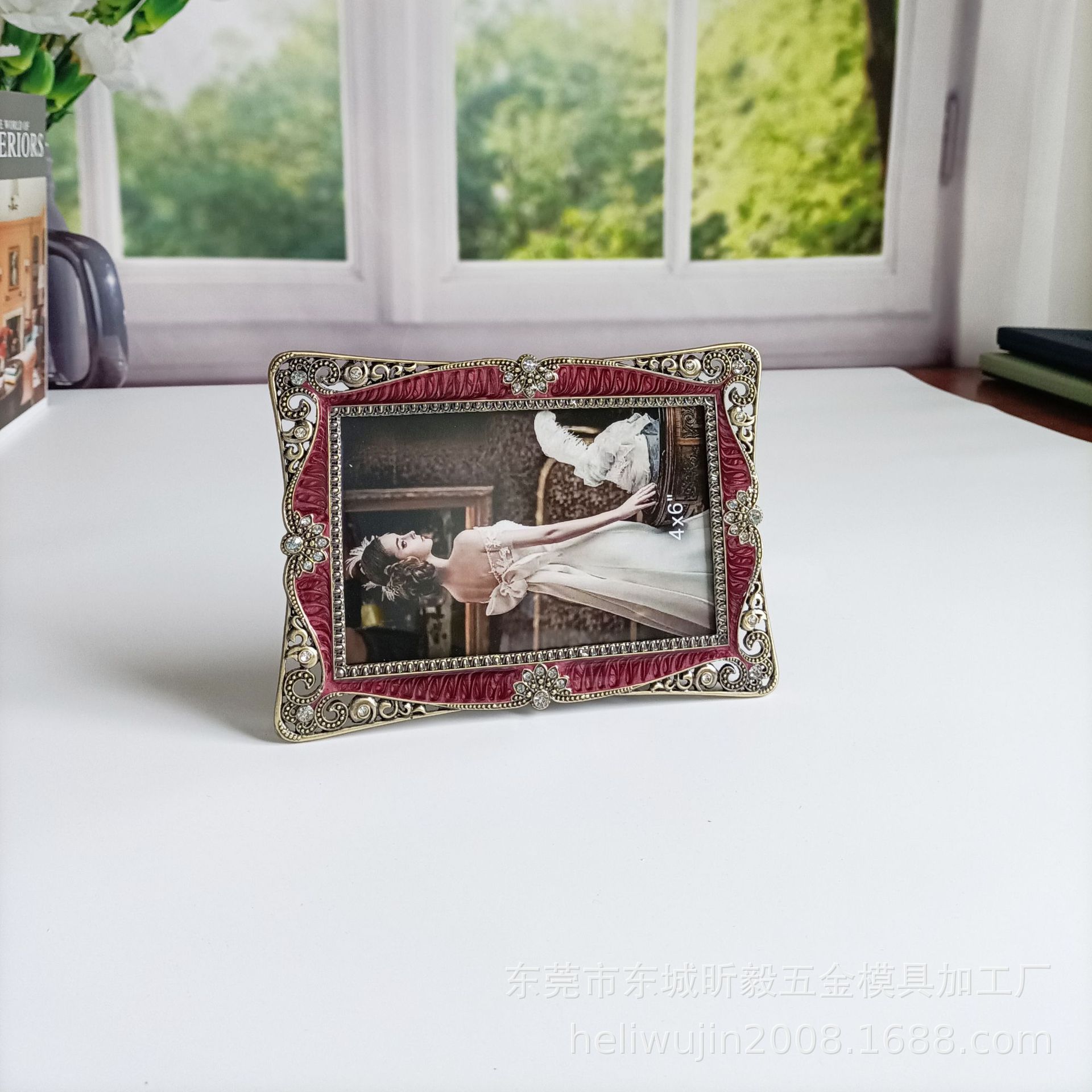에나멜 버건디 청동 금속 포토 프레임 테이블, 유럽 스타일, 가벼운 럭셔리, 금속,