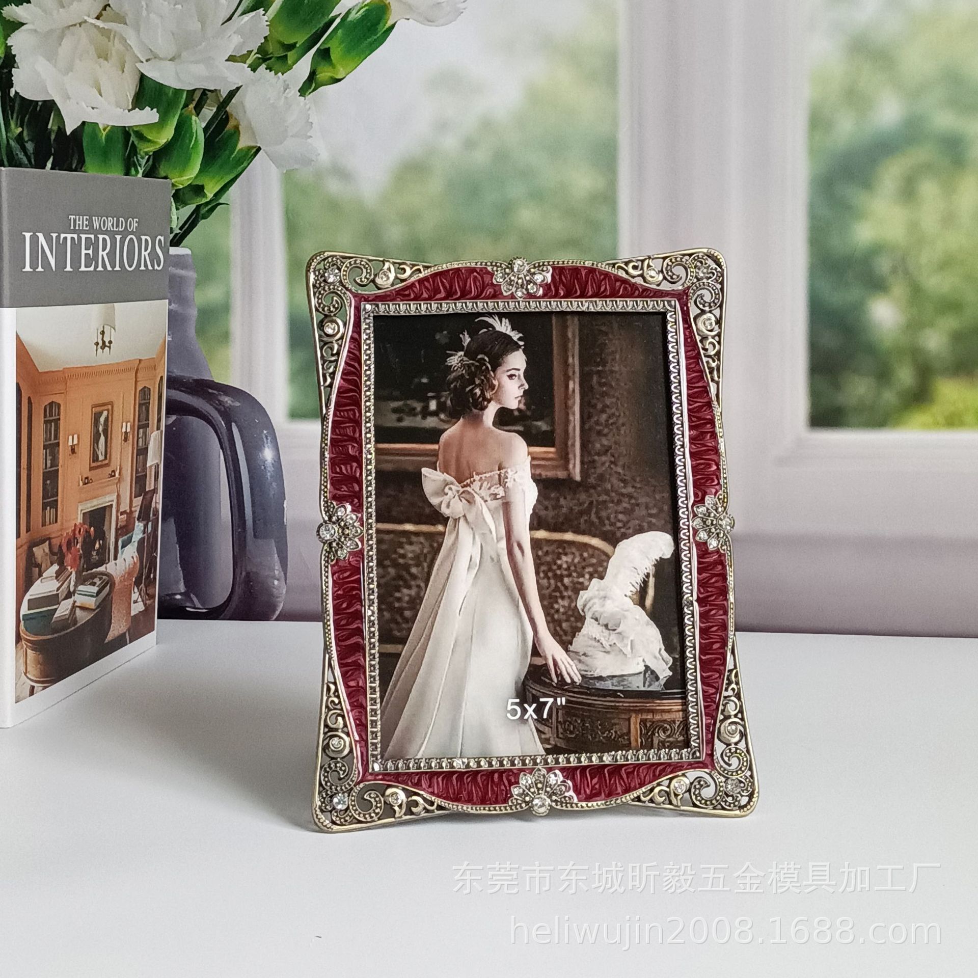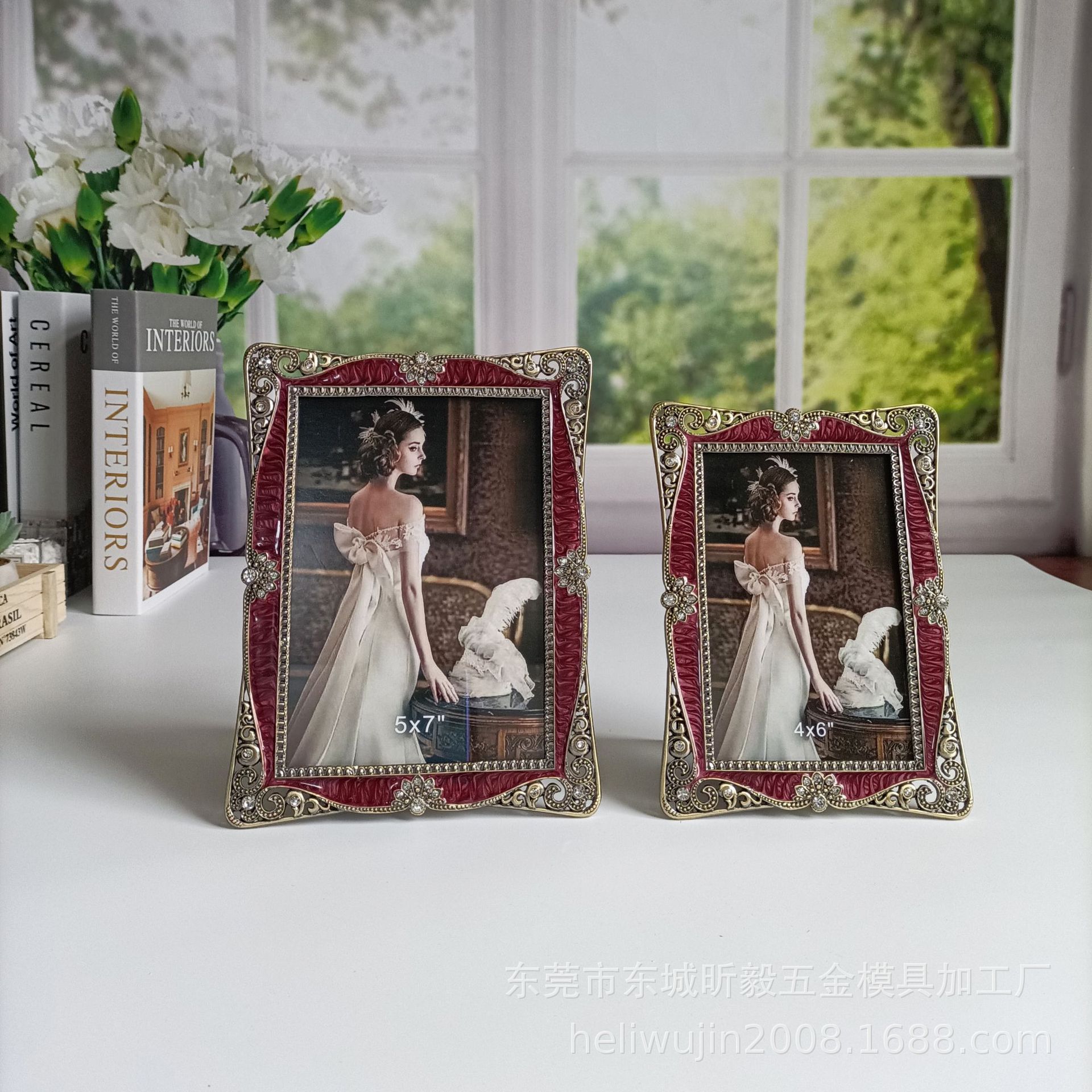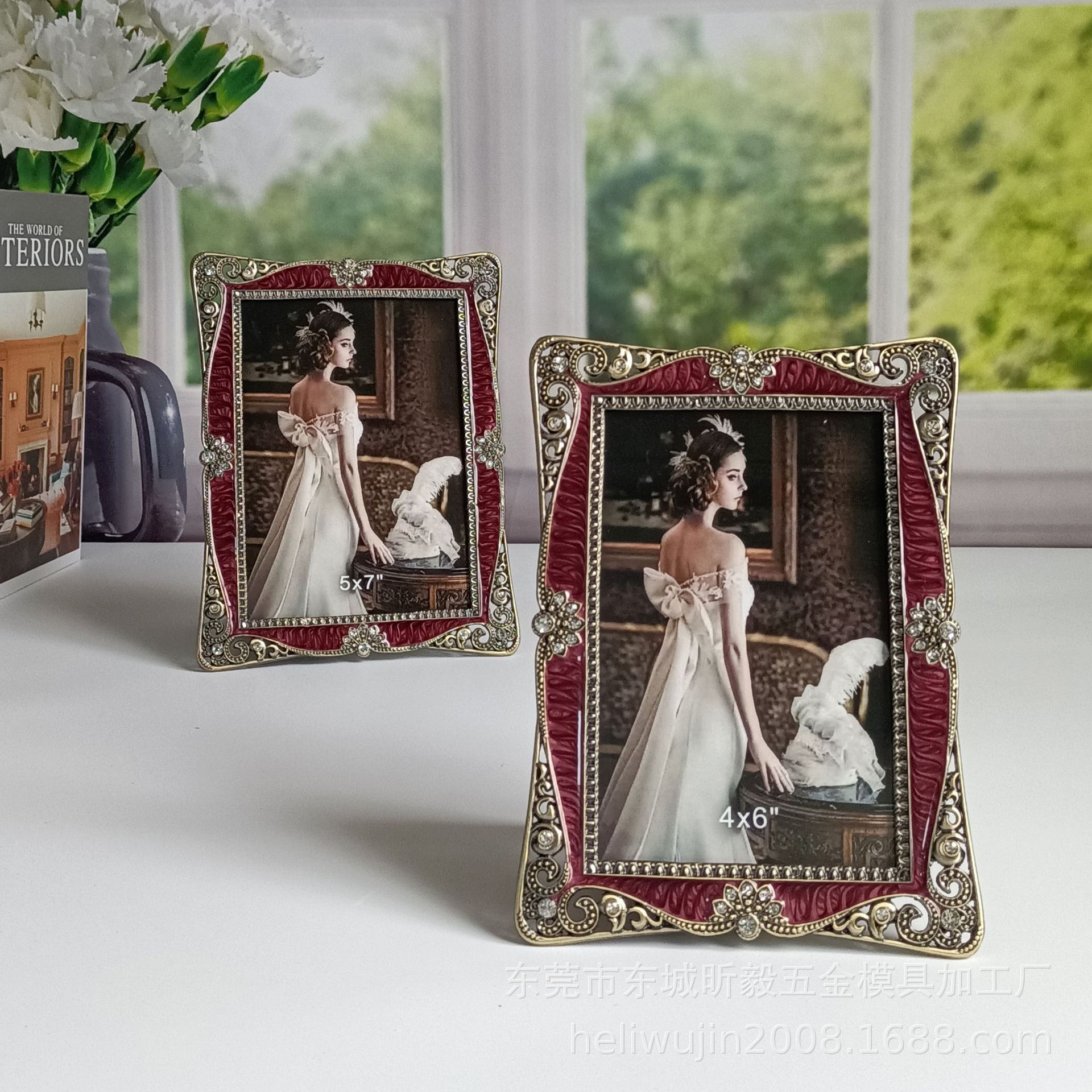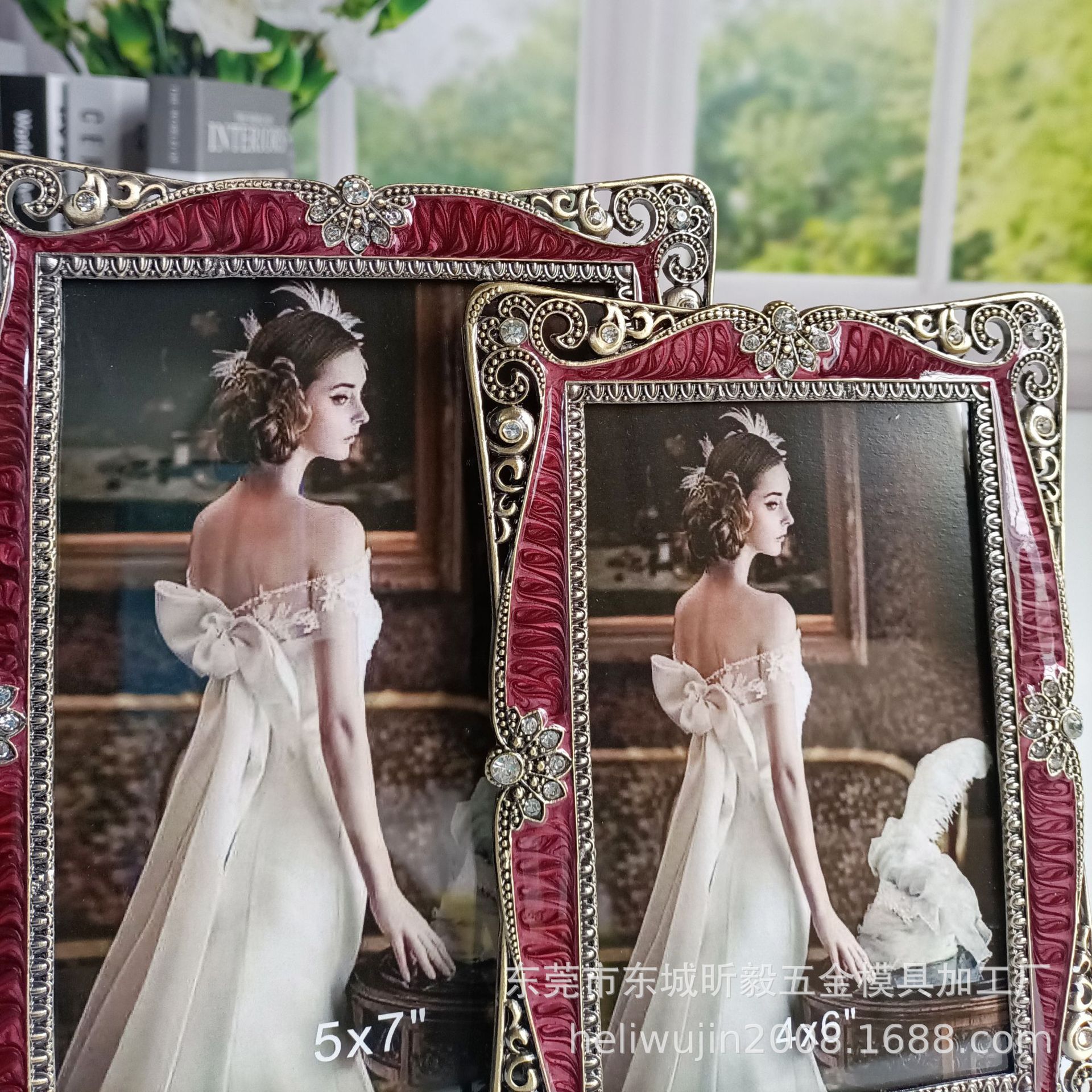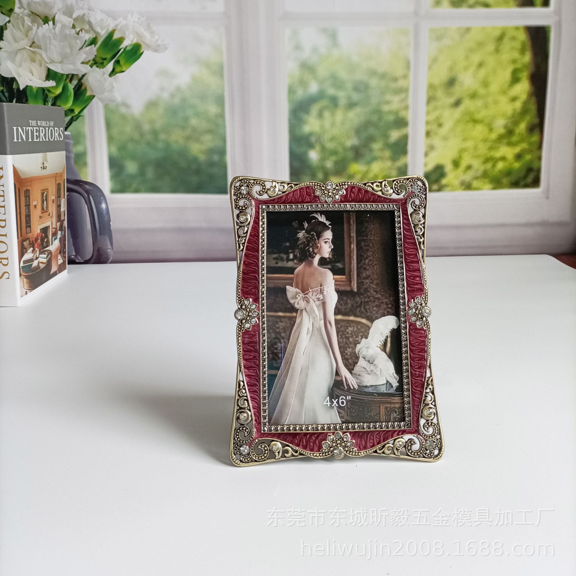 에나멜 버건디 청동 금속 포토 프레임 테이블, 유럽 스타일, 가벼운 럭셔리, 금속,