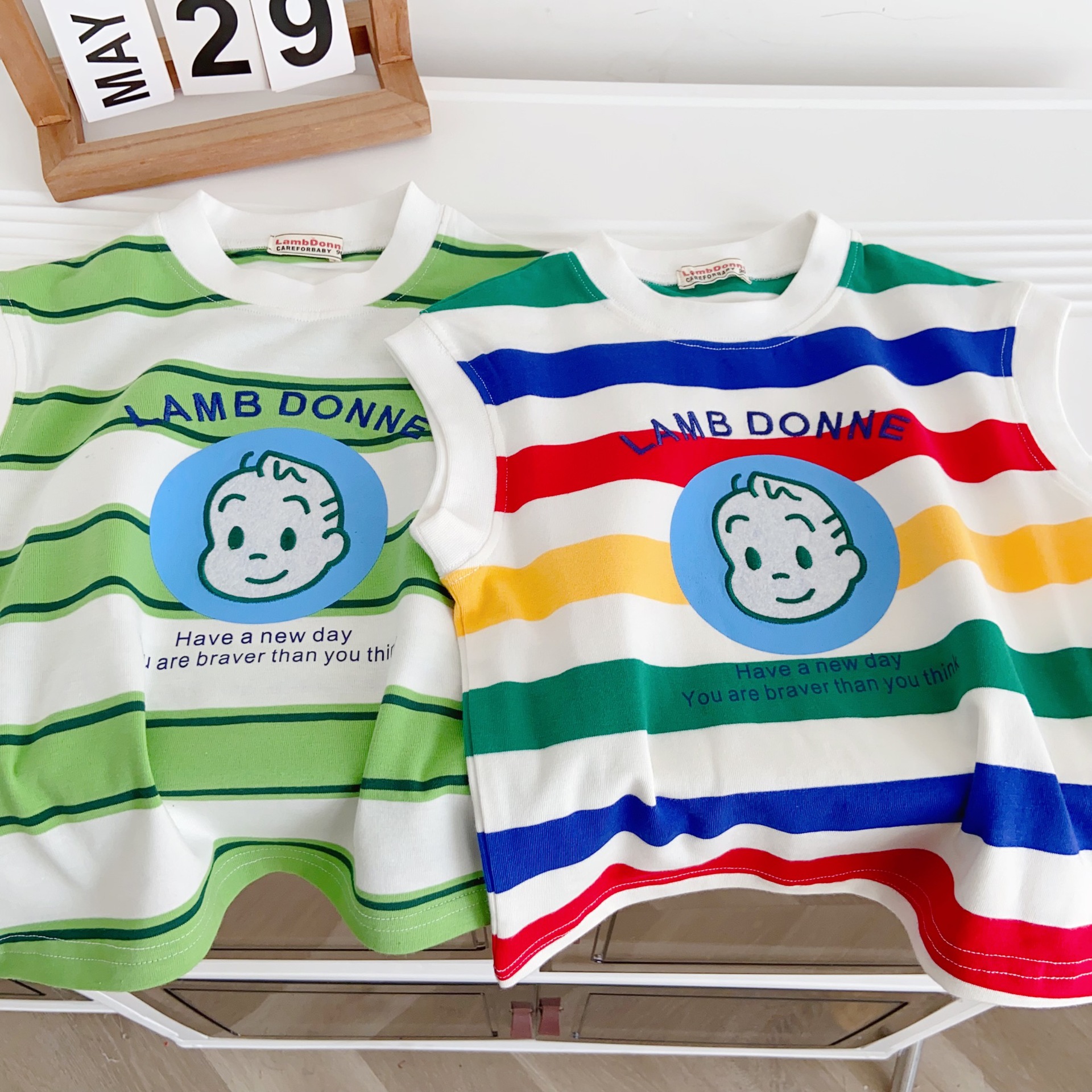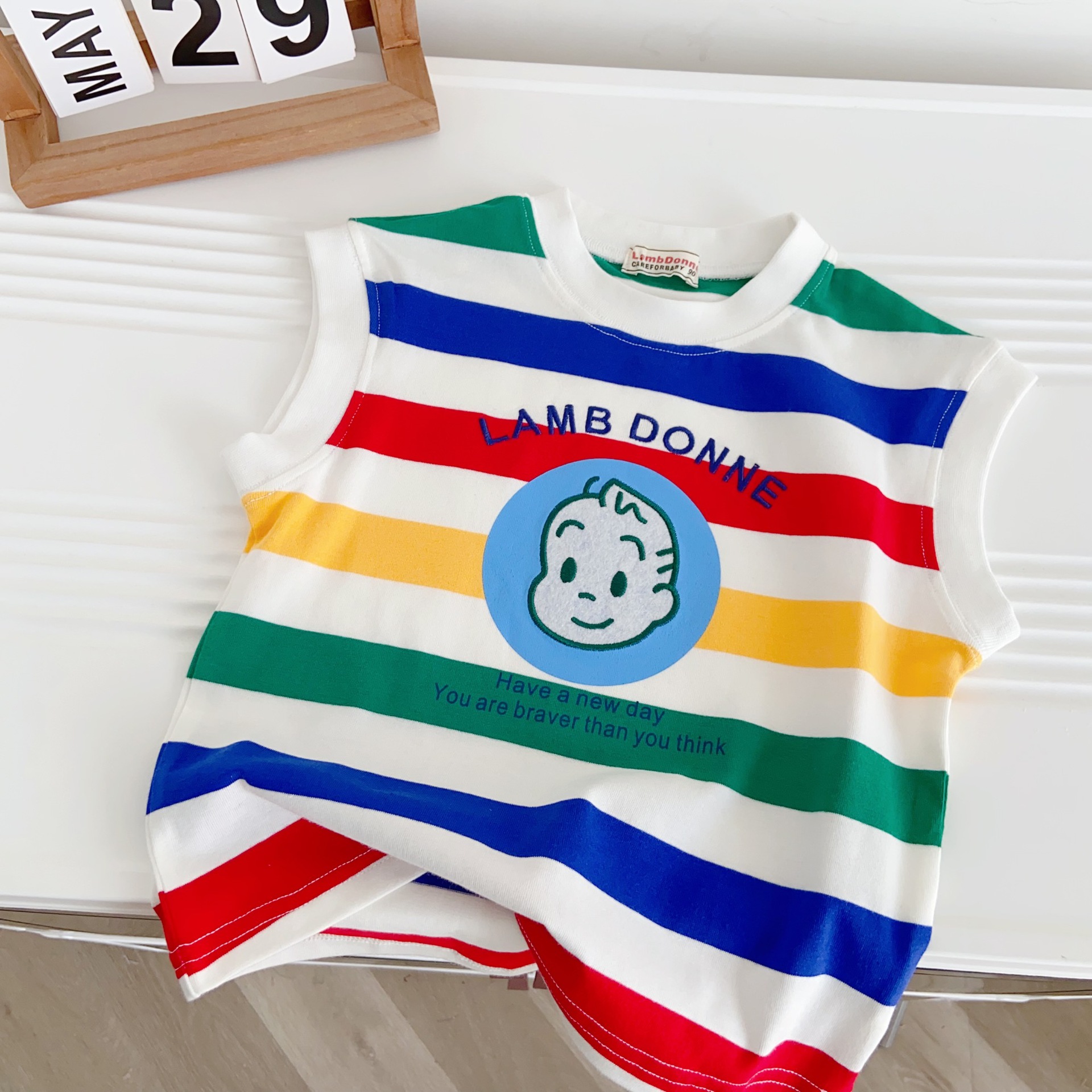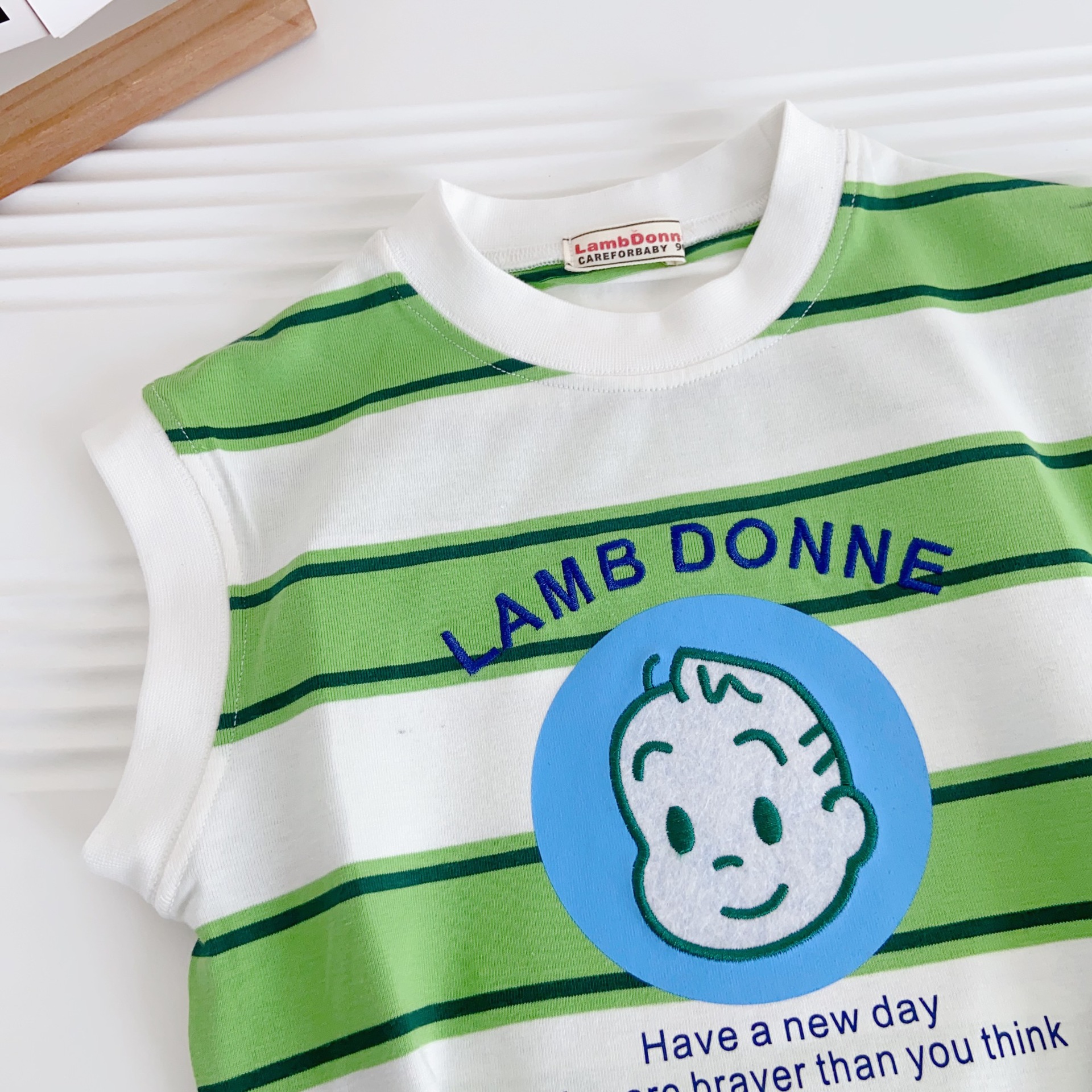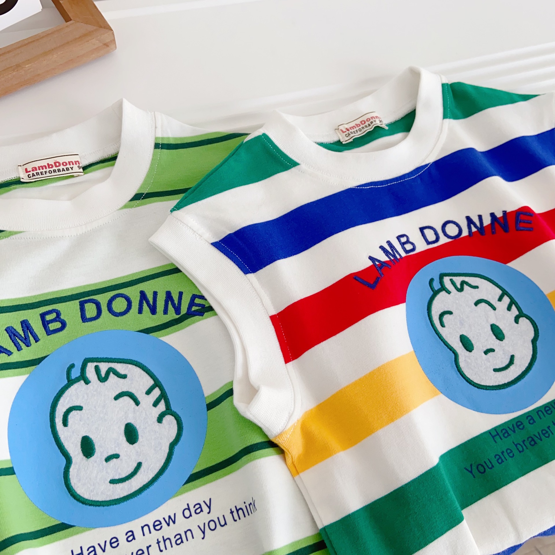 100% 면 어린이 2025 새로운 여름 소년 조끼 양복 조끼 수 놓은 줄무늬 만화 소녀 베이비 탑