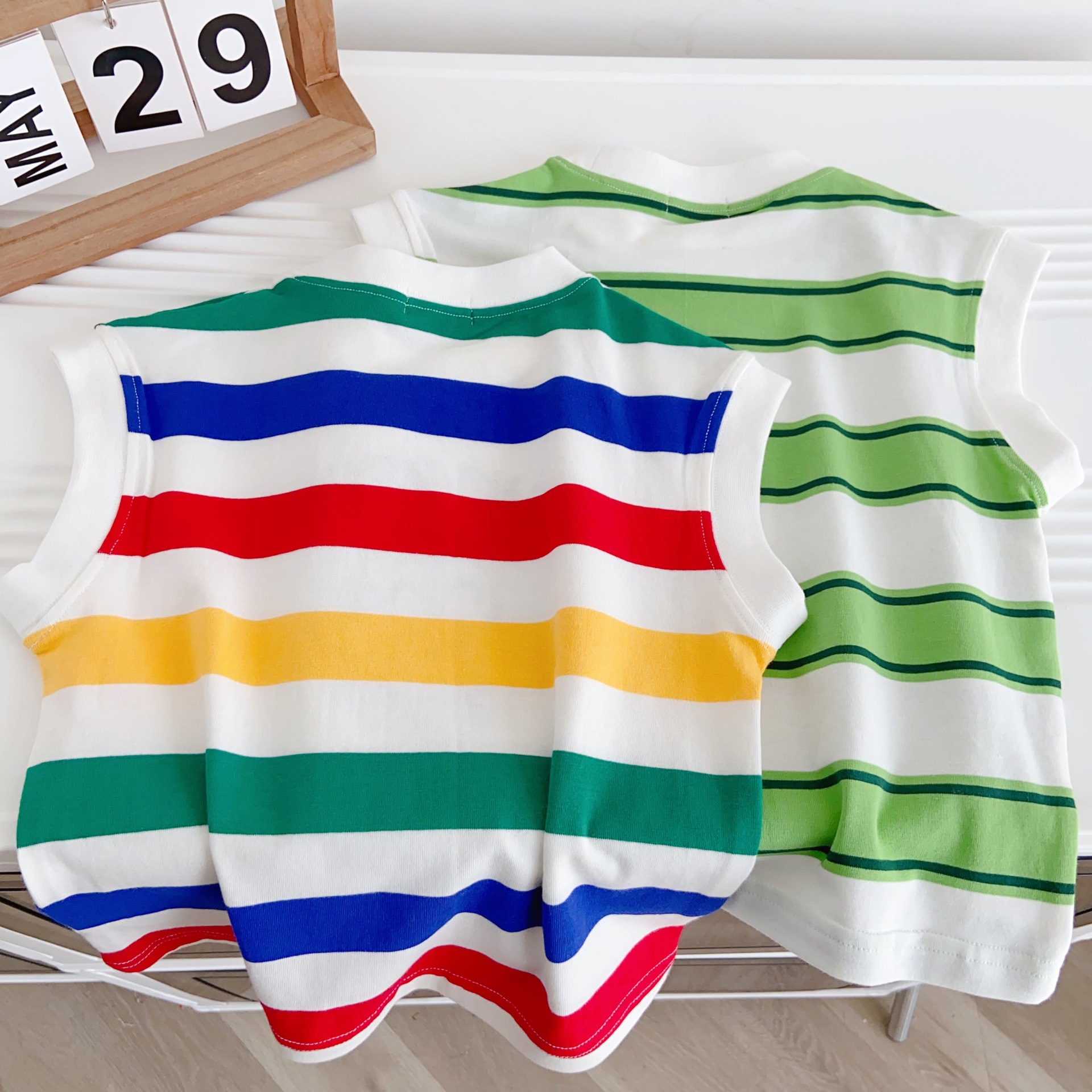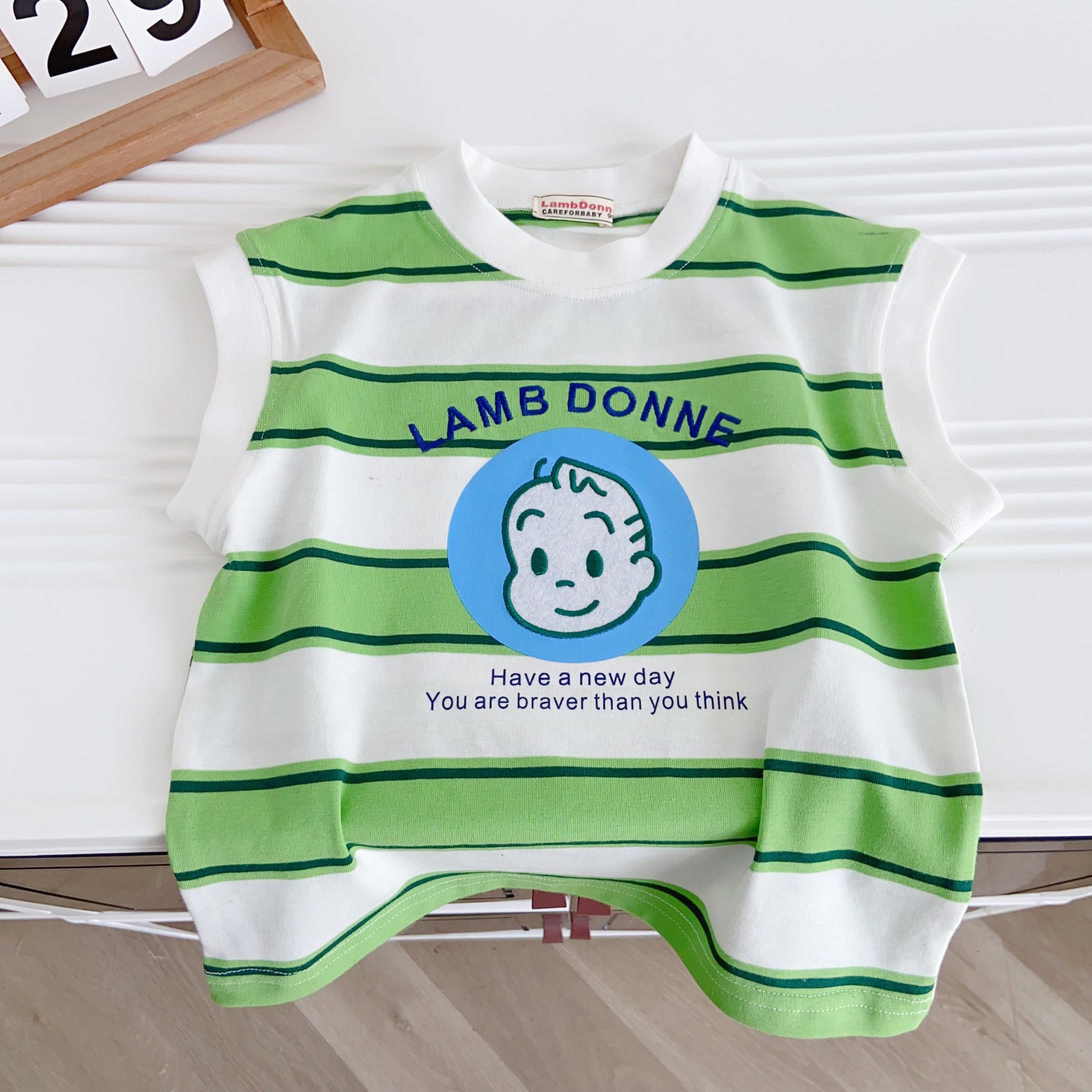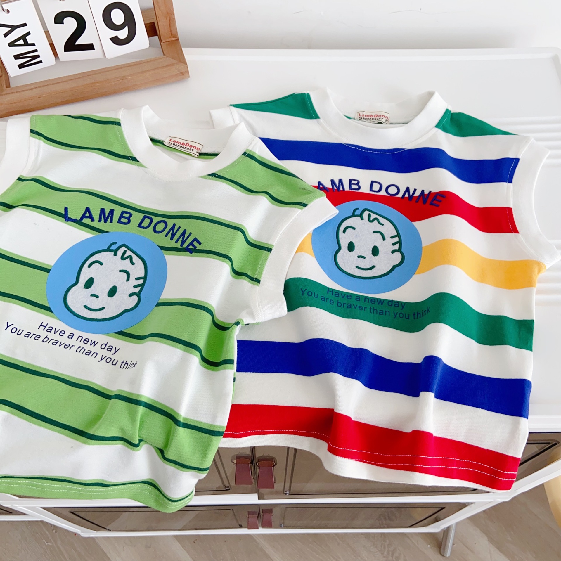 100% 면 어린이 2025 새로운 여름 소년 조끼 양복 조끼 수 놓은 줄무늬 만화 소녀 베이비 탑
