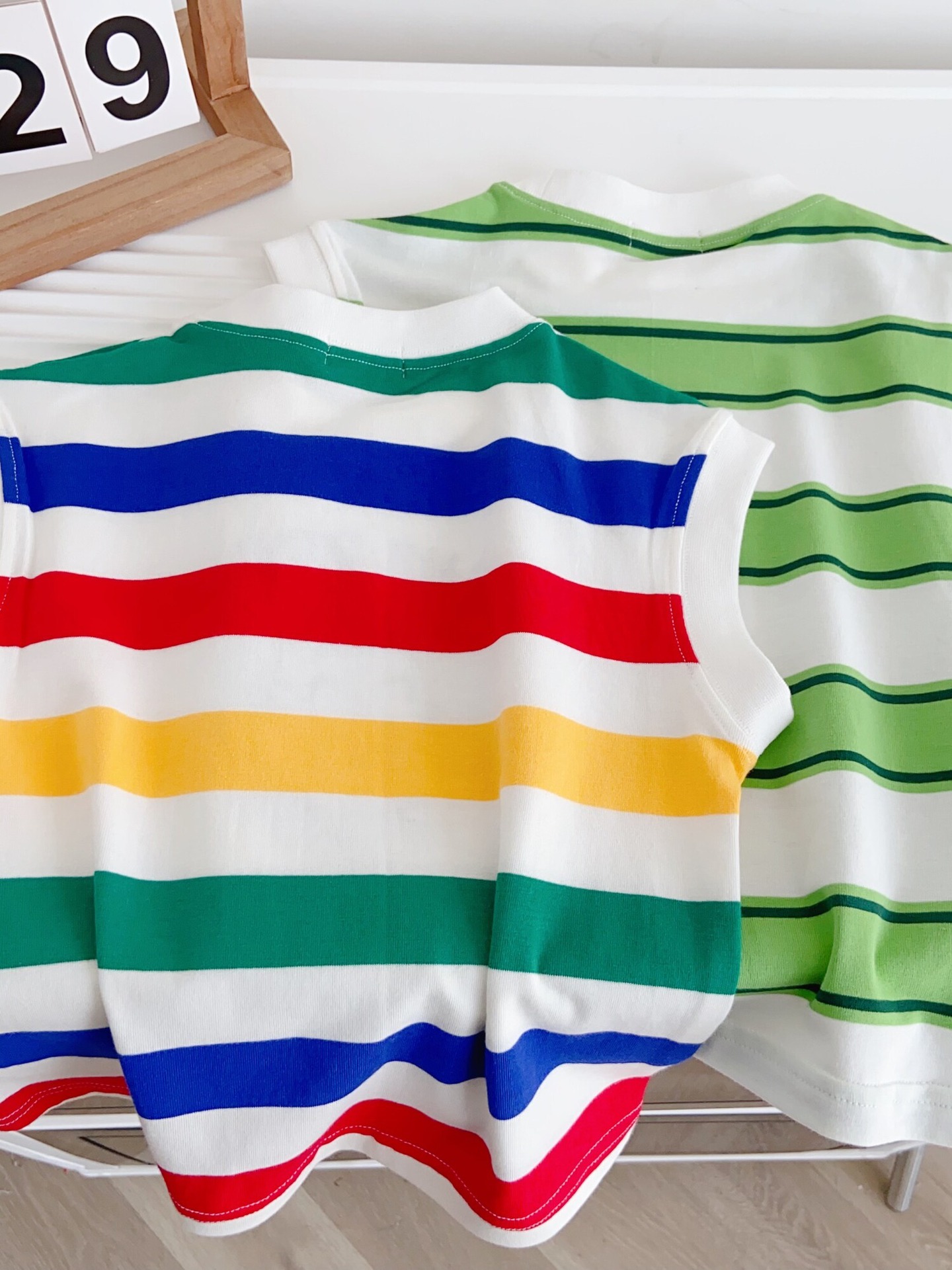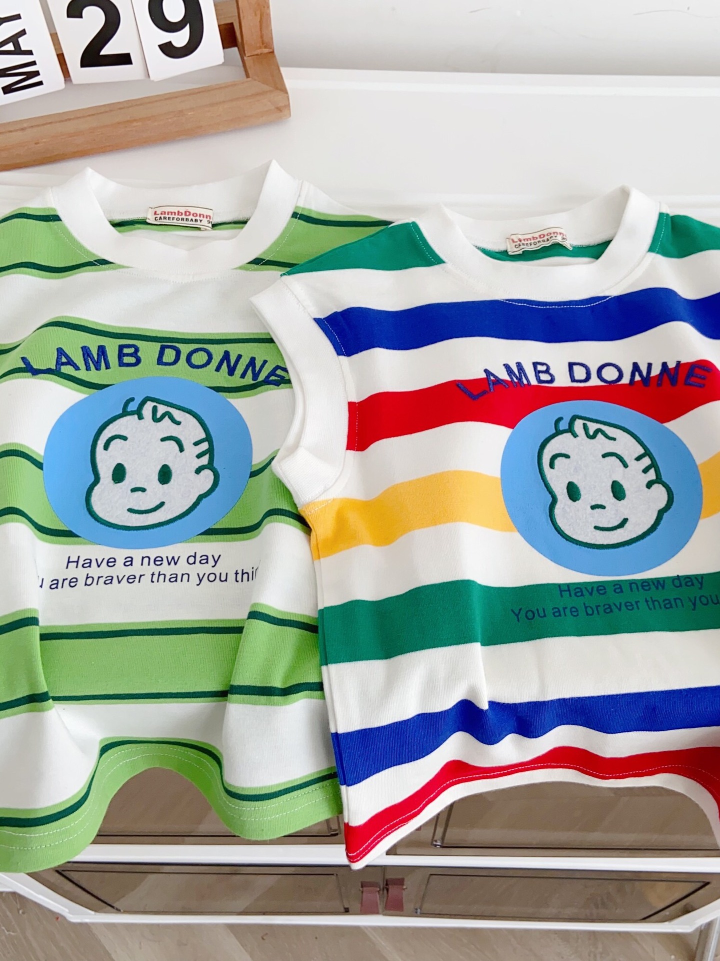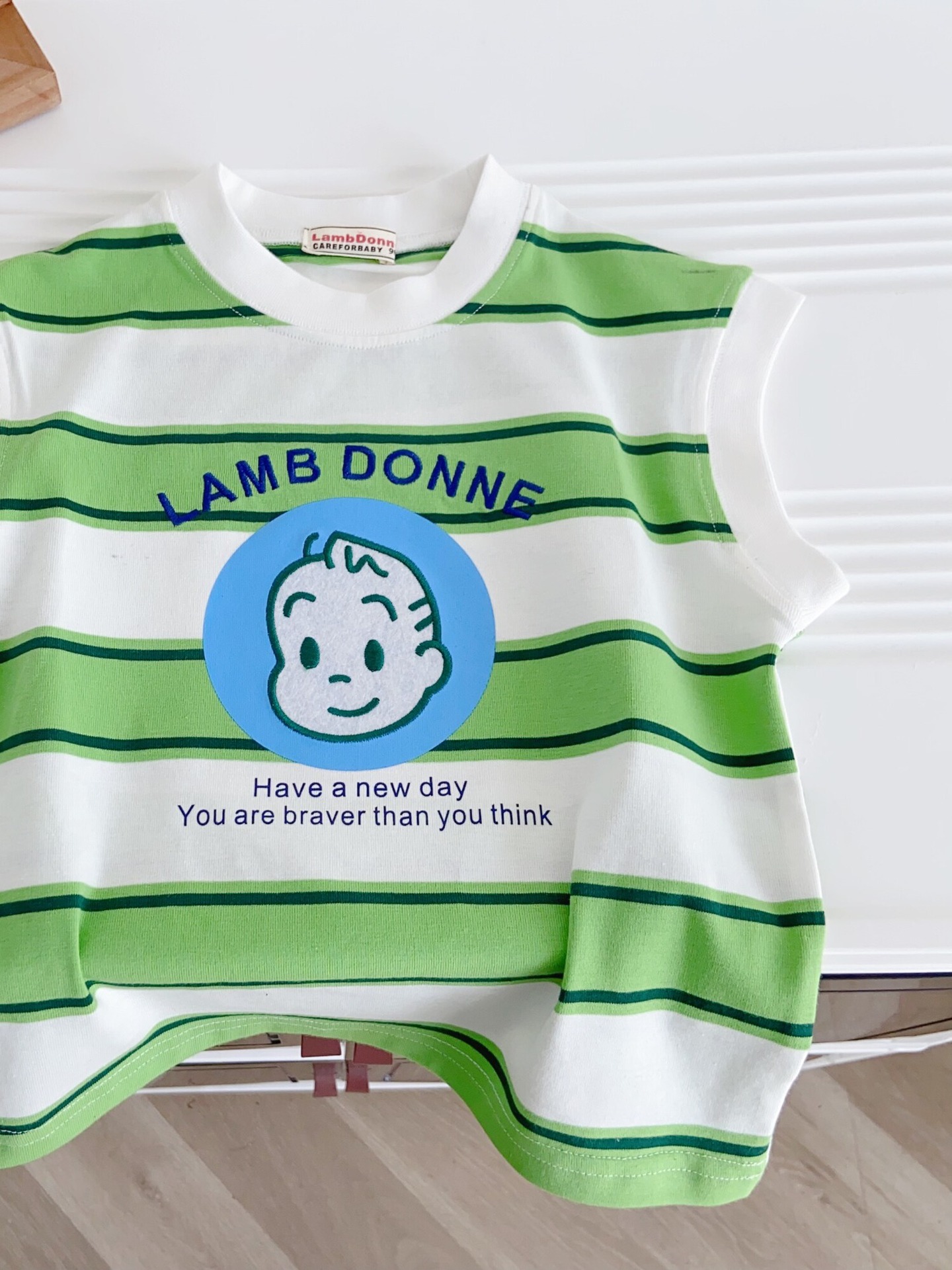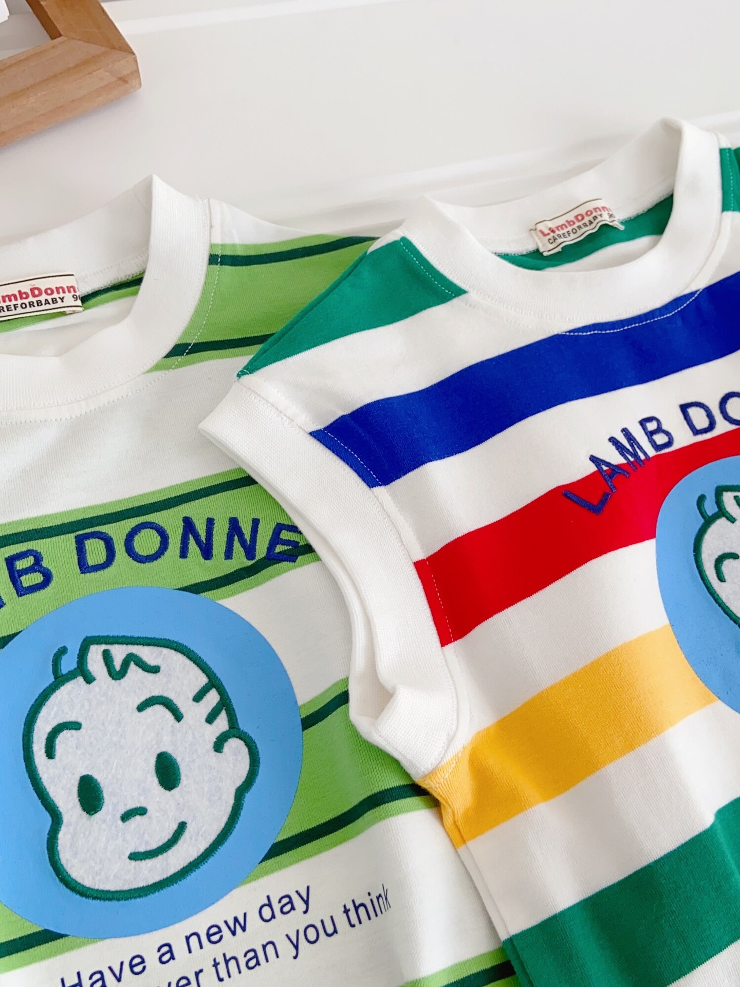 100% 면 어린이 2025 새로운 여름 소년 조끼 양복 조끼 수 놓은 줄무늬 만화 소녀 베이비 탑