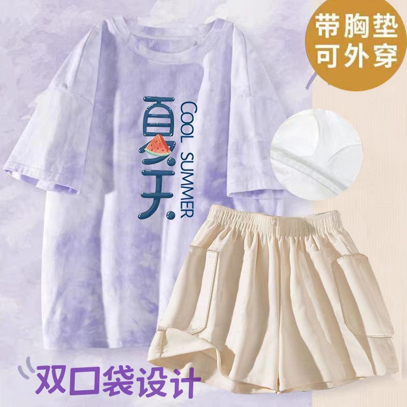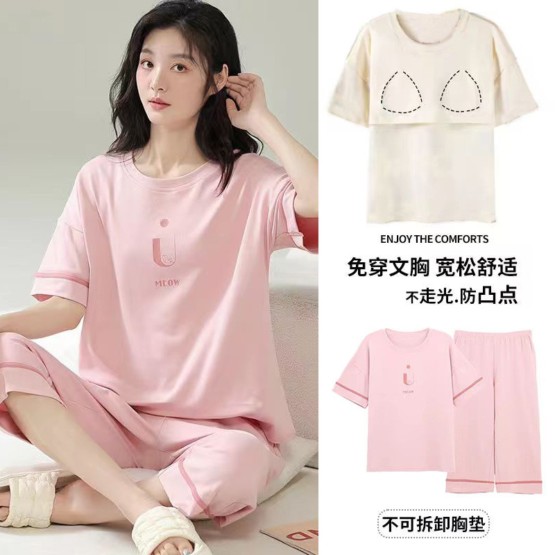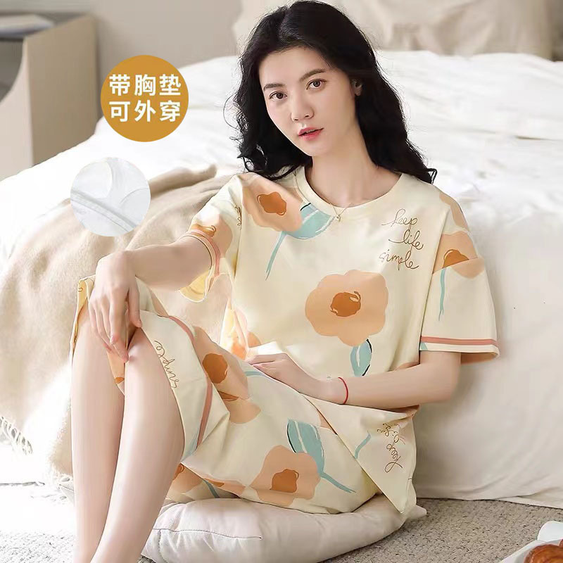 여성용 신상 여름 만화 잠옷 얇은 반팔 가슴 패드 포함 대형 사이즈 홈웨어 세트 외출용 가능