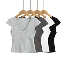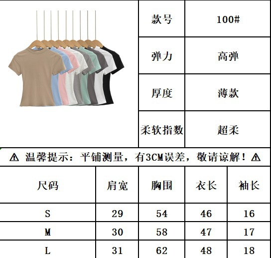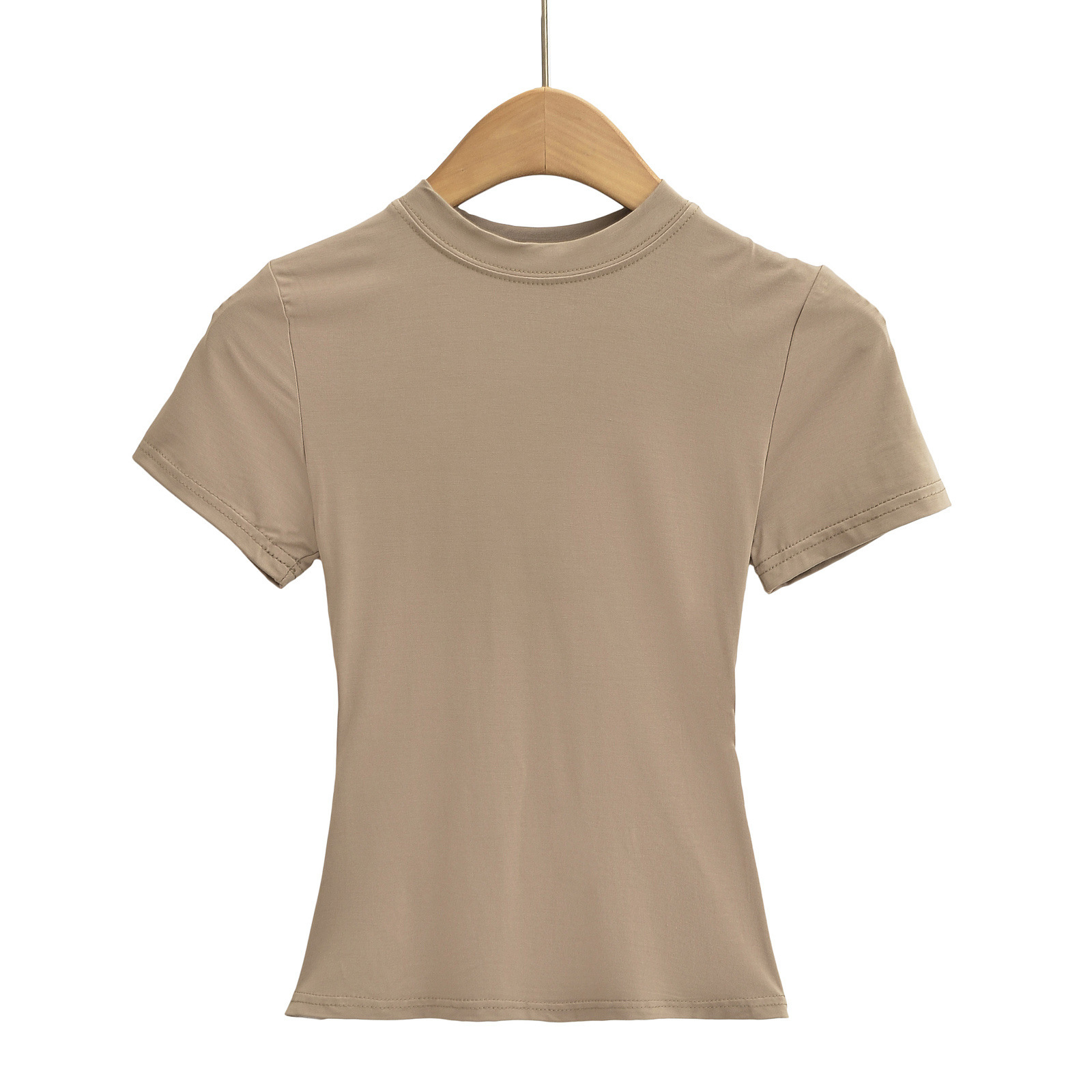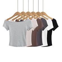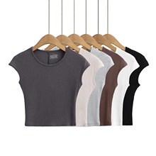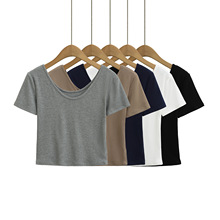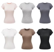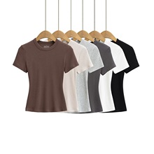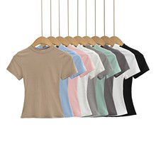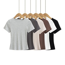 유럽과 미국의 기본 카다시안 단색 작은 둥근 목 탄성 어깨 반팔 티셔츠 여성용 여름 얇은 타이트 허리 탑스토어 가기