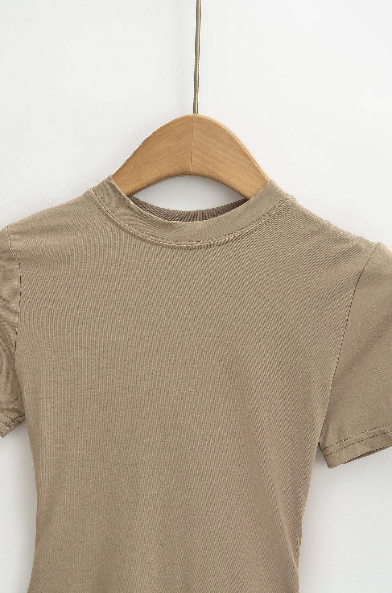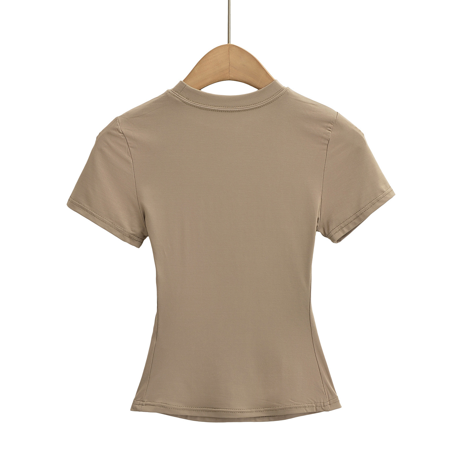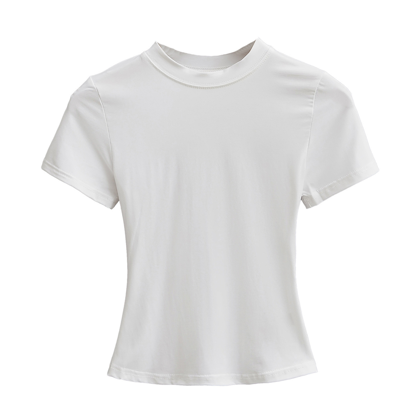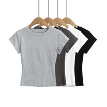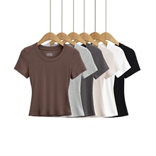 유럽과 미국의 기본 카다시안 단색 작은 둥근 목 탄성 어깨 반팔 티셔츠 여성용 여름 얇은 타이트 허리 탑