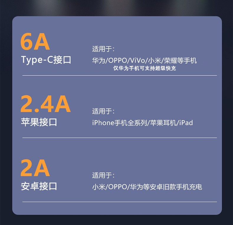【使用说明】:此产品Type-c接口支持华为!快充协议,同时可以支持市面上部分手机显示快速充电功能,但需要搭配大功率充电头(66w及以上的高瓦数充电头)才会显示快充!!!!建议搭配120w充电器使用