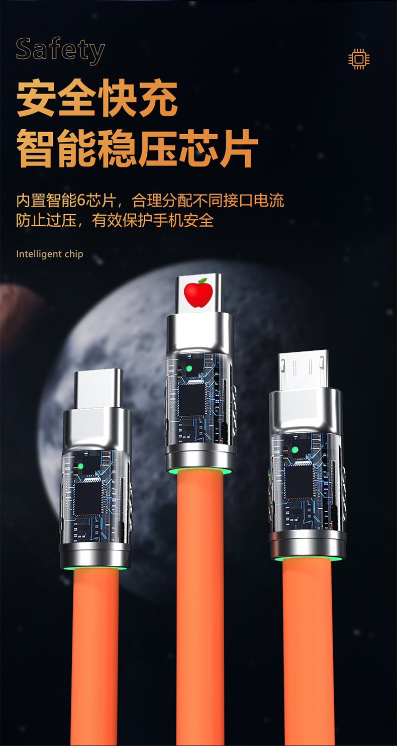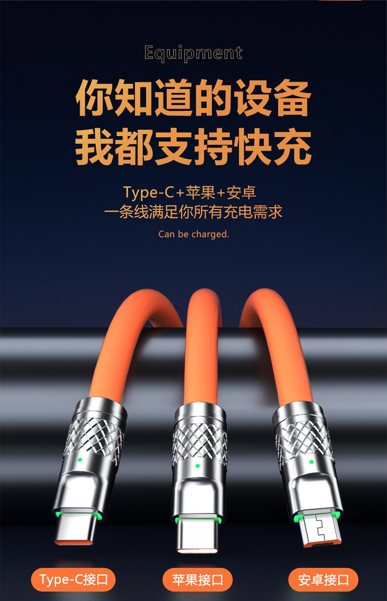 【产品亮点】:一线三头设计,一条线解决所有手机充电,硅胶加粗手感更好,耐拉伸,防缠绕,智能涓流,Type-c接口支持数据传输