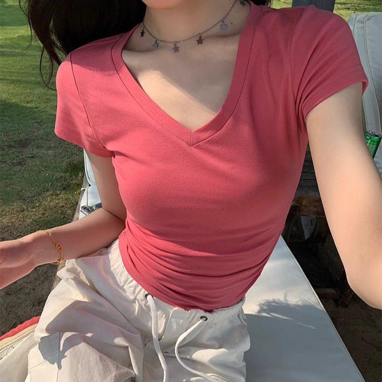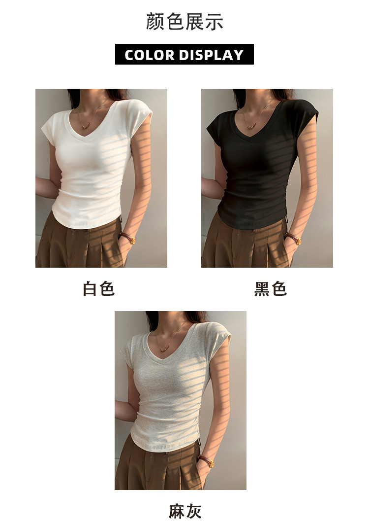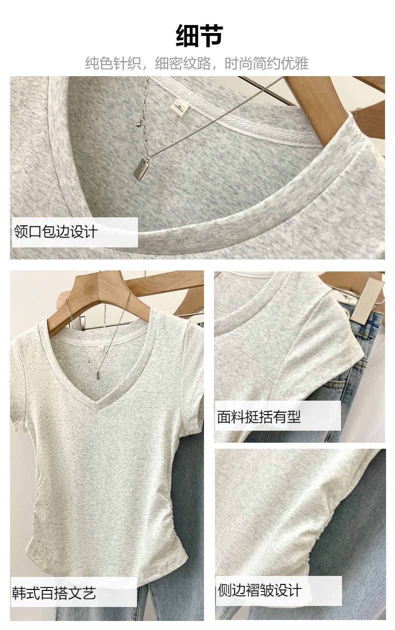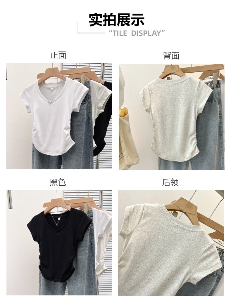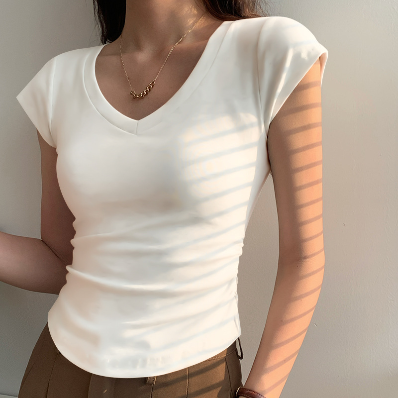 새로운 코튼 숄더 V 넥 반팔 티셔츠 여성용 고급 슬림 핏 슬리밍 쇄골 사이드 플리츠 유행의베이스 탑스토어 가기