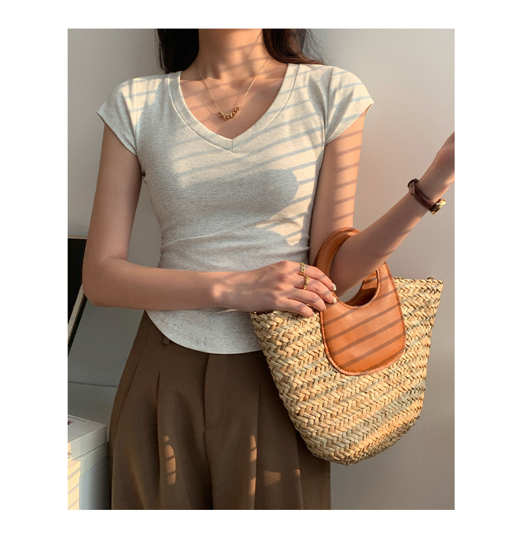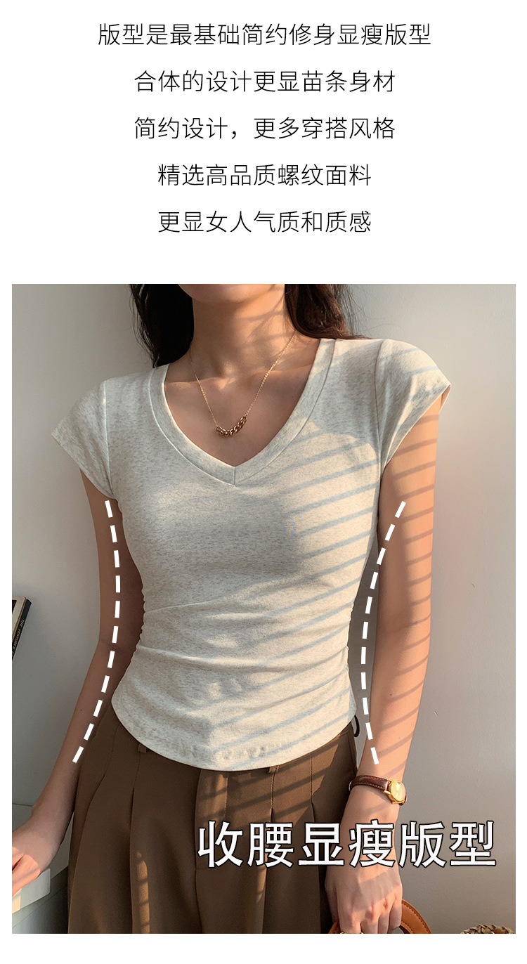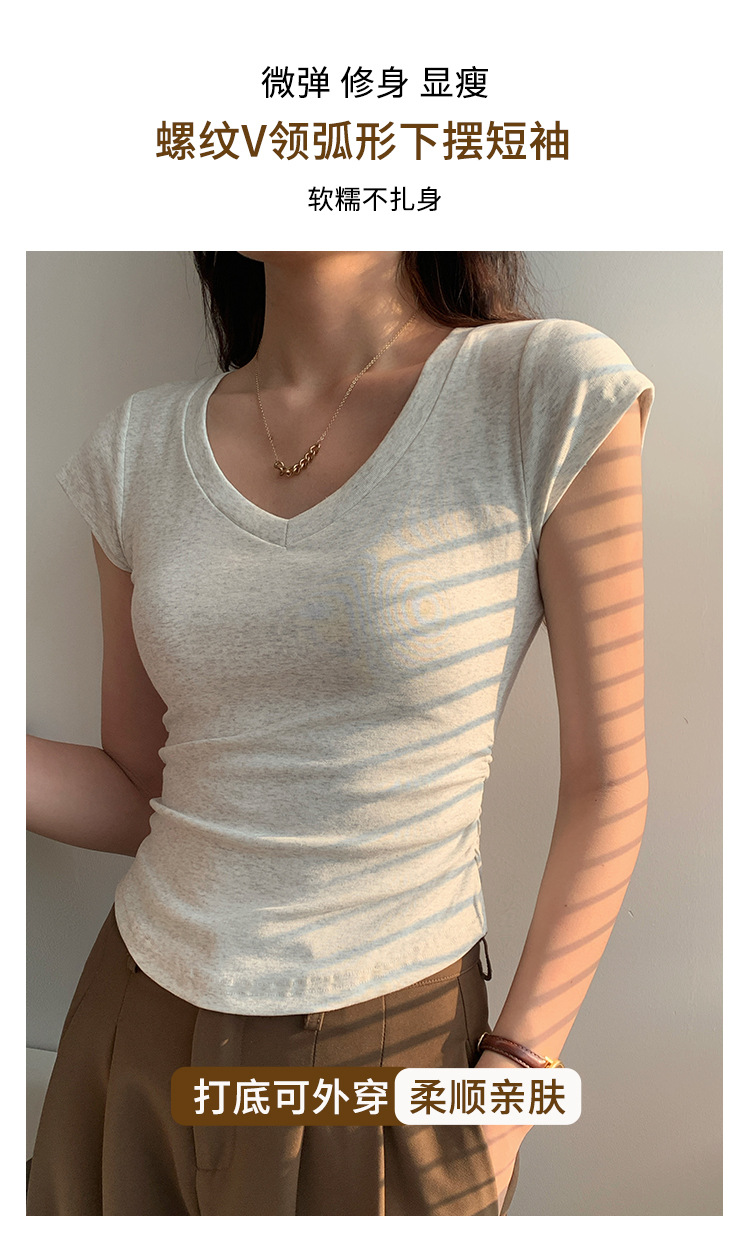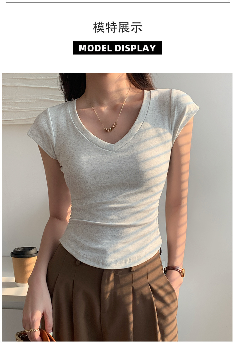 새로운 코튼 숄더 V 넥 반팔 티셔츠 여성용 고급 슬림 핏 슬리밍 쇄골 사이드 플리츠 유행의베이스 탑스토어 가기