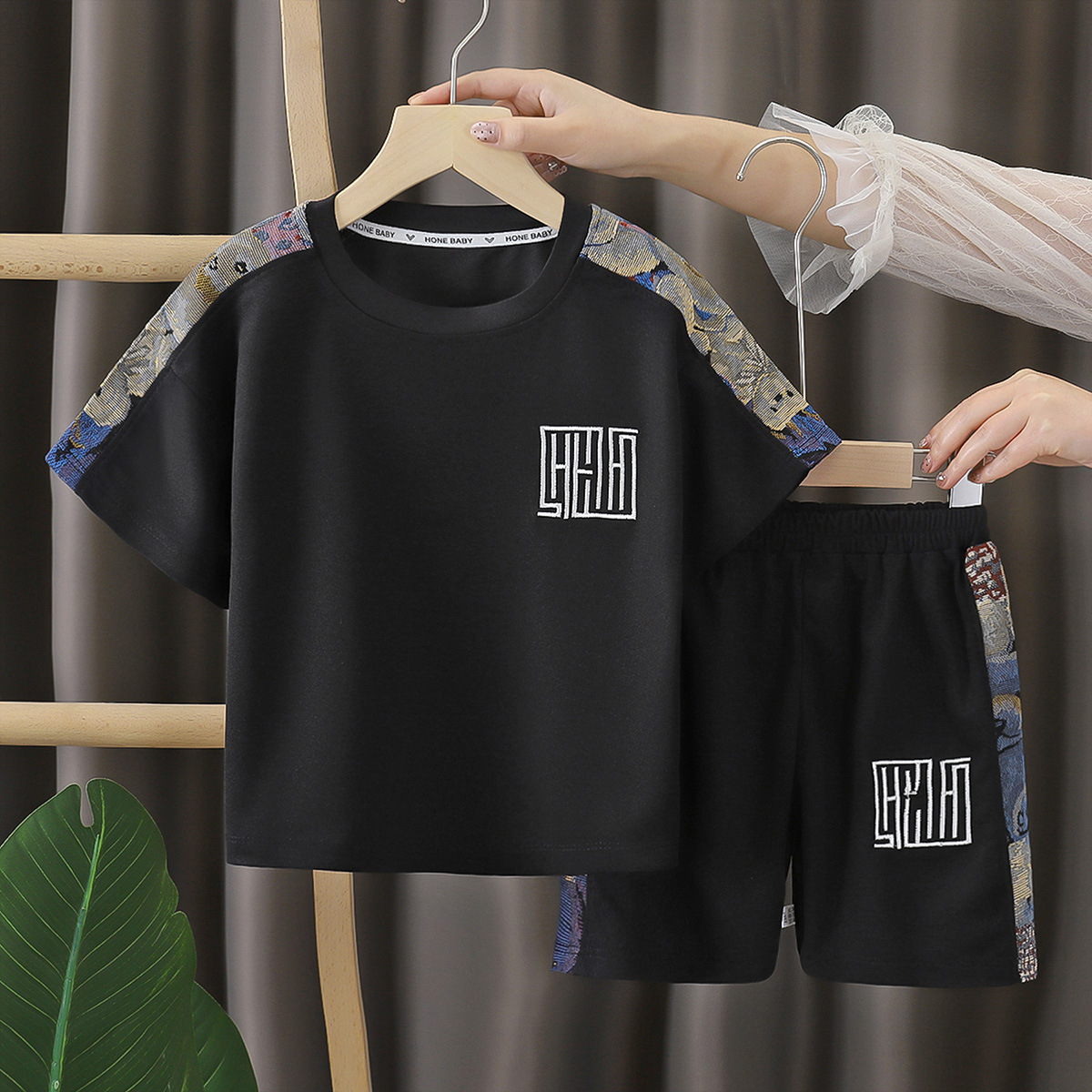 반팔 중국풍 정장 세트, 세련된 남아 의류, 여름 아기 통기성 편안한 투피스 세트, 배색 세련된 반팔스토어 가기