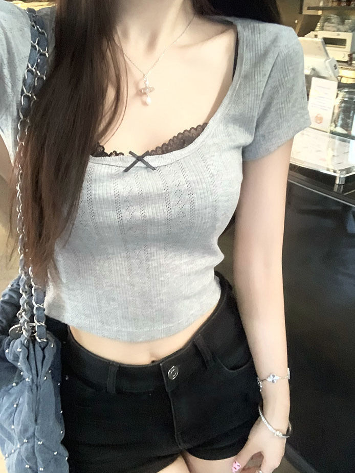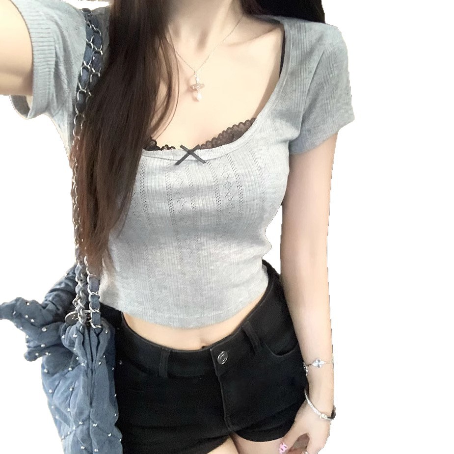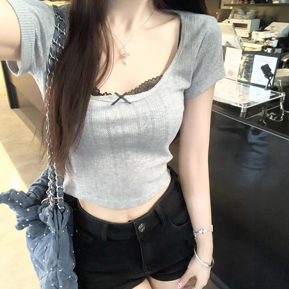 Bm 가짜 투피스 순수 욕망 레이스베이스 셔츠 내부 티셔츠 여성 디자인 센스 반팔 여성용 여름 그린 탑스토어 가기